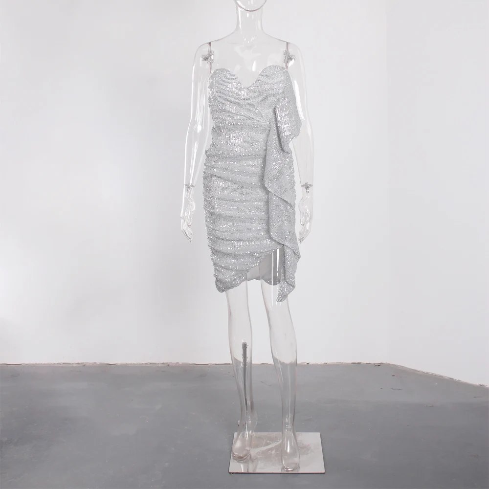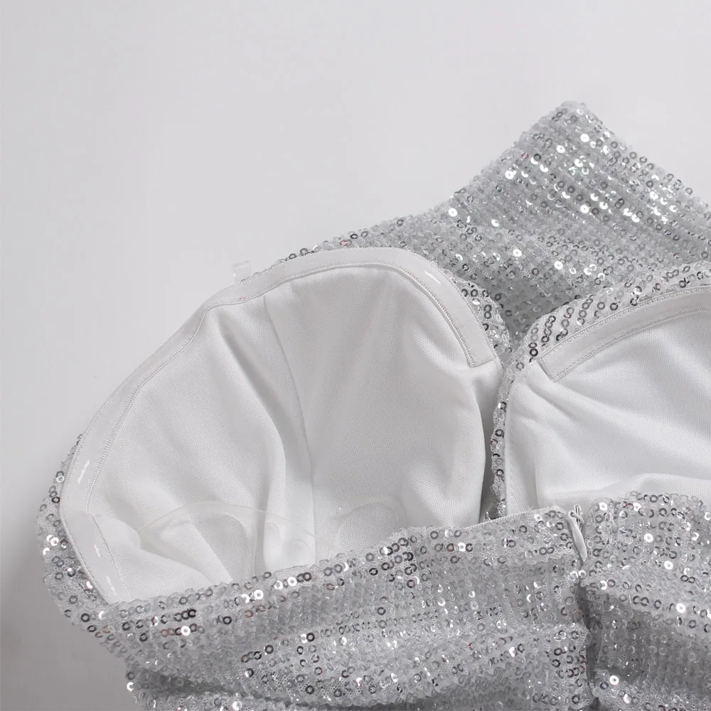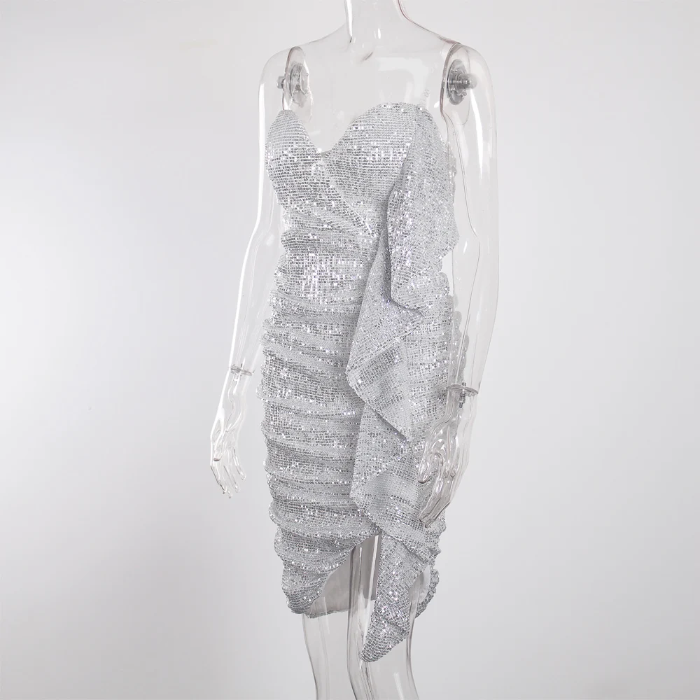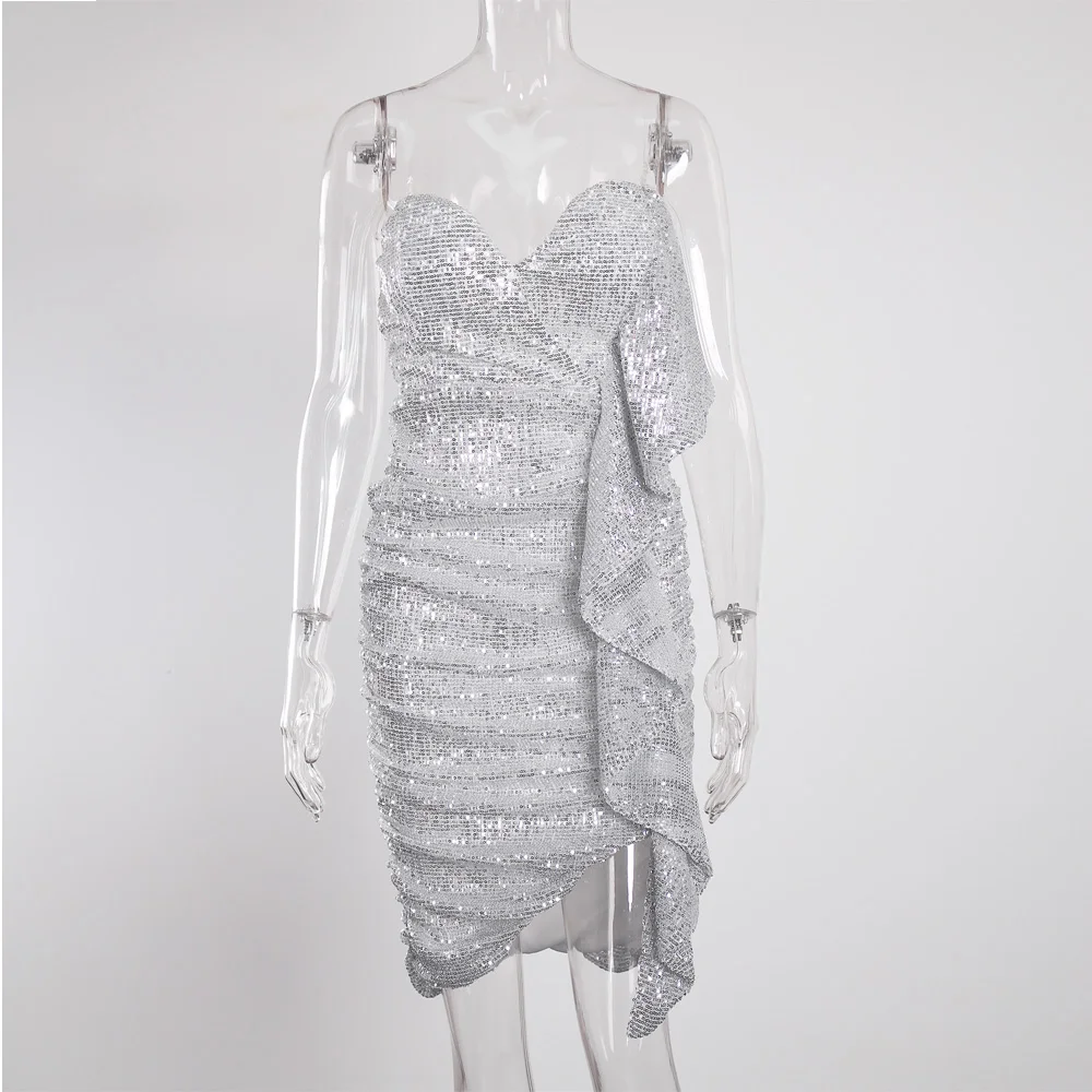 victoria’svogue 2021 Silver Sequined Ruffled Strapless Knee Length Midi Dress Stretch Padded Full Lining Sleeveless Club Night Club Gown