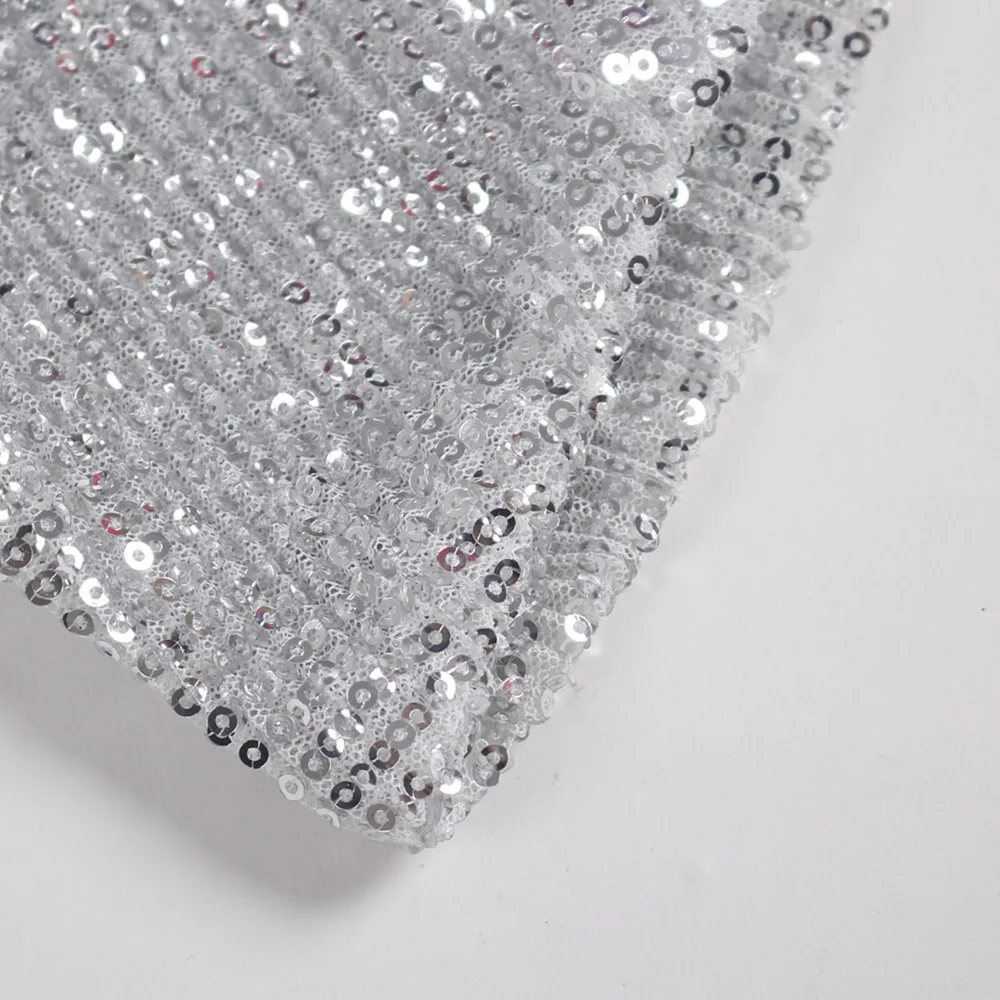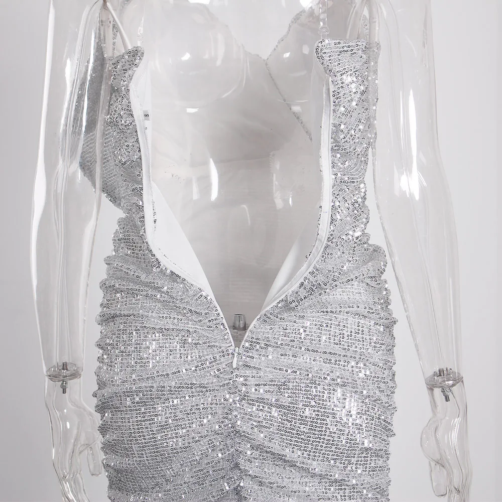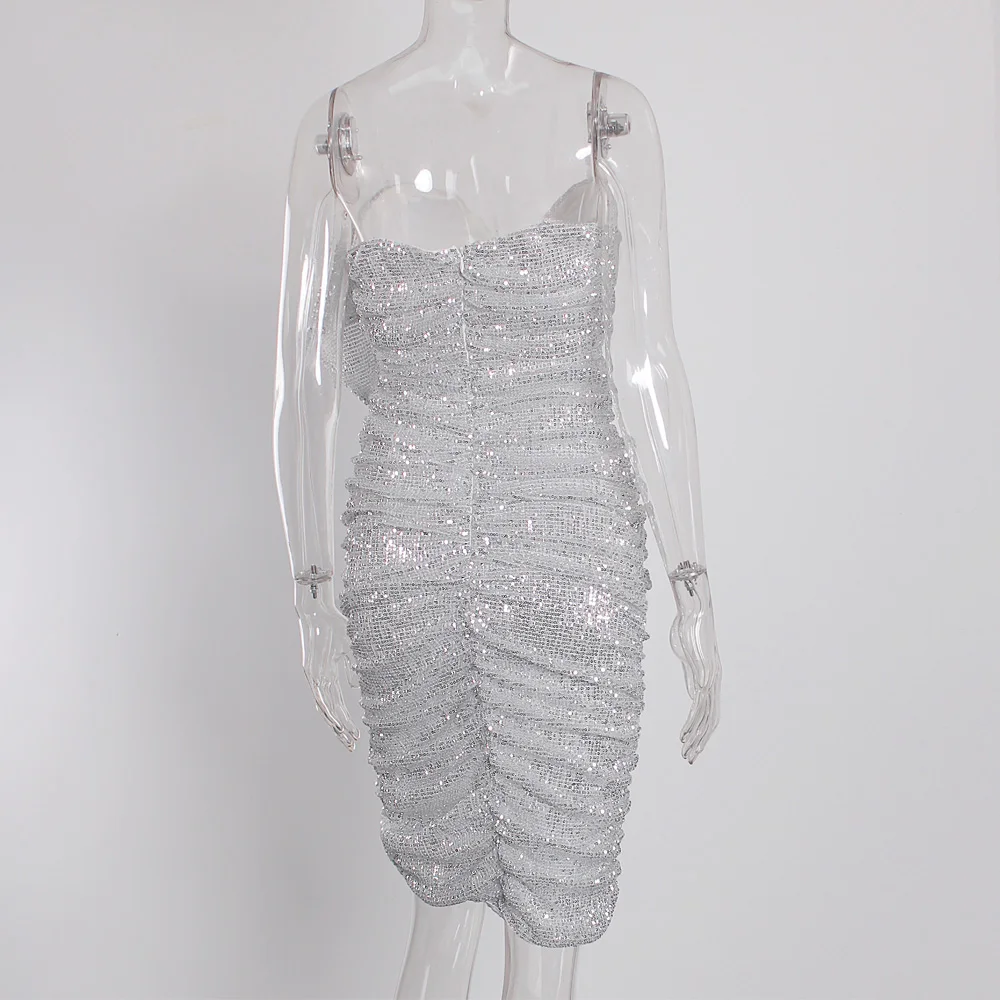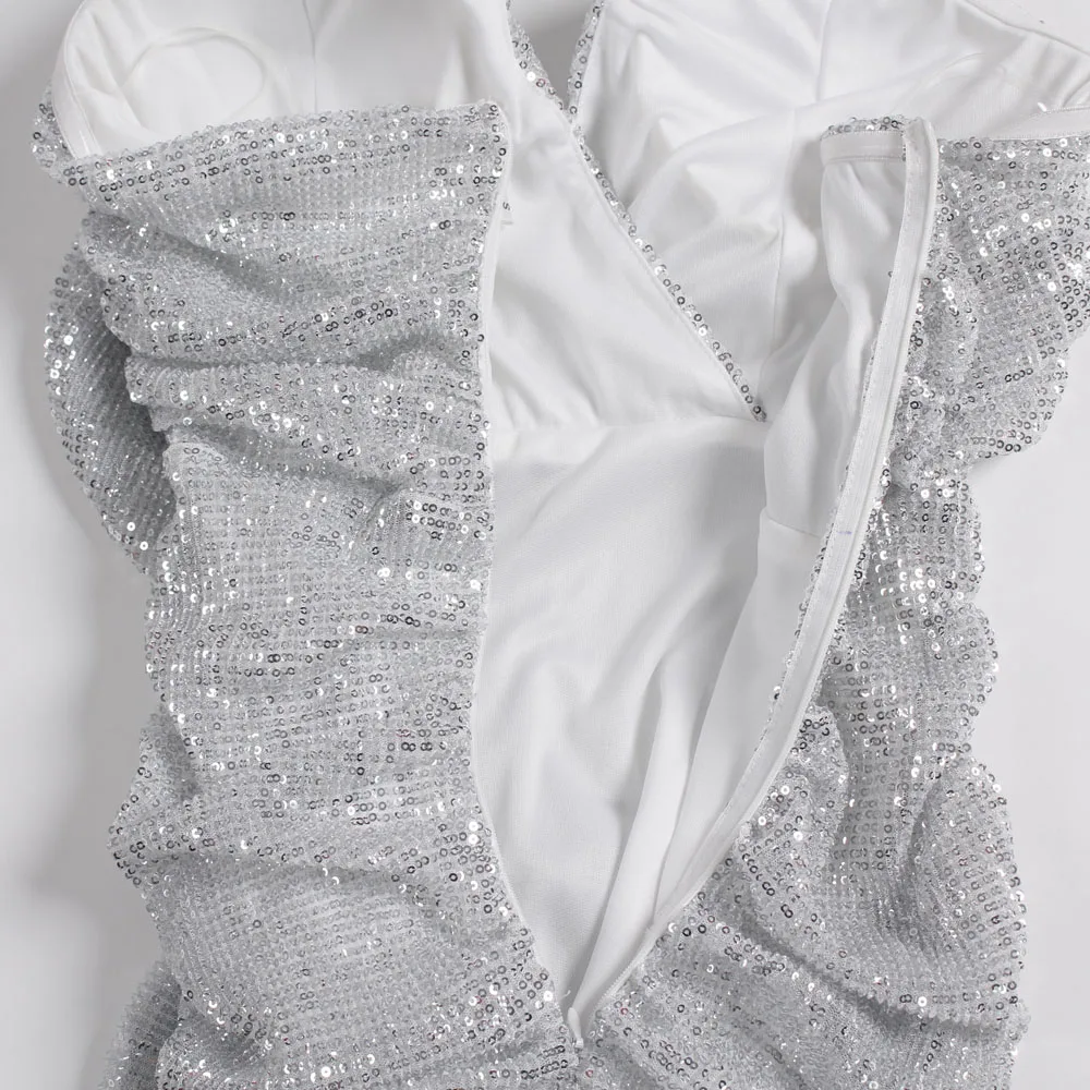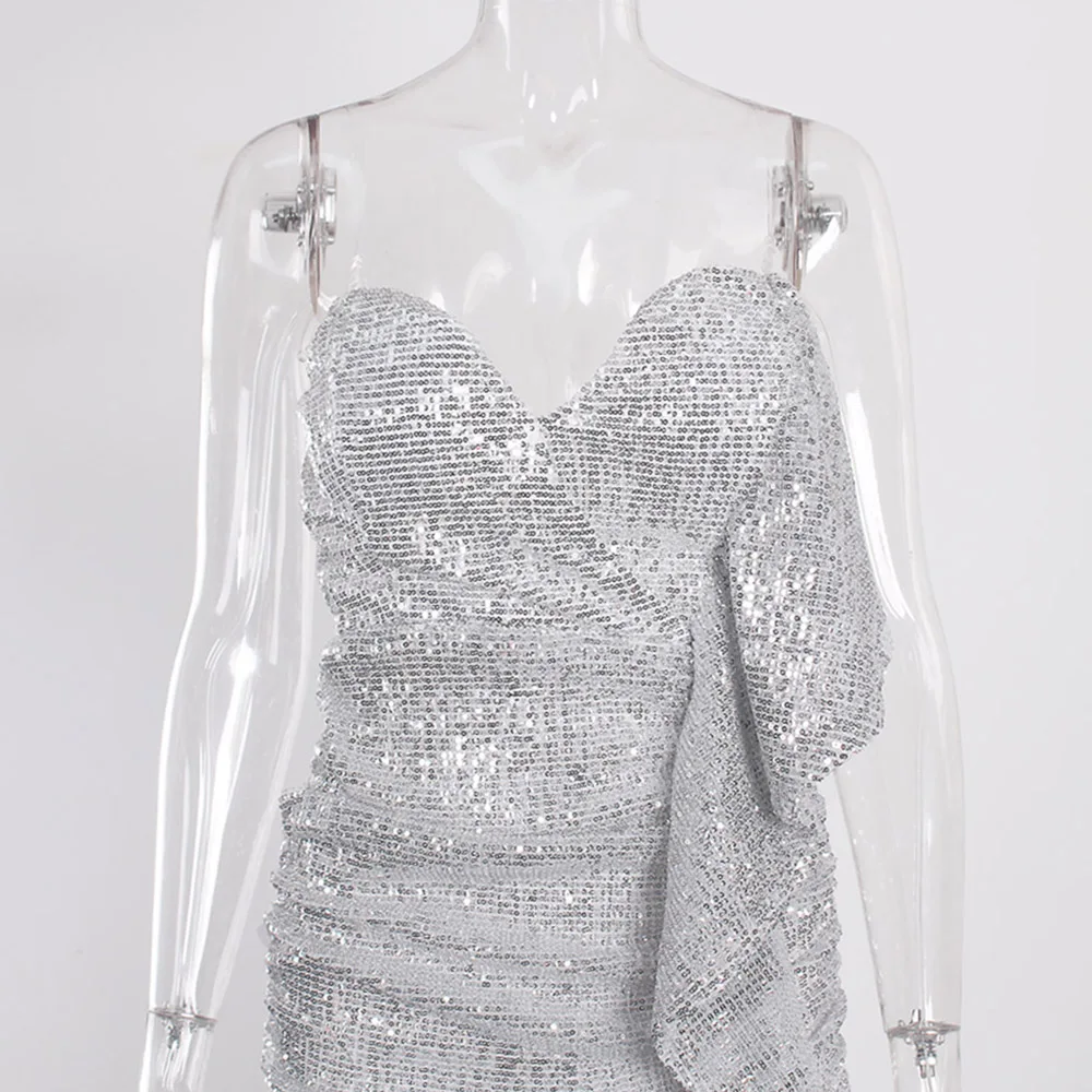 victoria’svogue 2021 Silver Sequined Ruffled Strapless Knee Length Midi Dress Stretch Padded Full Lining Sleeveless Club Night Club Gown