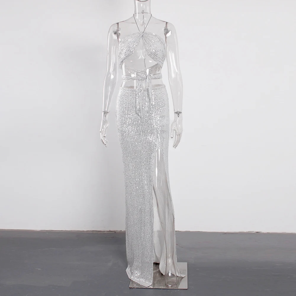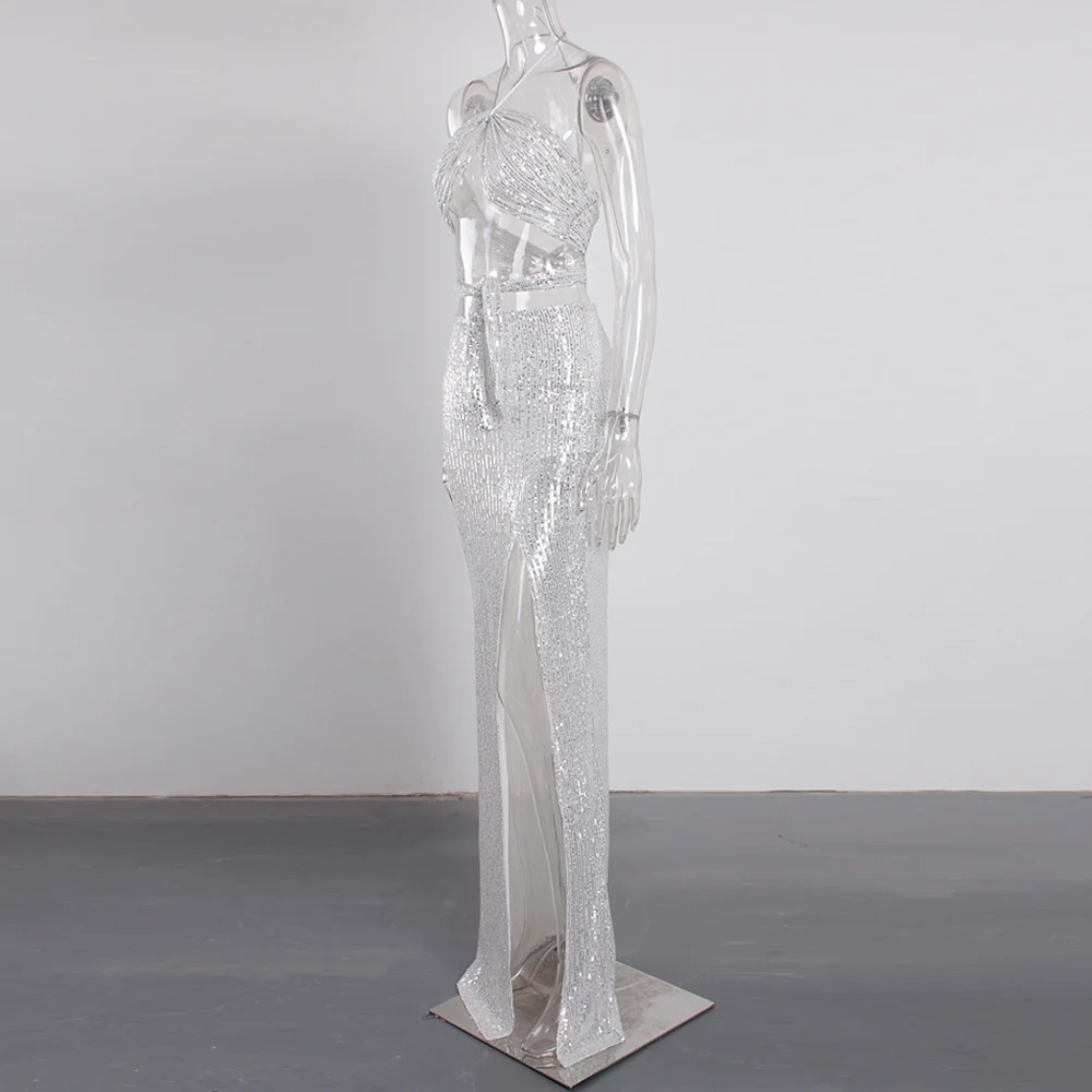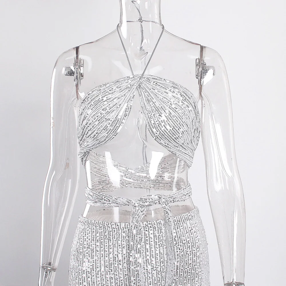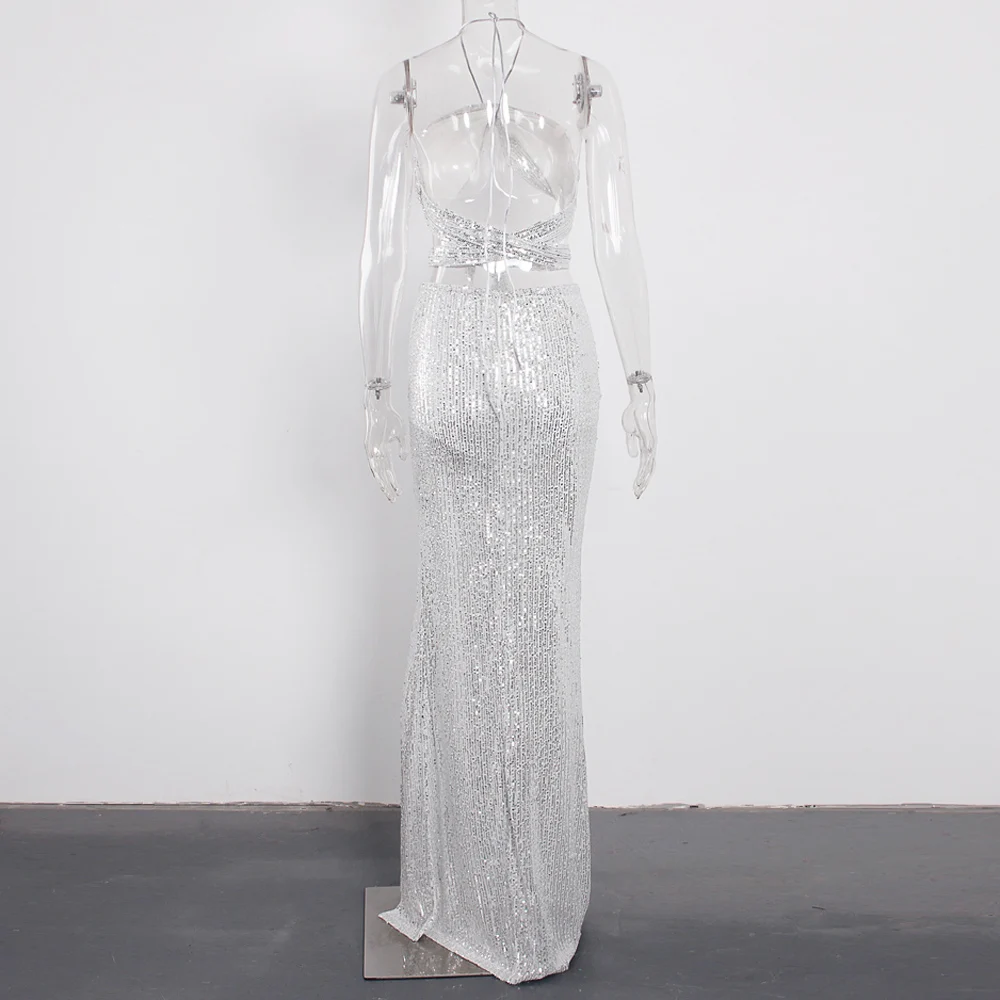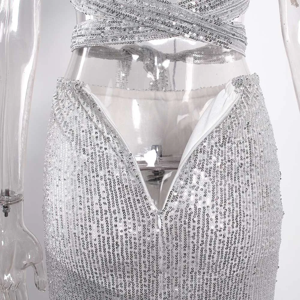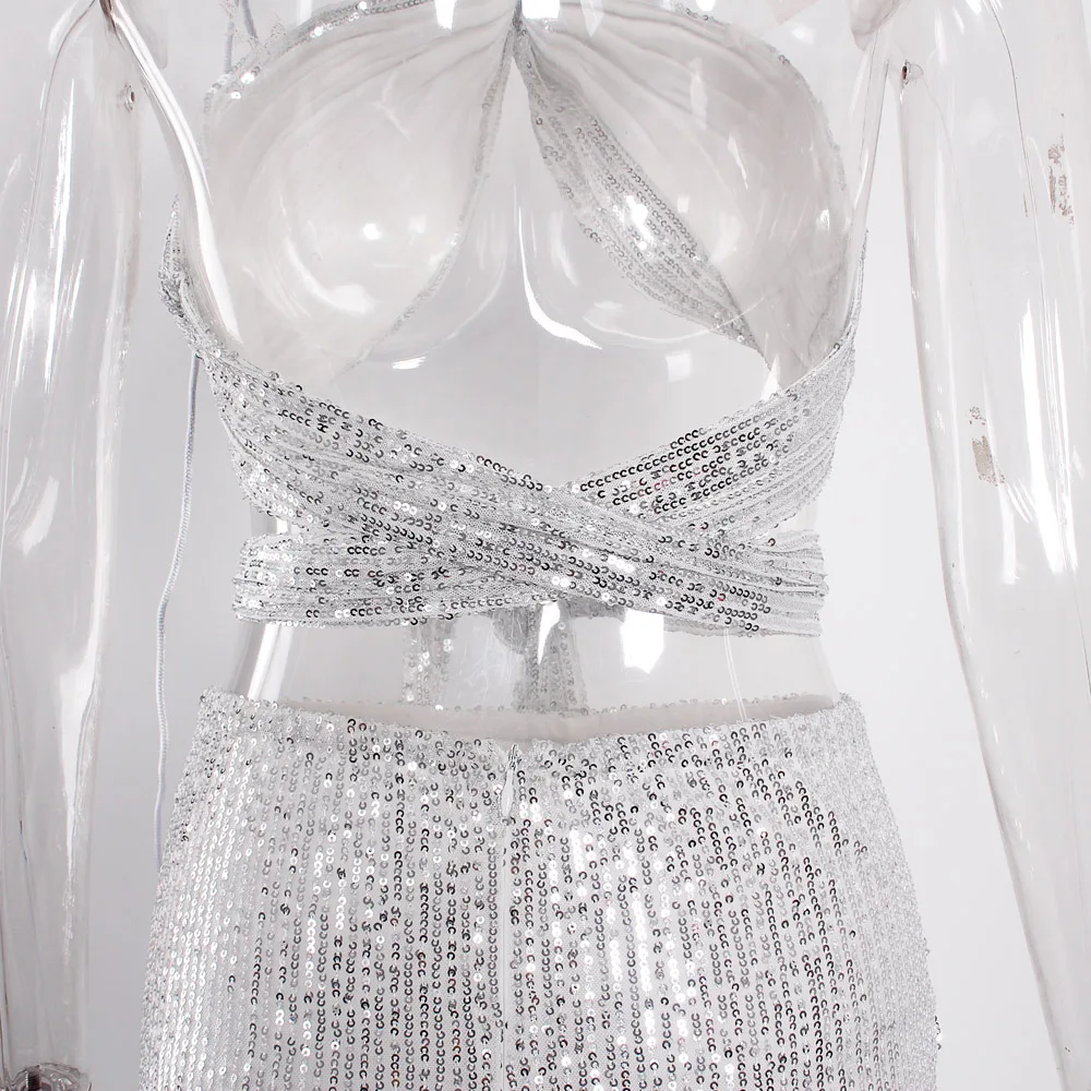 victoria’svogue 2021 Silver Sequined Sexy Women’s Sets Hollow Out Halter Later Crop Tops Split Side Backless Sleeveless Summer Night Club Party Wear