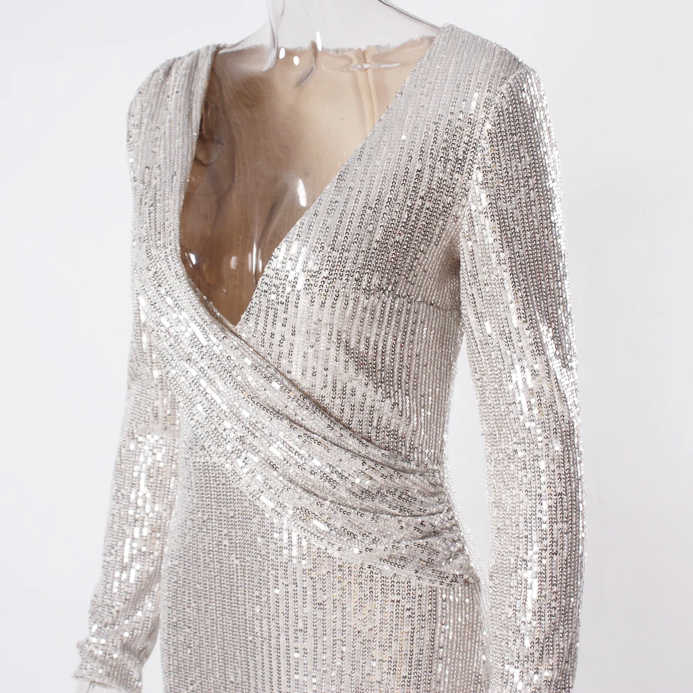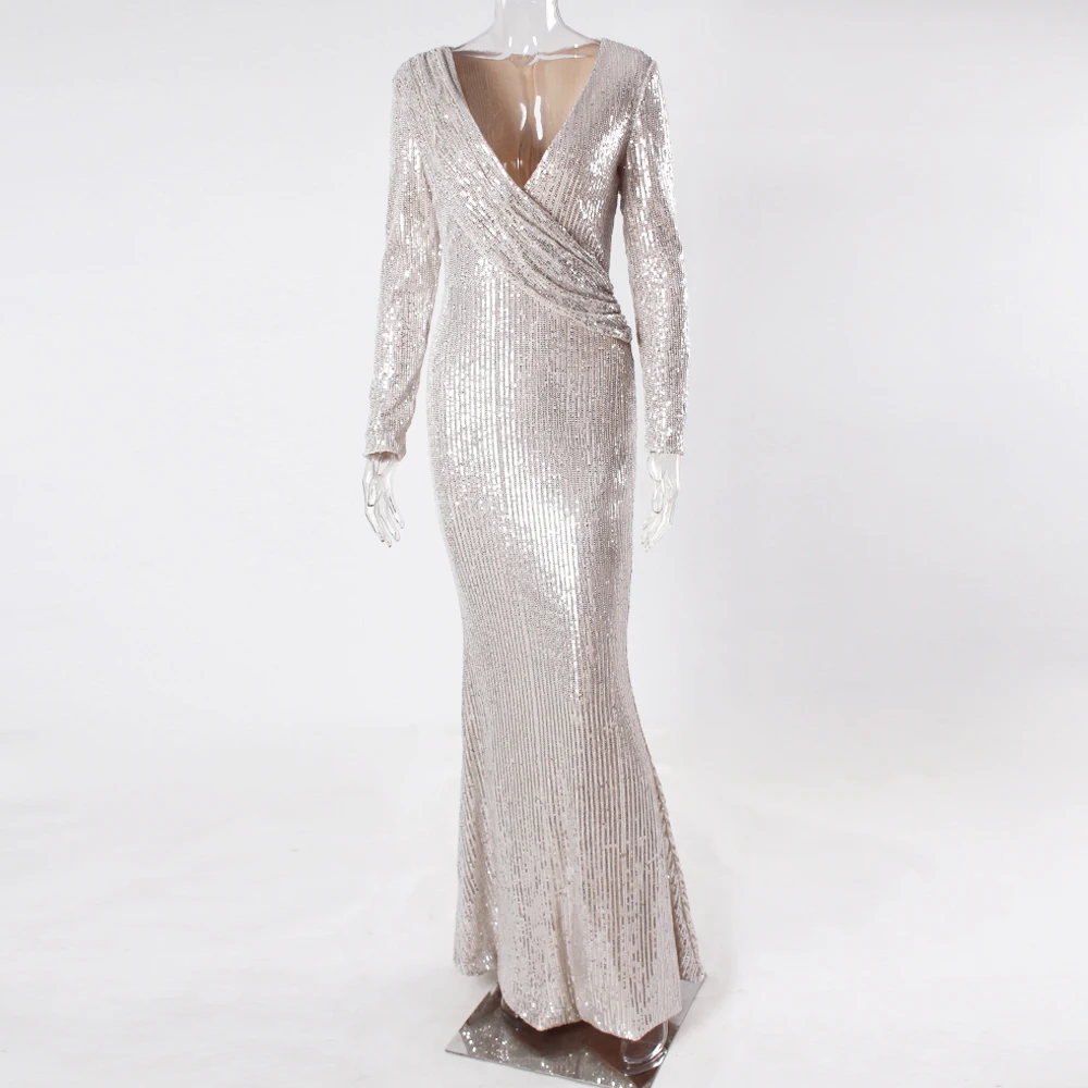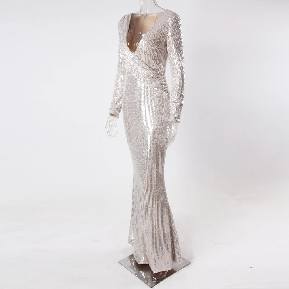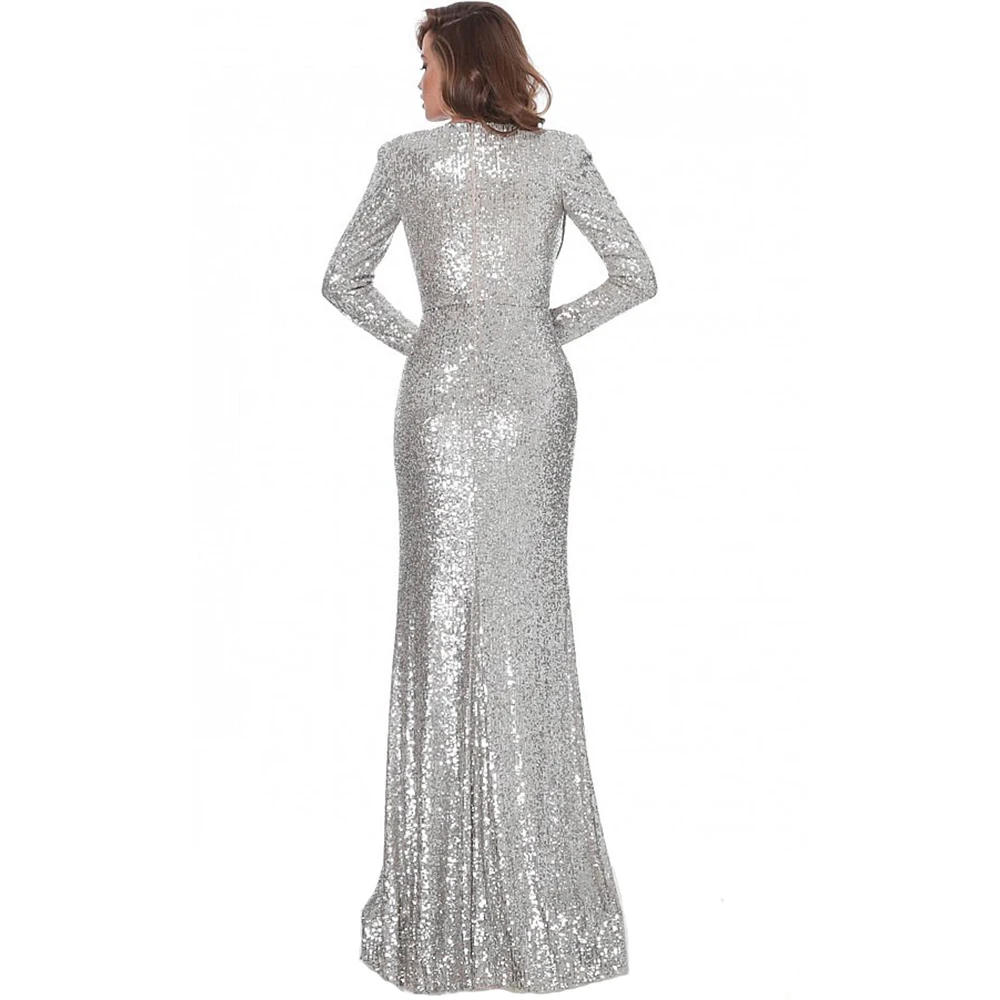 victoria’svogue 2021 Silver V Neck Full sleeved Autumn Winter Evening Party Dress Gown Sequined Stretchy Long Maxi Dress