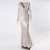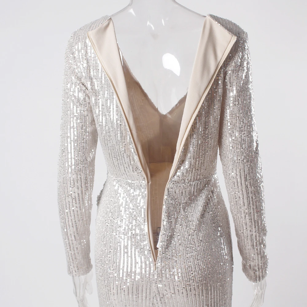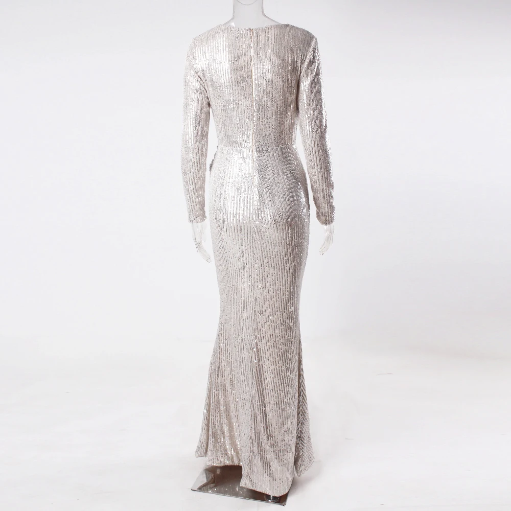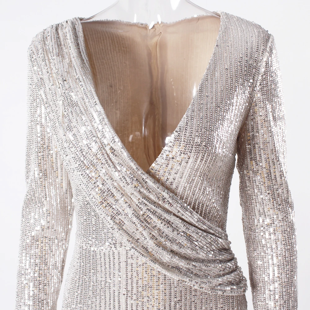 victoria’svogue 2021 Silver V Neck Full sleeved Autumn Winter Evening Party Dress Gown Sequined Stretchy Long Maxi Dress