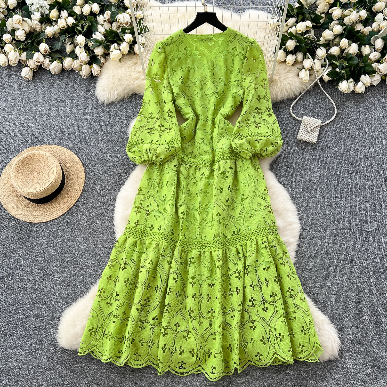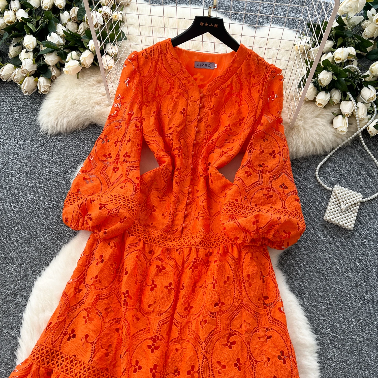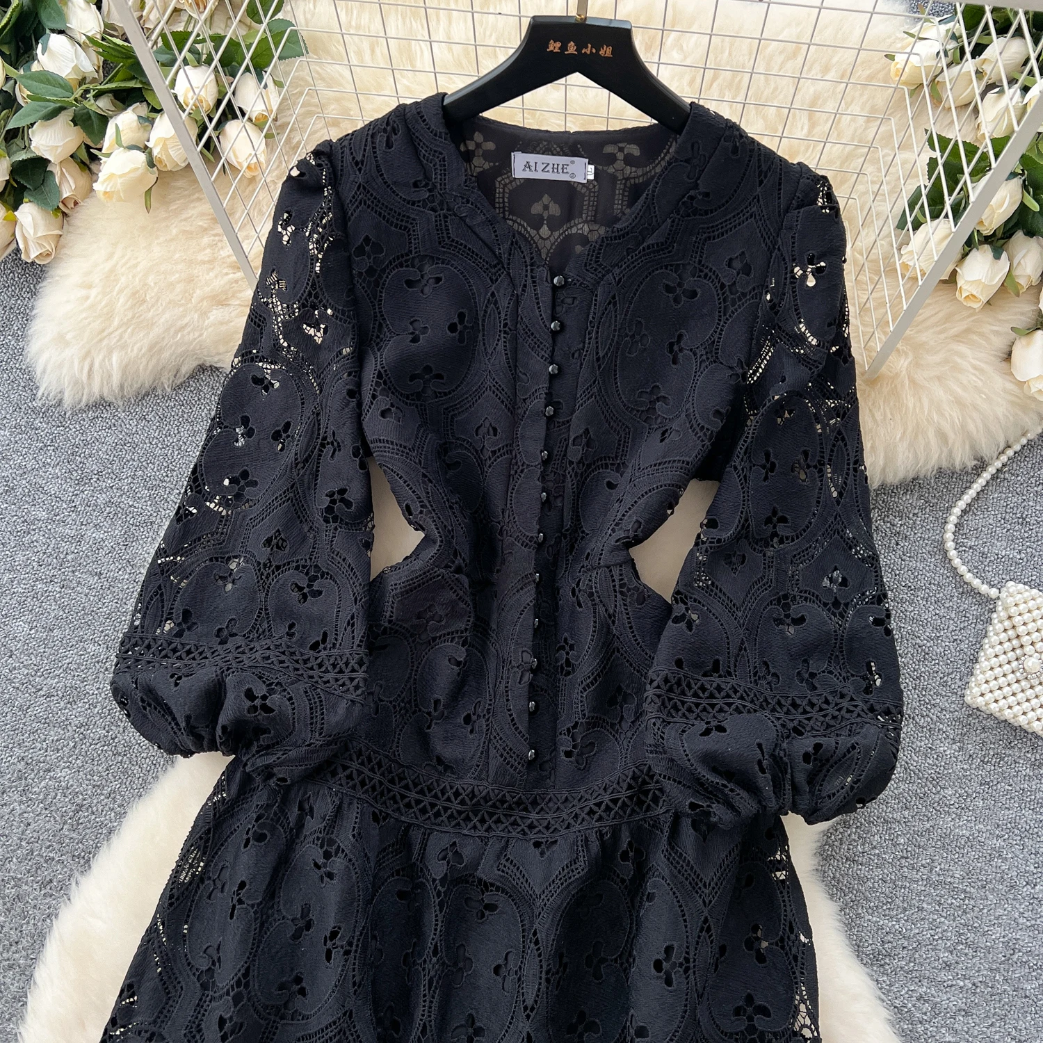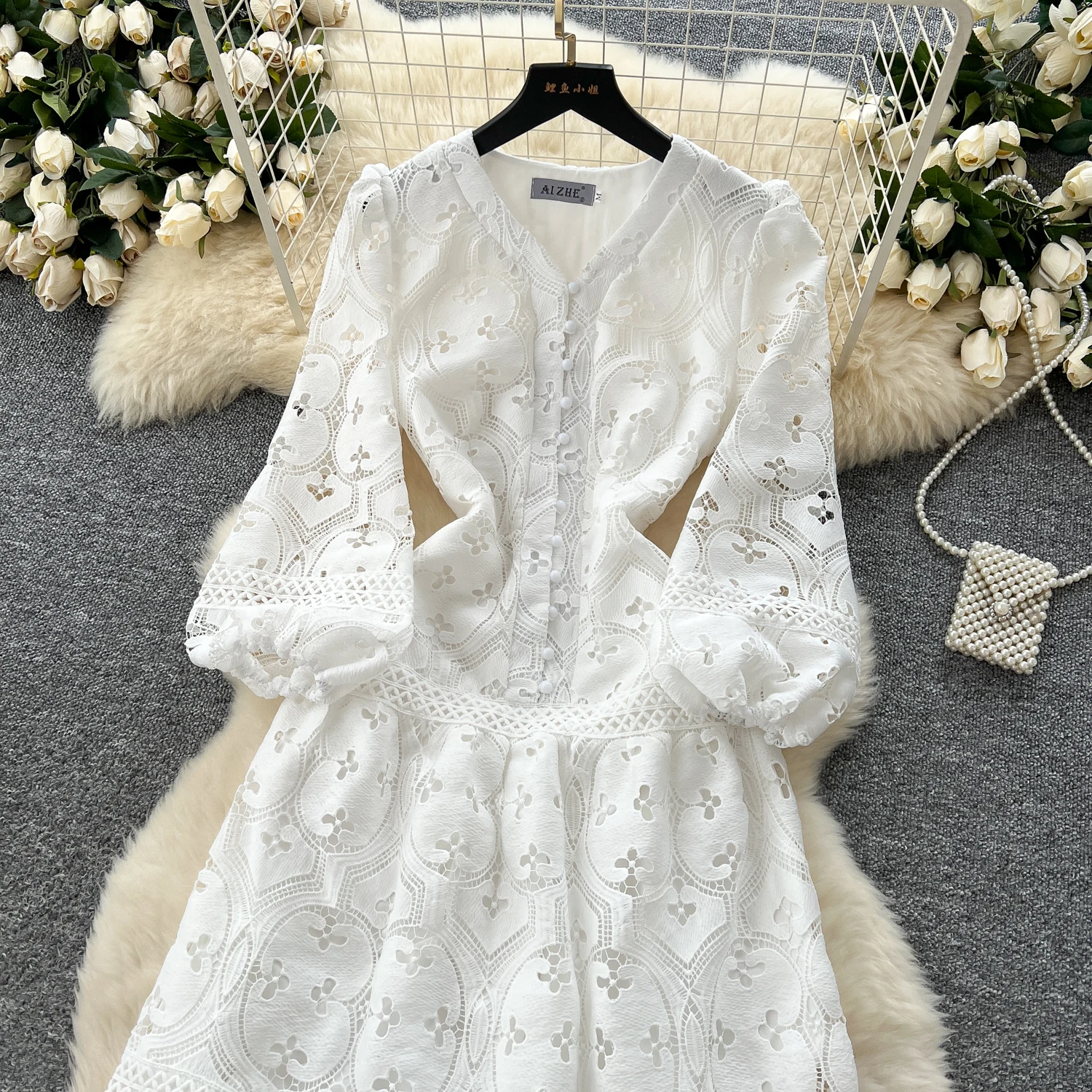 Victoria’s Vogue French Vacation Fashion Dress Women Buttons Hook Flower Hollow Out Design 2025 High Quality Lace Ruffles Long Dress