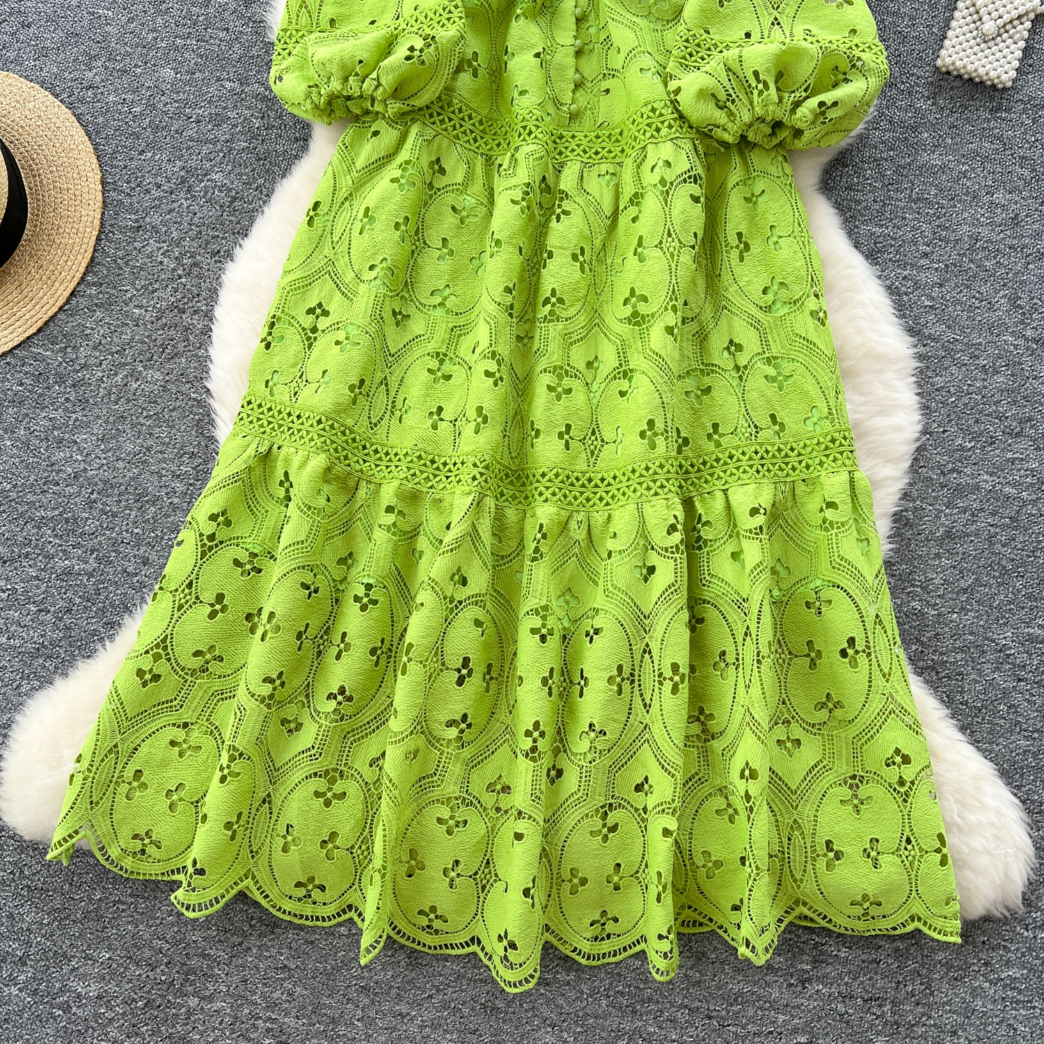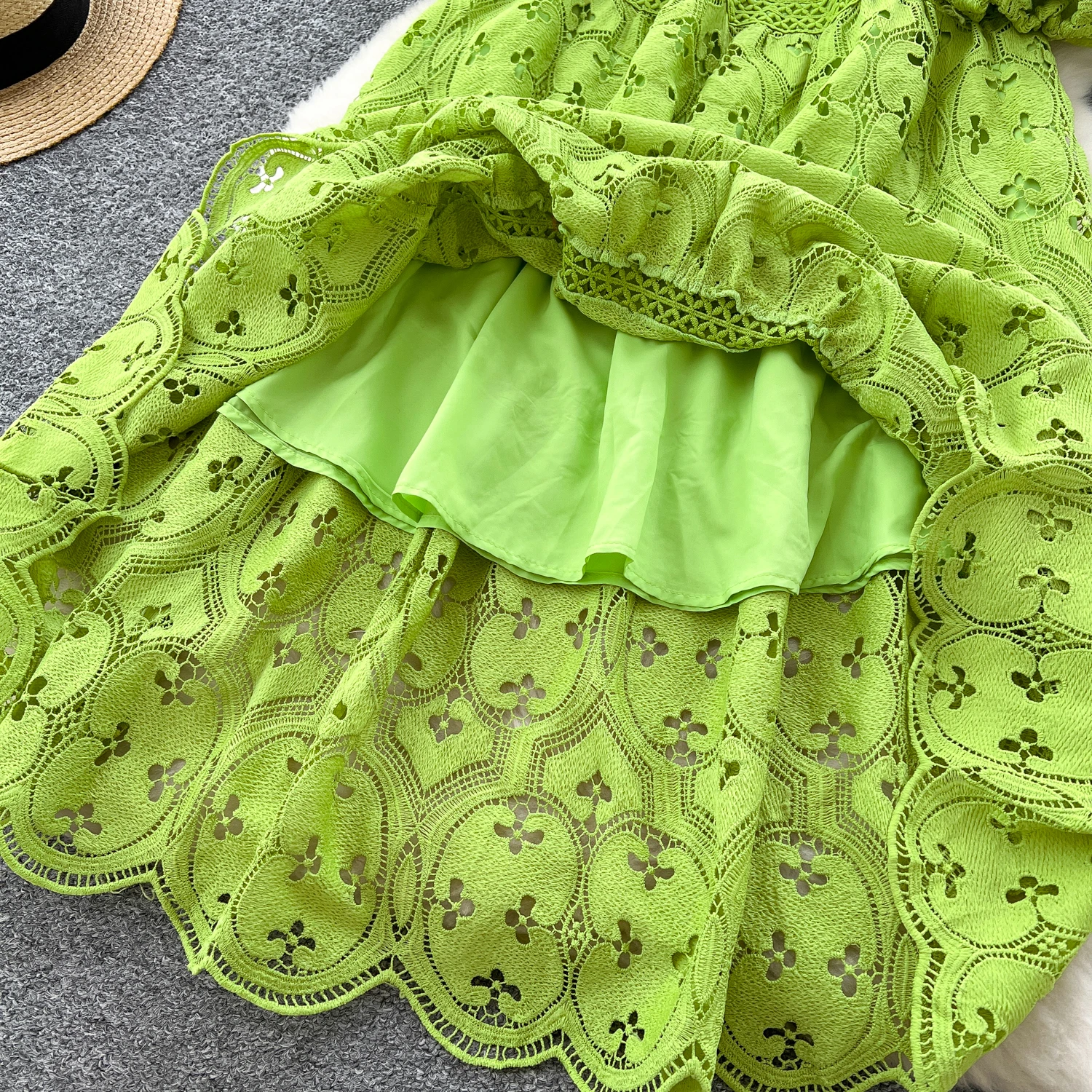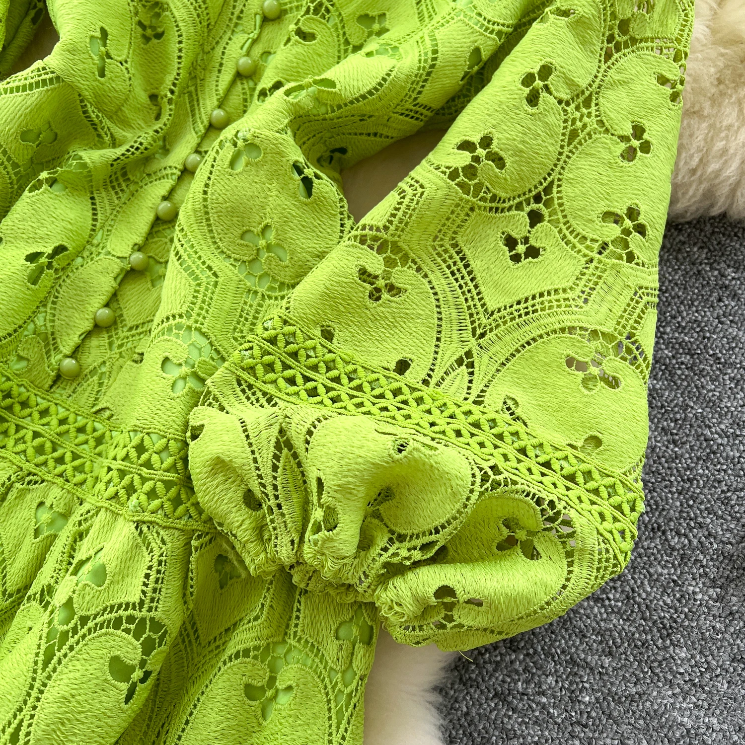 Victoria’s Vogue French Vacation Fashion Dress Women Buttons Hook Flower Hollow Out Design 2025 High Quality Lace Ruffles Long Dress