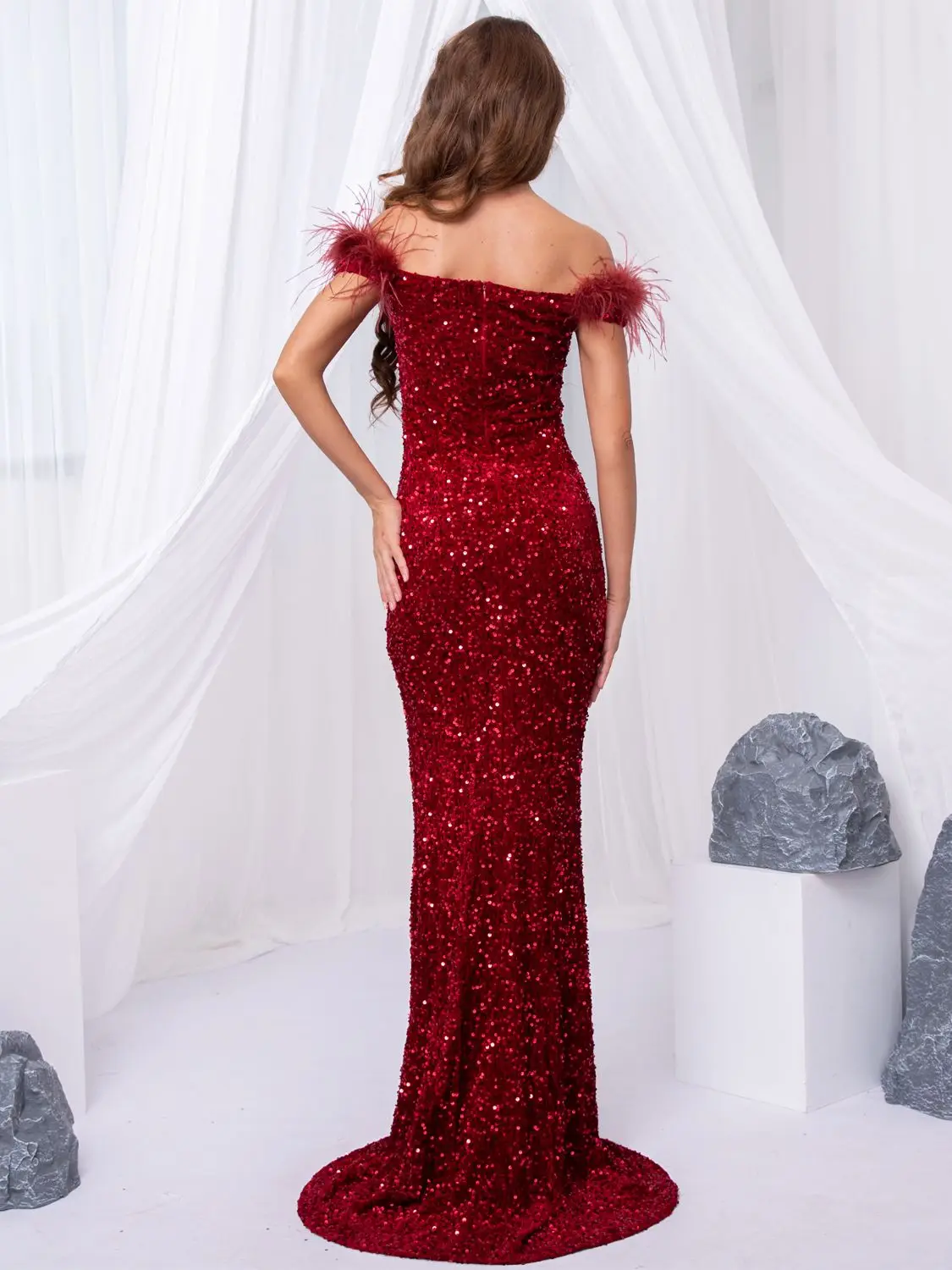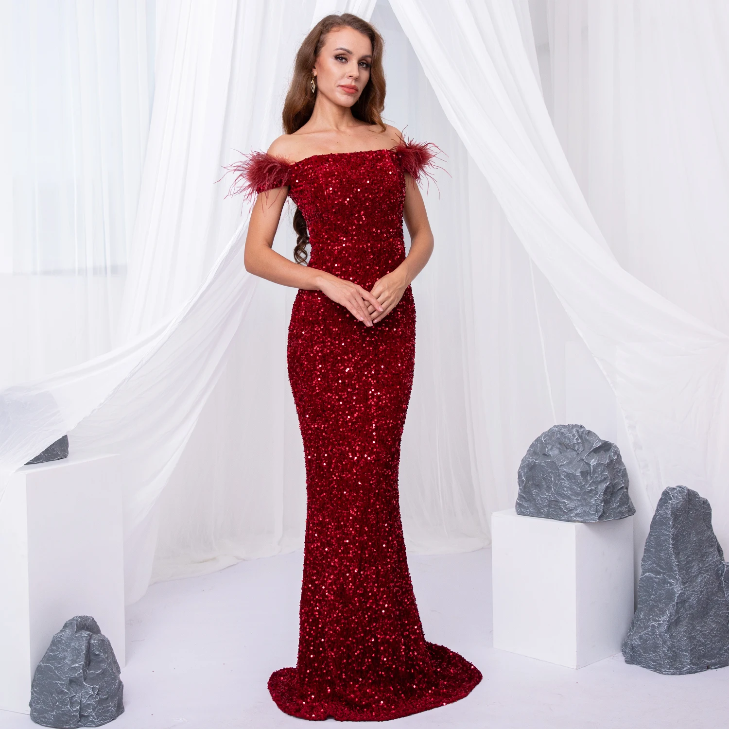 victoria’svogue 2021 Slash Neck Sparkle Stretch Sequin Long Party Dress Feather Off the Shoulder Sleeveless Floor Length Evening Gown Red Sky Blue