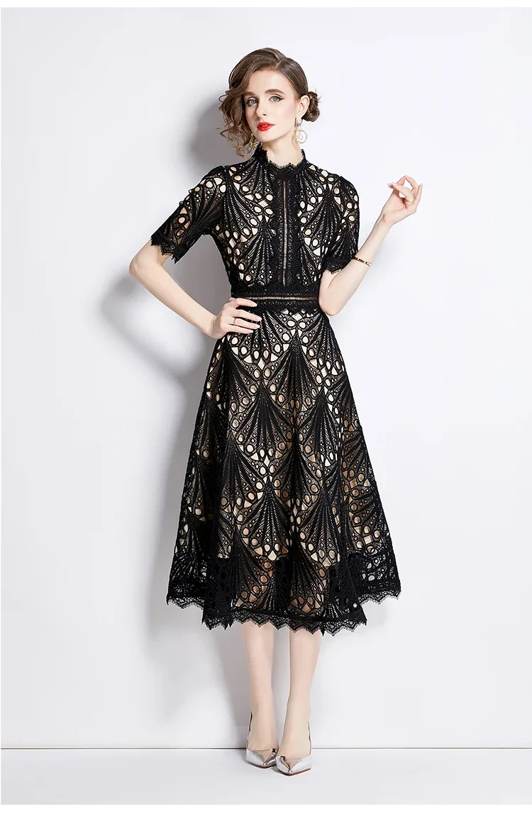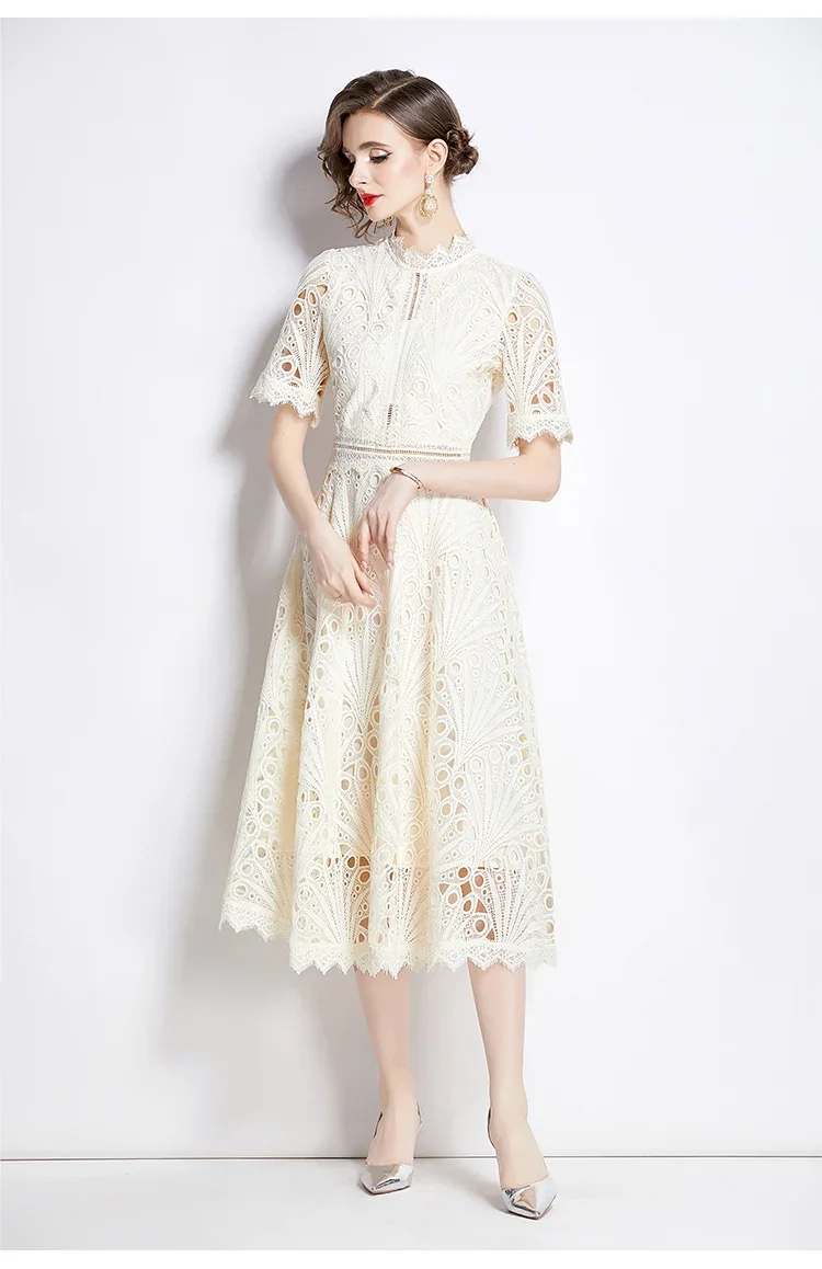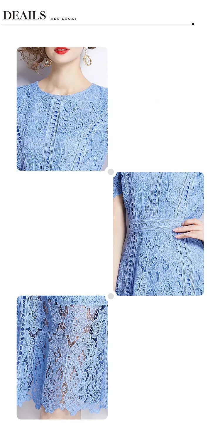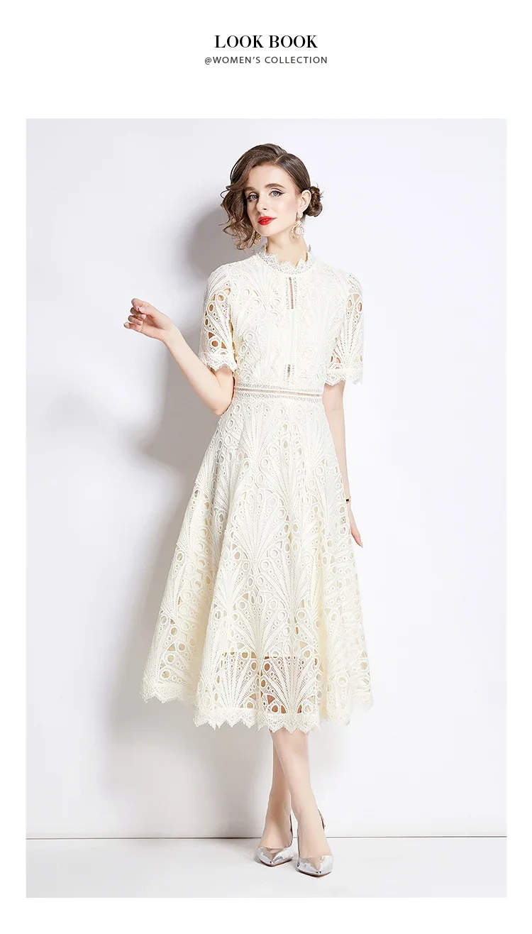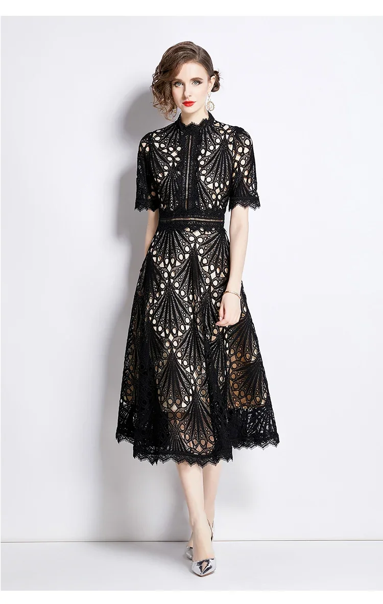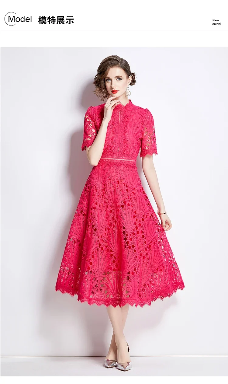 Victoria’s Vogue Vintage High-End O-Neck Short Sleeve Lace Hollow Out Dress For Women’s Summer Slim Elegant Long Dress Female Clothing