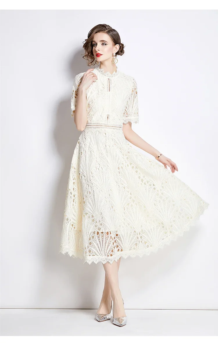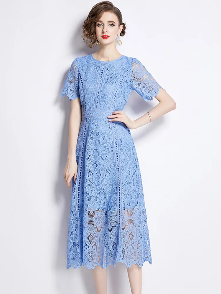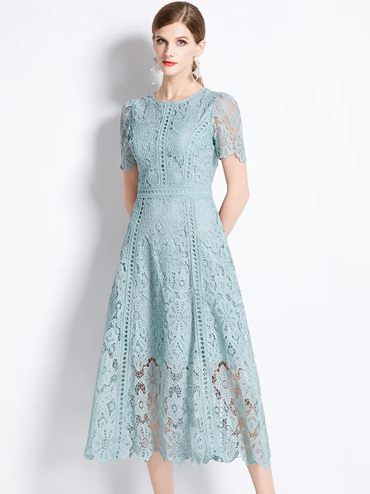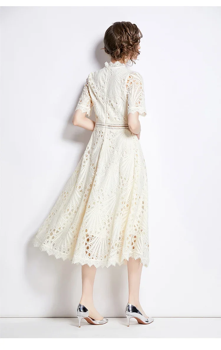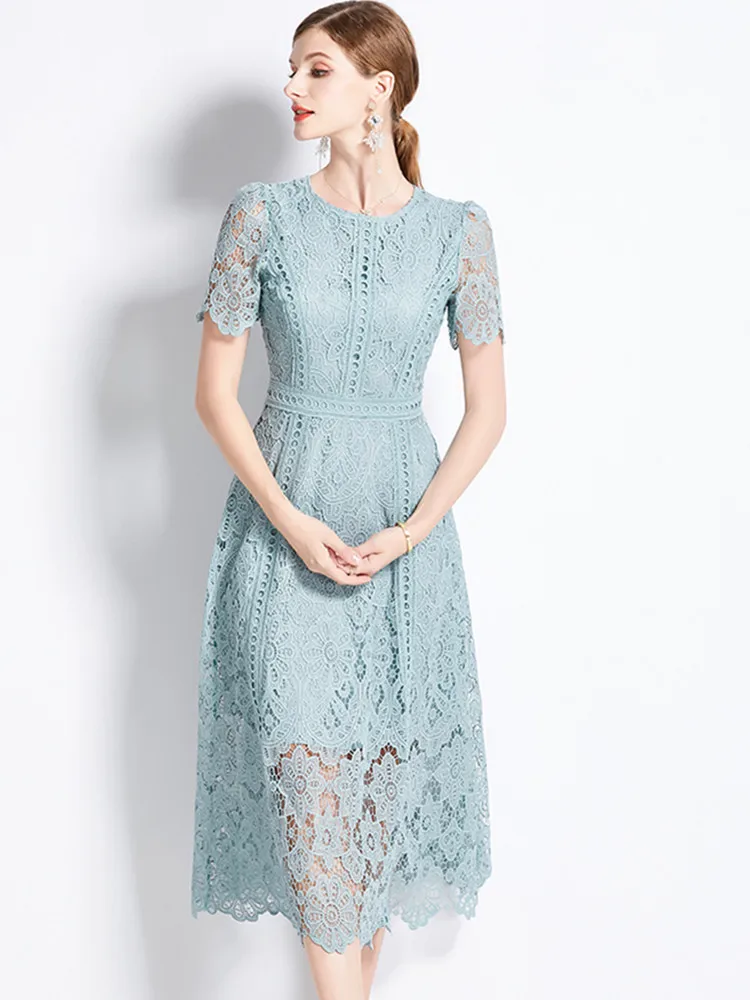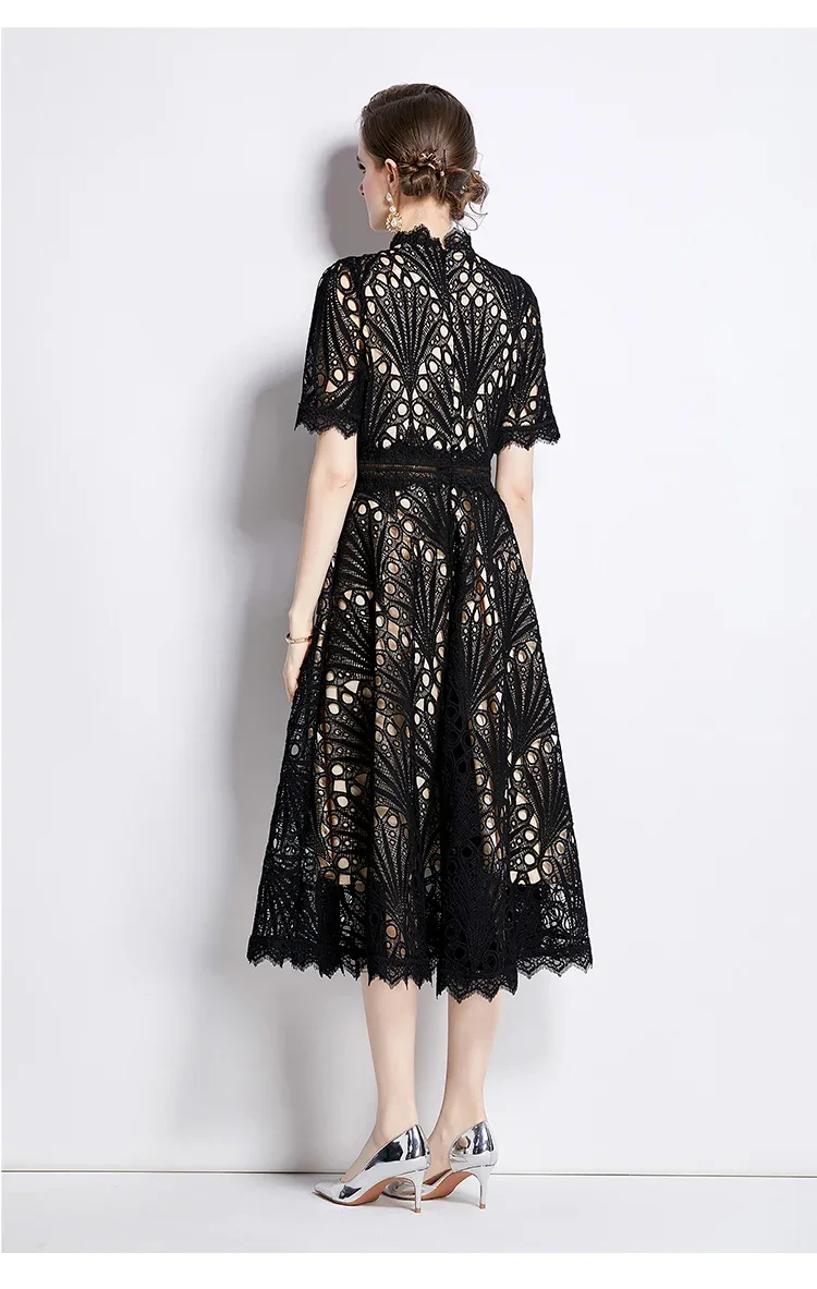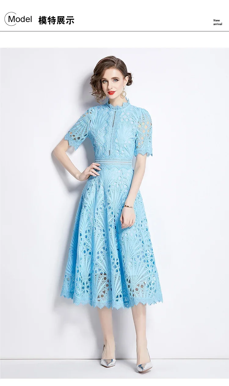 Victoria’s Vogue Vintage High-End O-Neck Short Sleeve Lace Hollow Out Dress For Women’s Summer Slim Elegant Long Dress Female Clothing