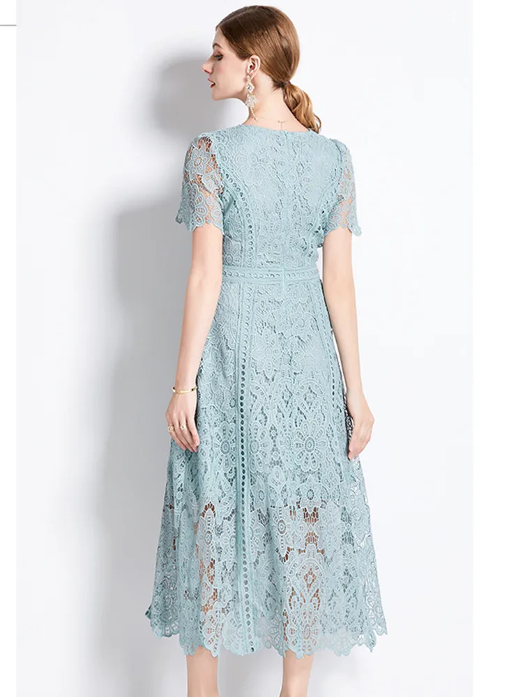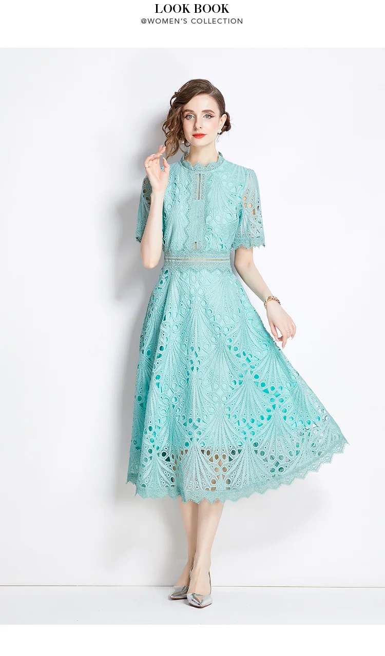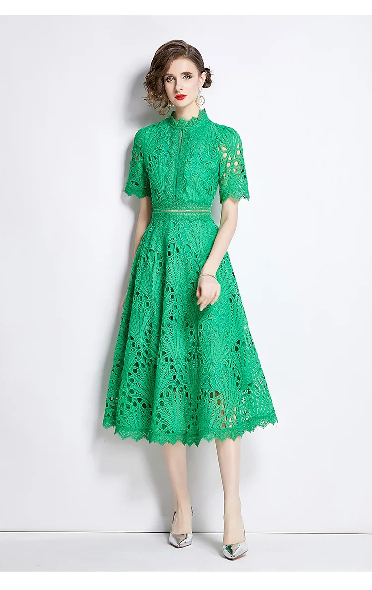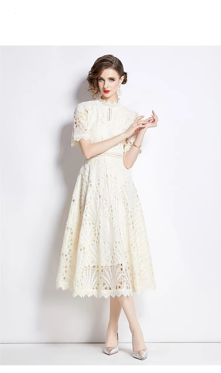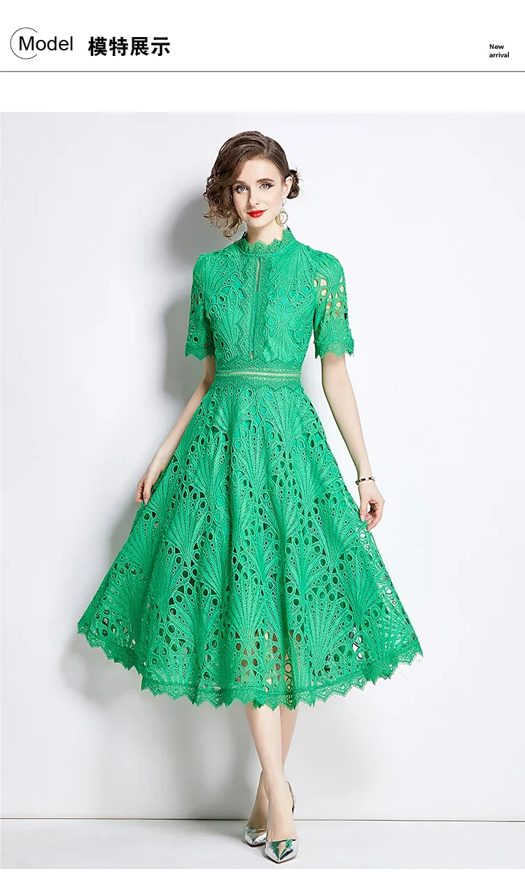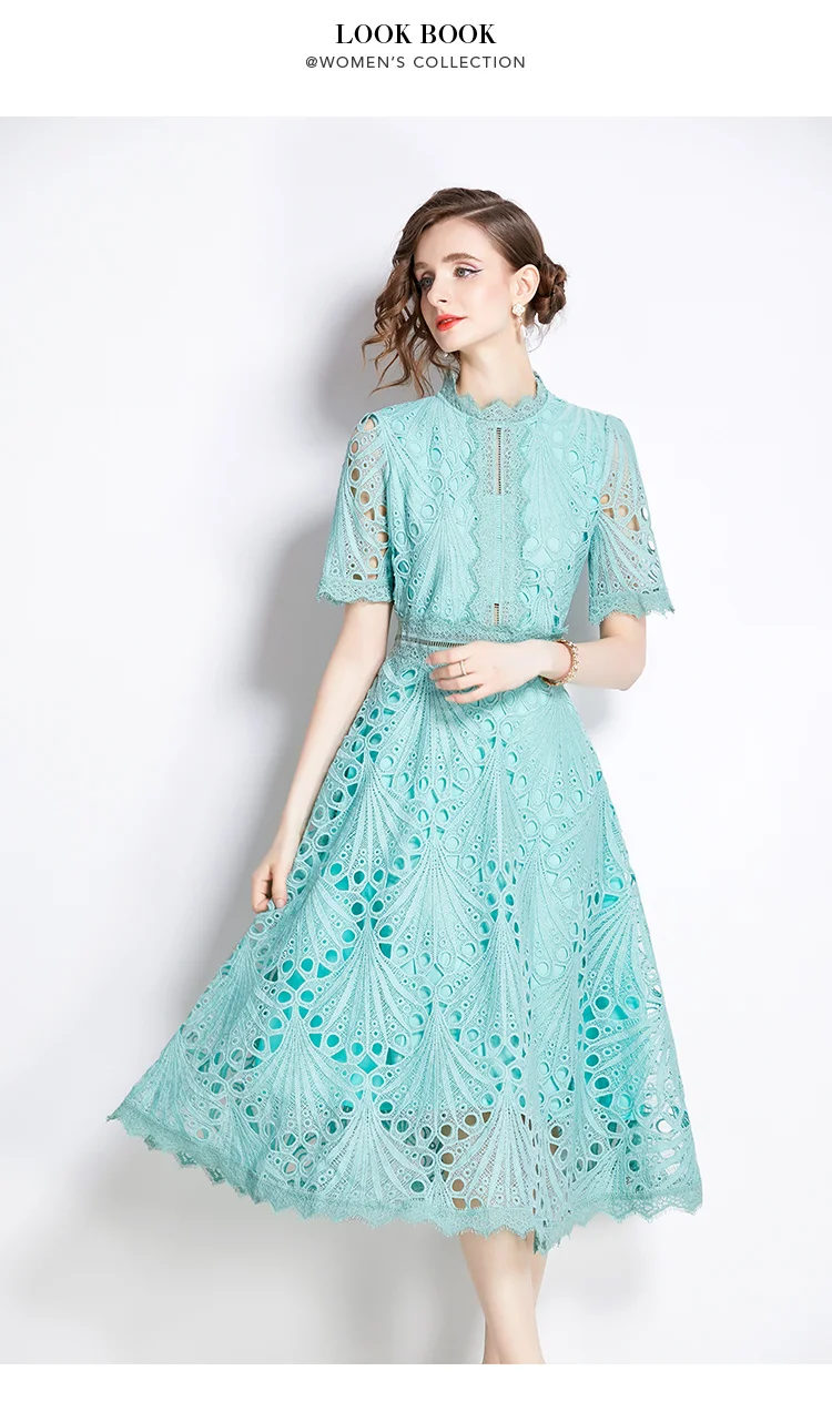 Victoria’s Vogue Vintage High-End O-Neck Short Sleeve Lace Hollow Out Dress For Women’s Summer Slim Elegant Long Dress Female Clothing