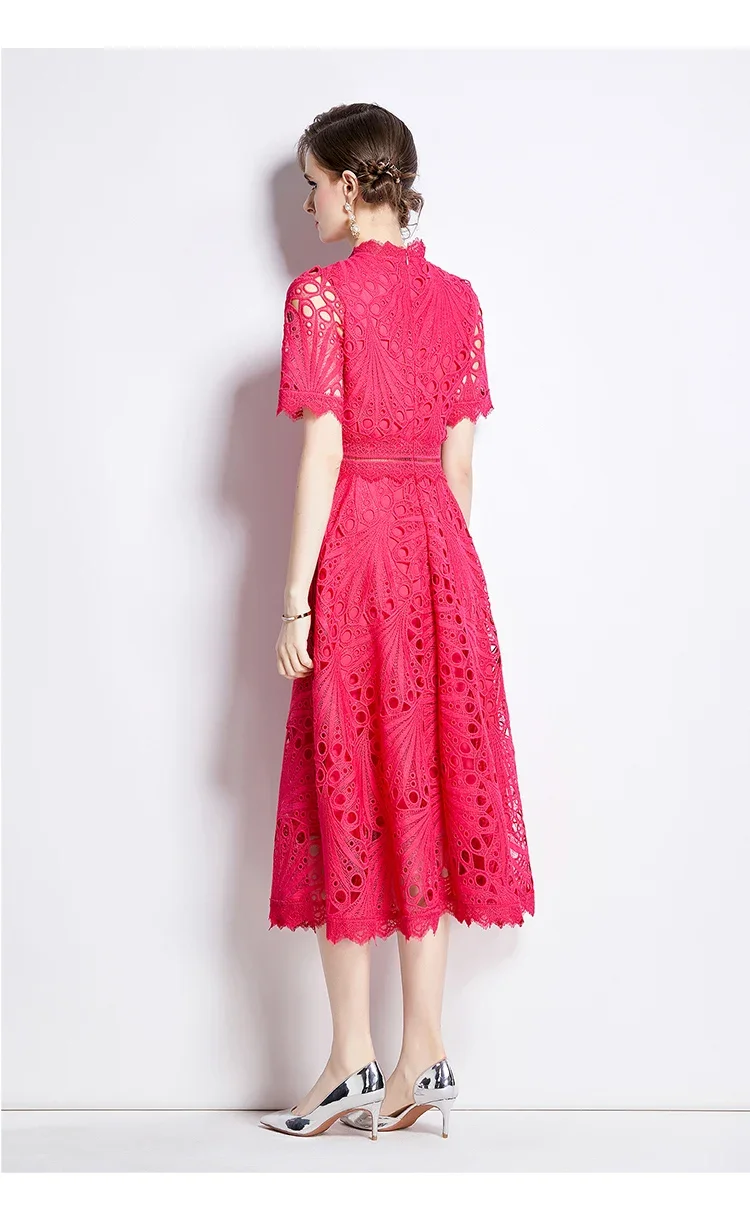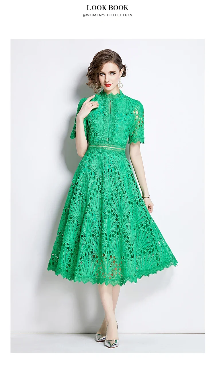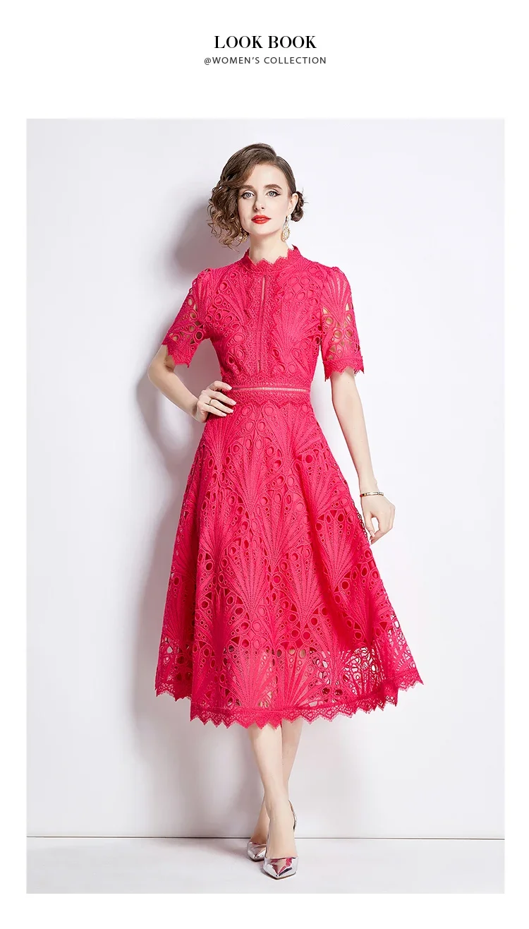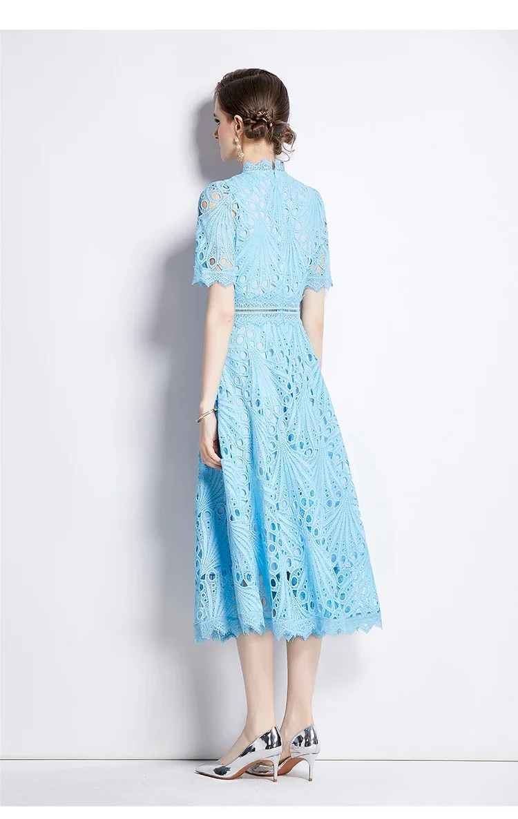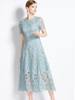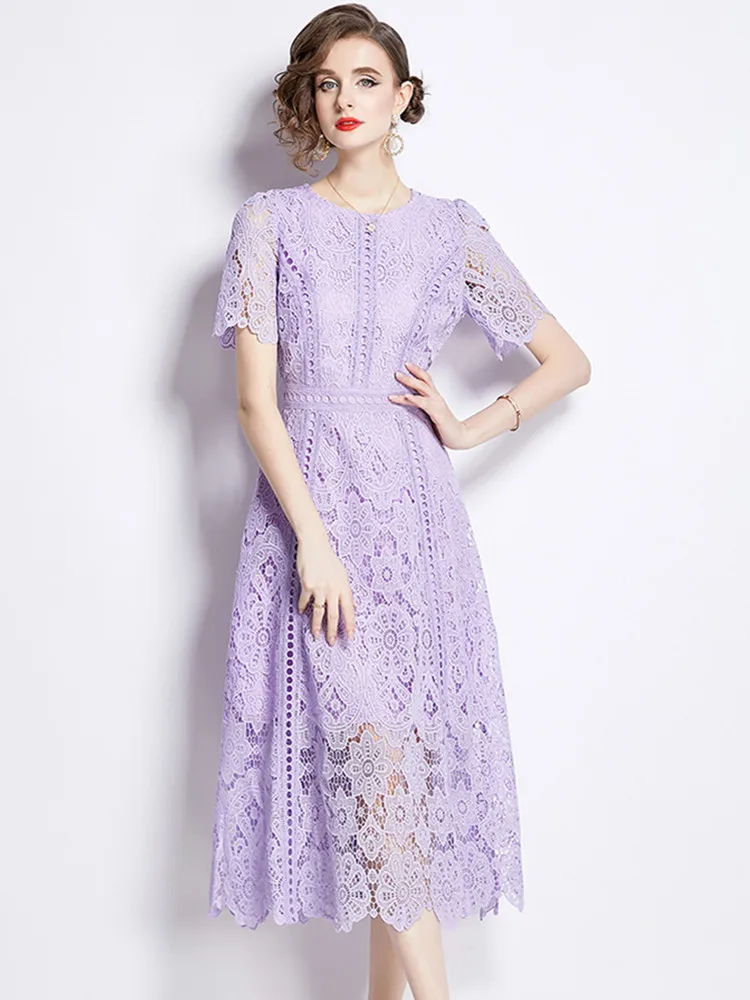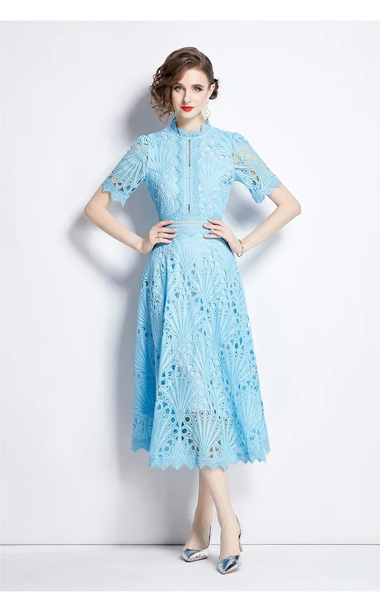 Victoria’s Vogue Vintage High-End O-Neck Short Sleeve Lace Hollow Out Dress For Women’s Summer Slim Elegant Long Dress Female Clothing