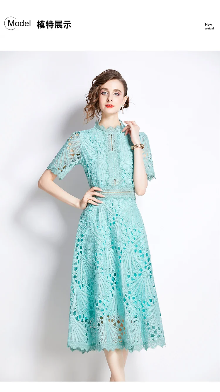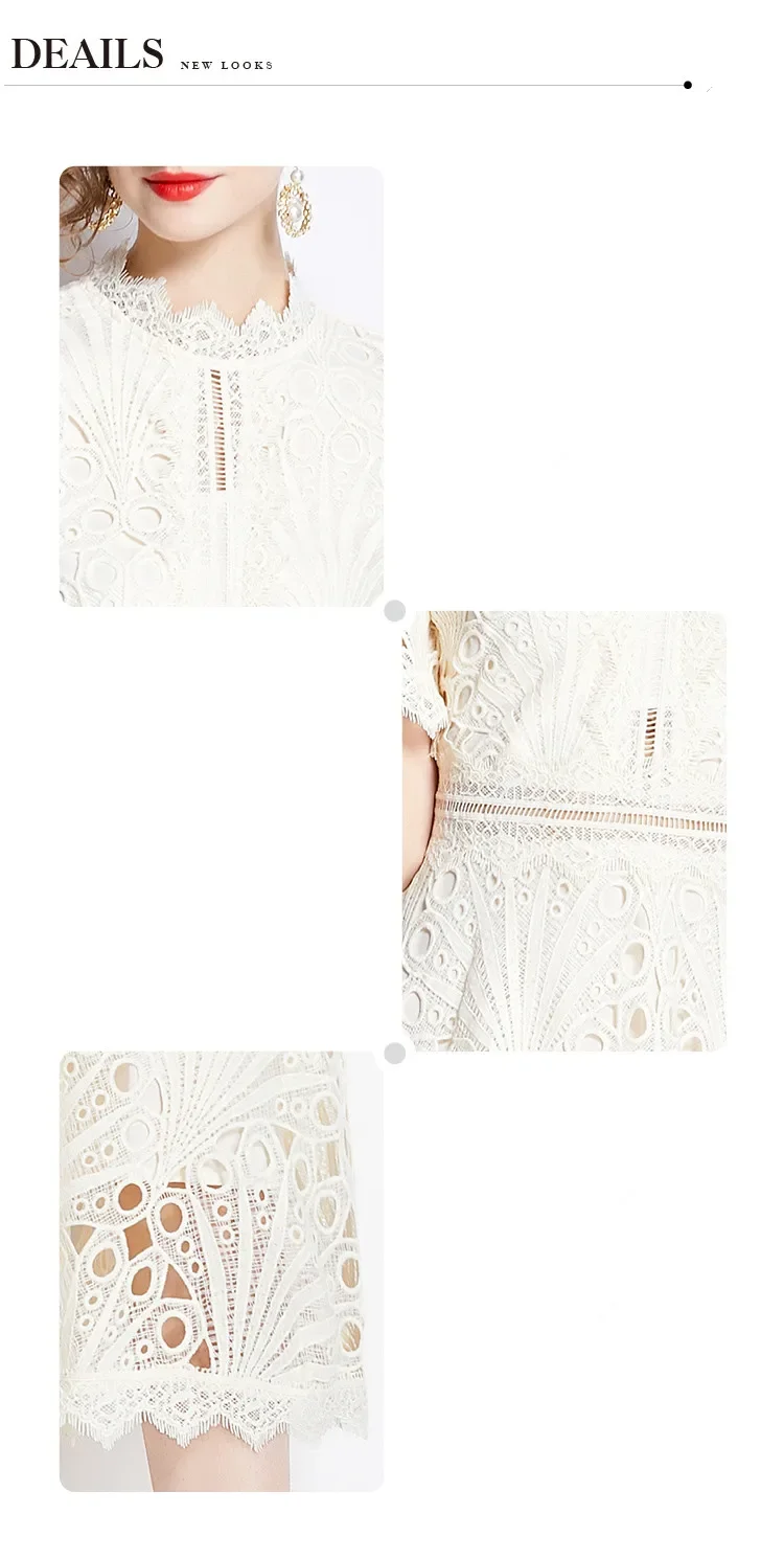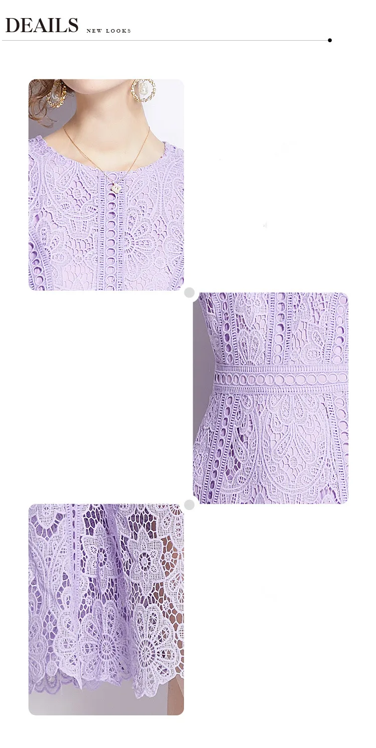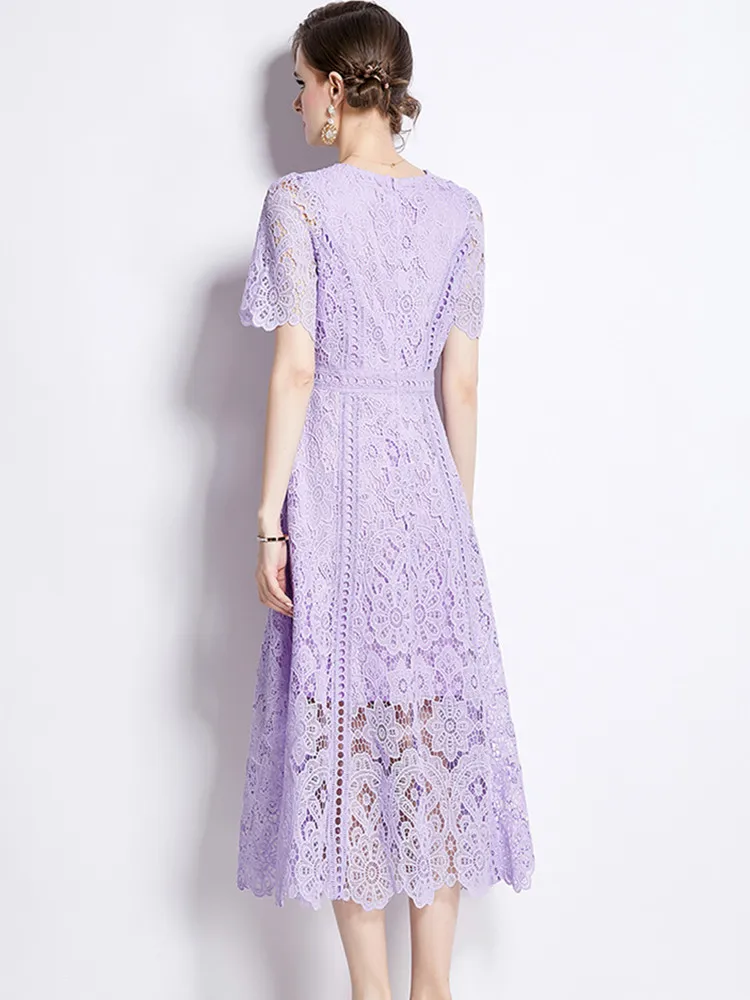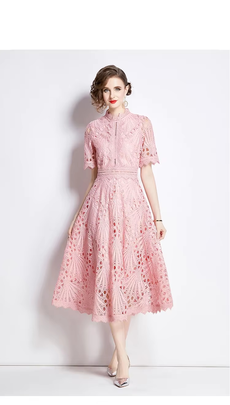 Victoria’s Vogue Vintage High-End O-Neck Short Sleeve Lace Hollow Out Dress For Women’s Summer Slim Elegant Long Dress Female Clothing