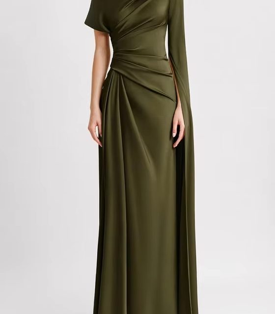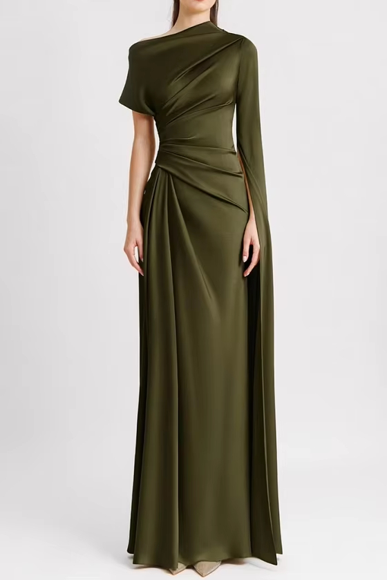 Solid color slanted collar with shoulder sleeves, pleated waist for slimming, ladies’ banquet solid color formal dress skirt