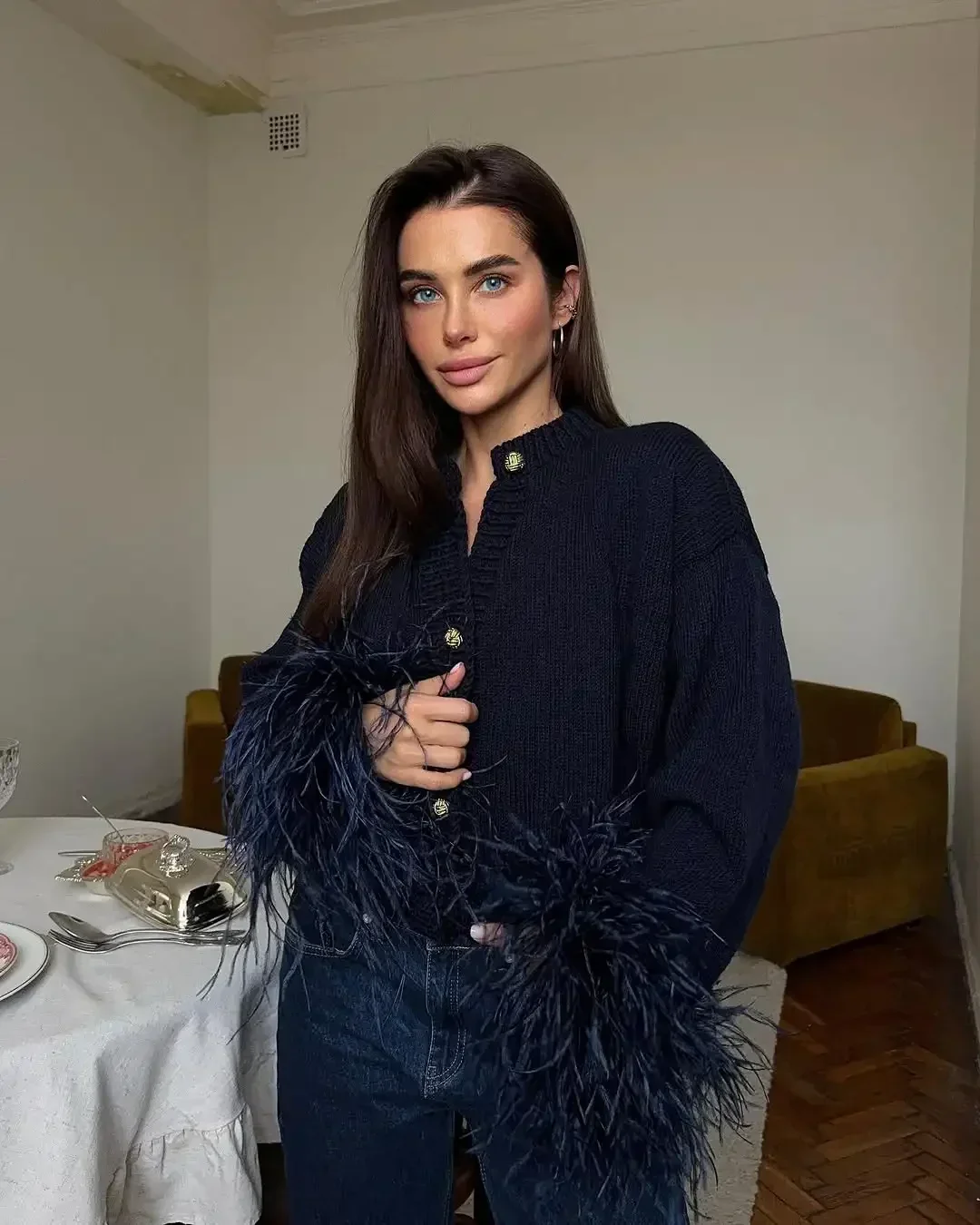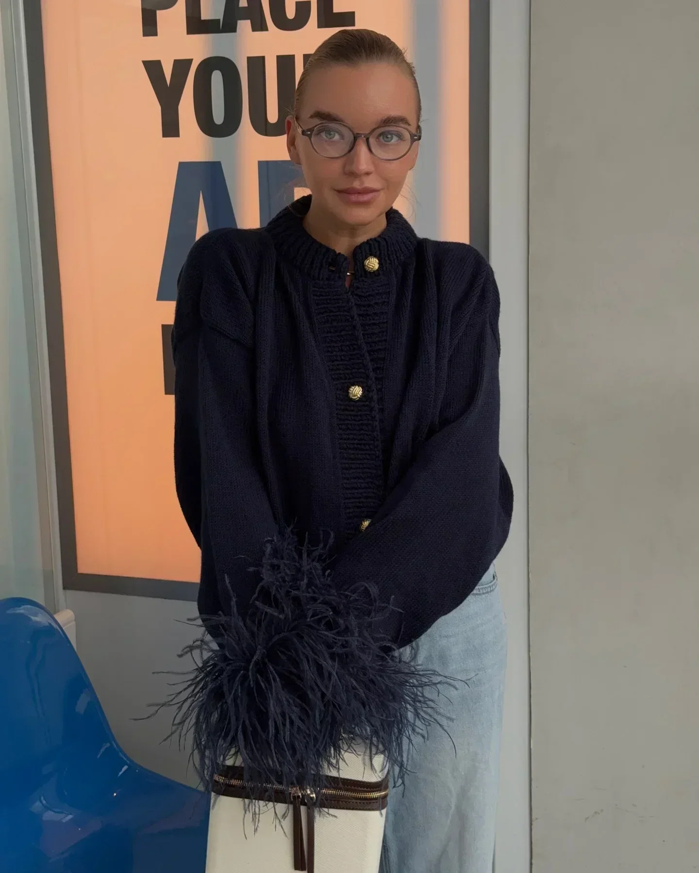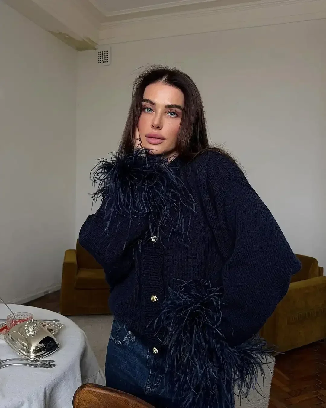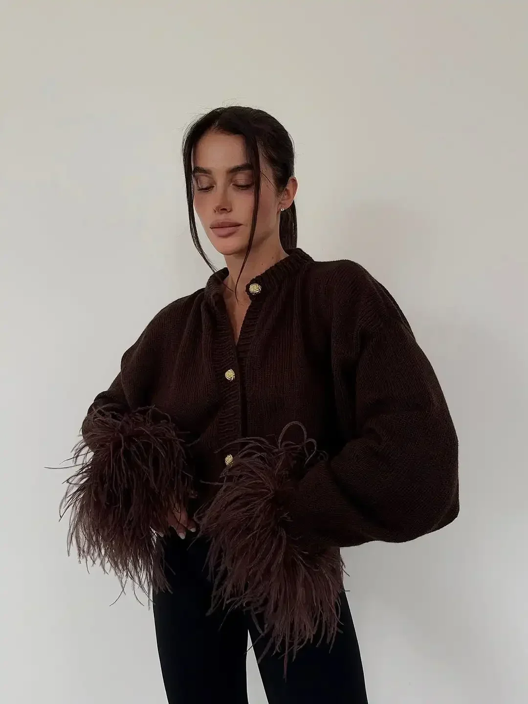 Victoria’s Vogue Solid Feather Patchwork Knitted Coat Lady Casual Round Neck Single Breasted Gold Button Loose Cardigan Autumn Holiday Outwear