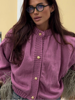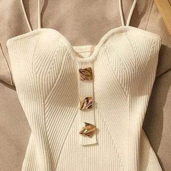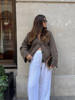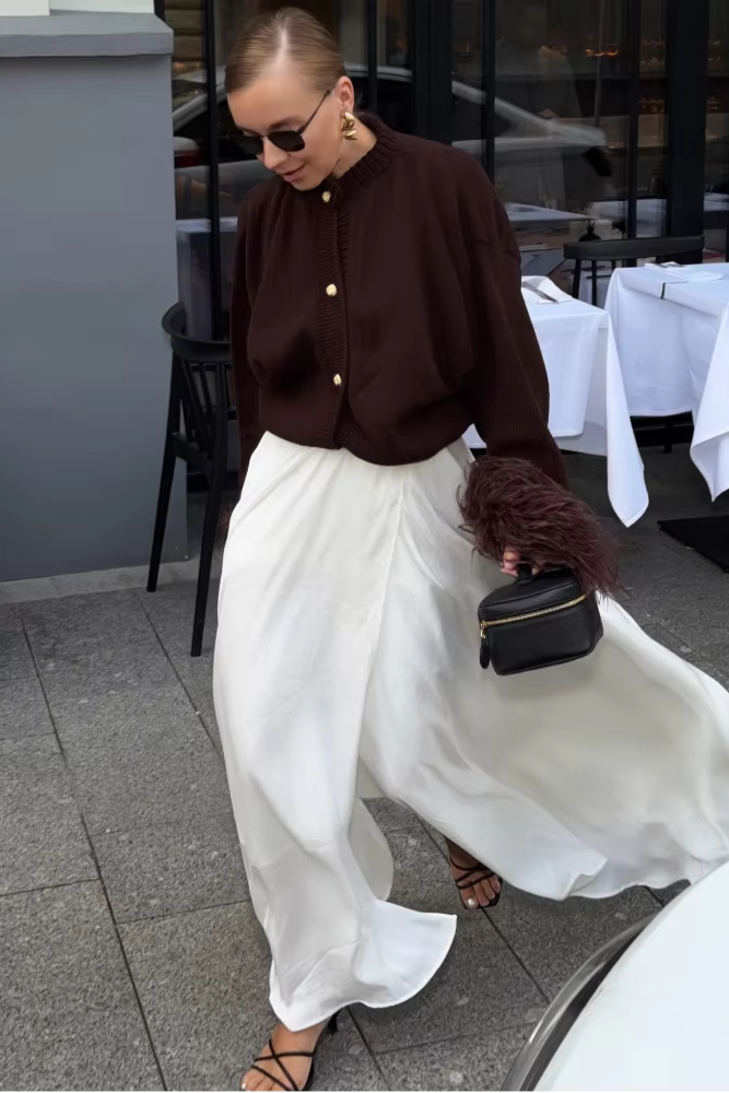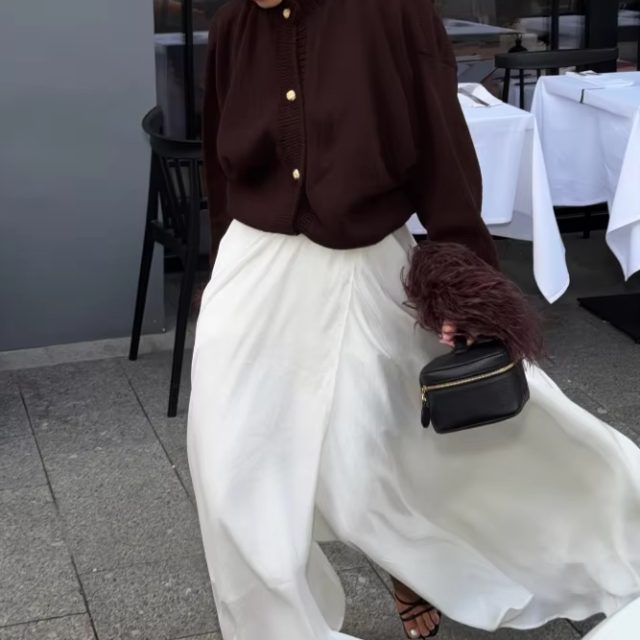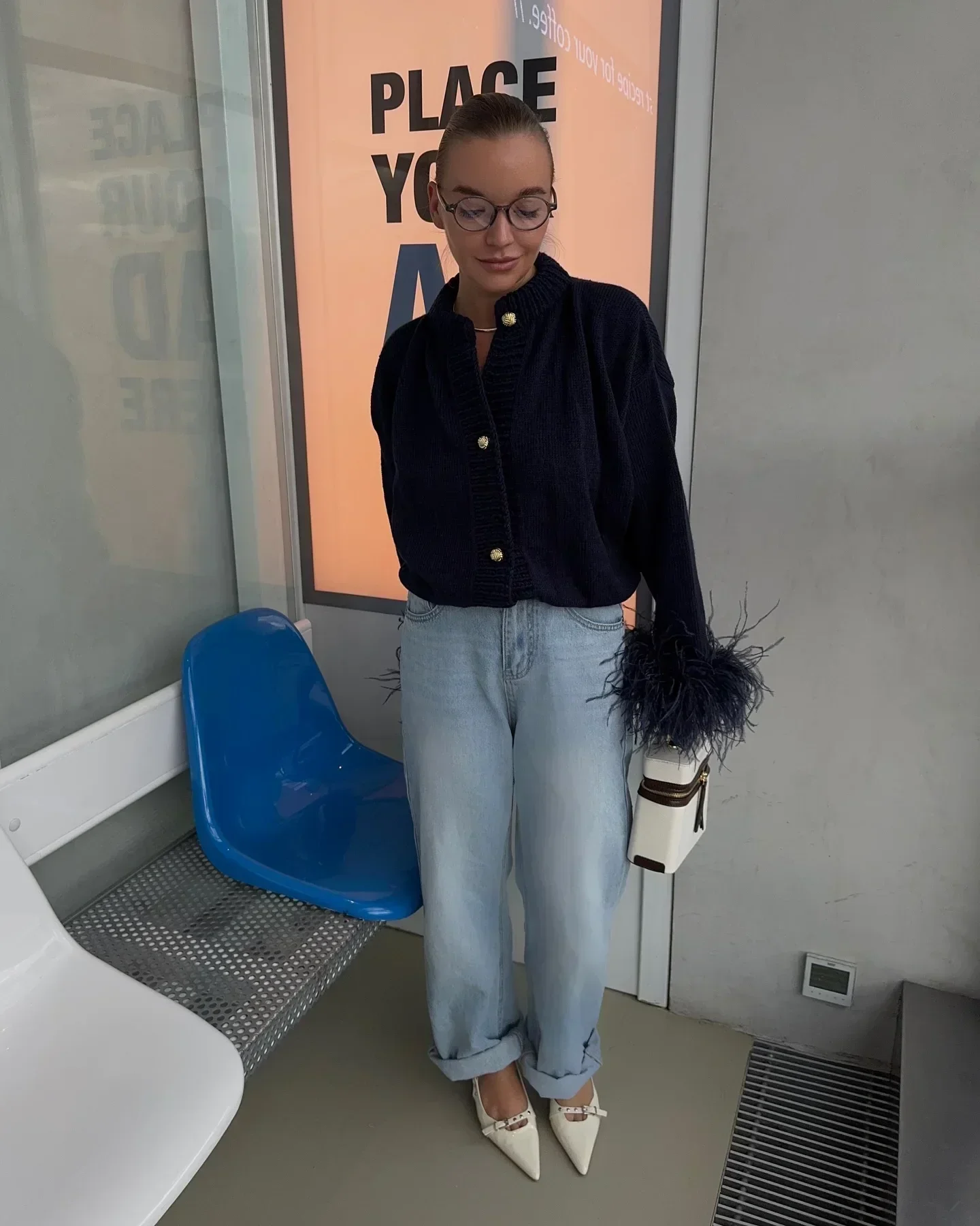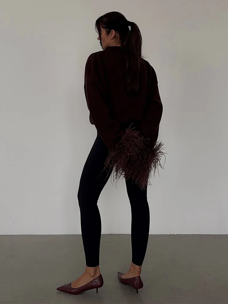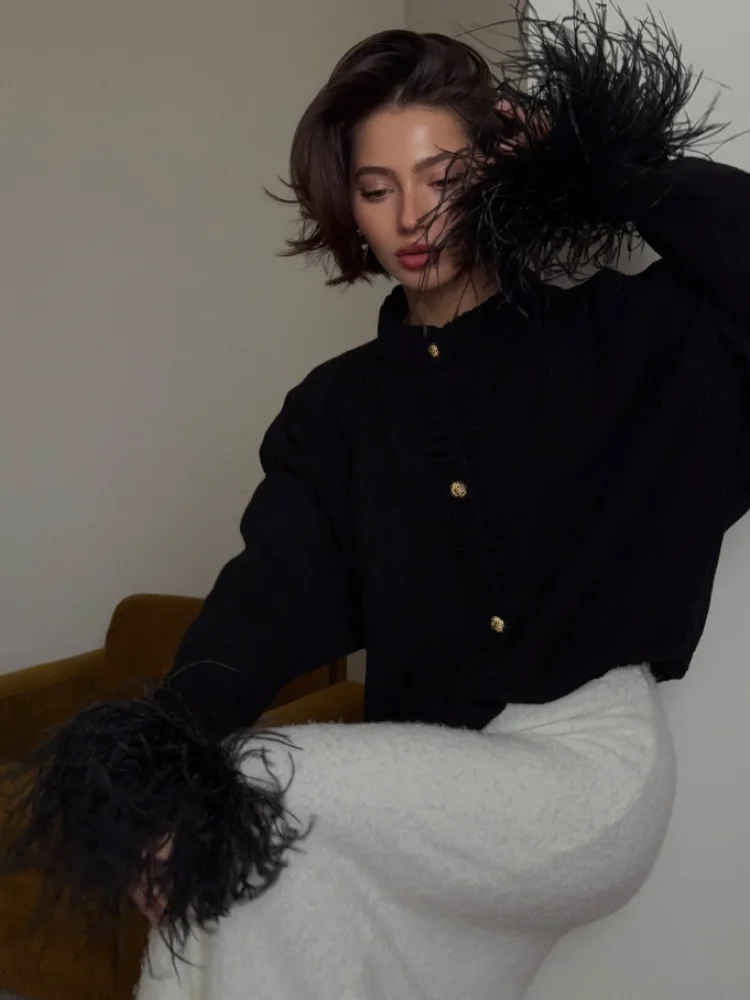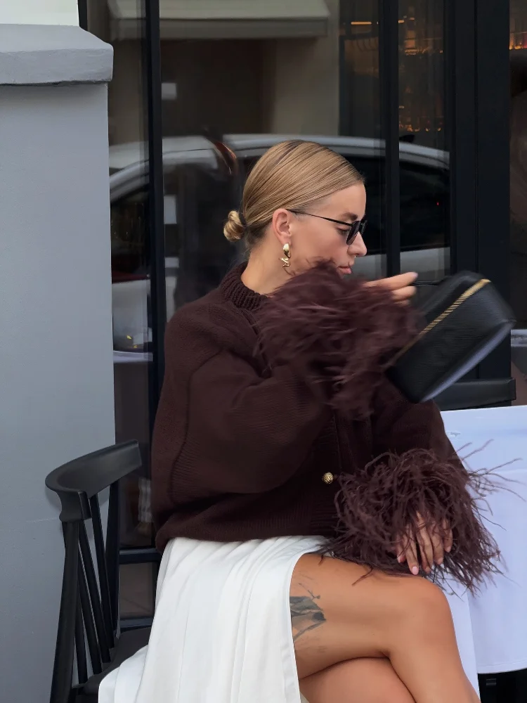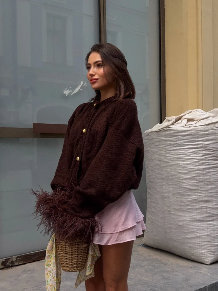 Victoria’s Vogue Solid Feather Patchwork Knitted Coat Lady Casual Round Neck Single Breasted Gold Button Loose Cardigan Autumn Holiday Outwear