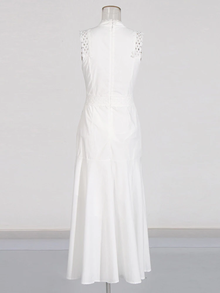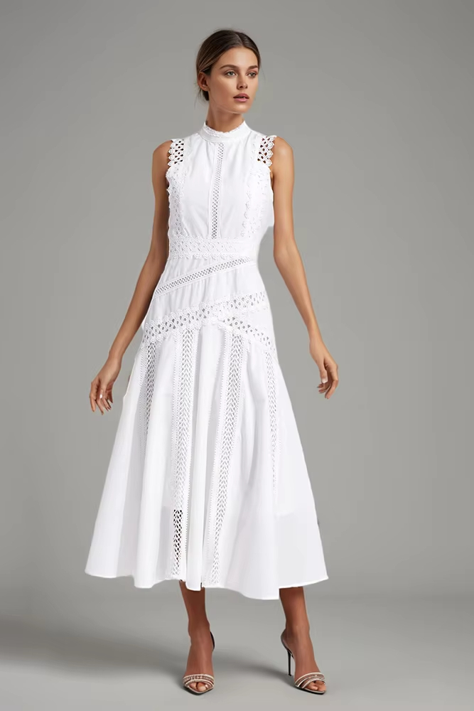 Victoria’s Vogue Solid Hollow Out Casual Dresses For Women Stand Collar Sleeveless High Waist Minimalist A Line Dress Female Style
