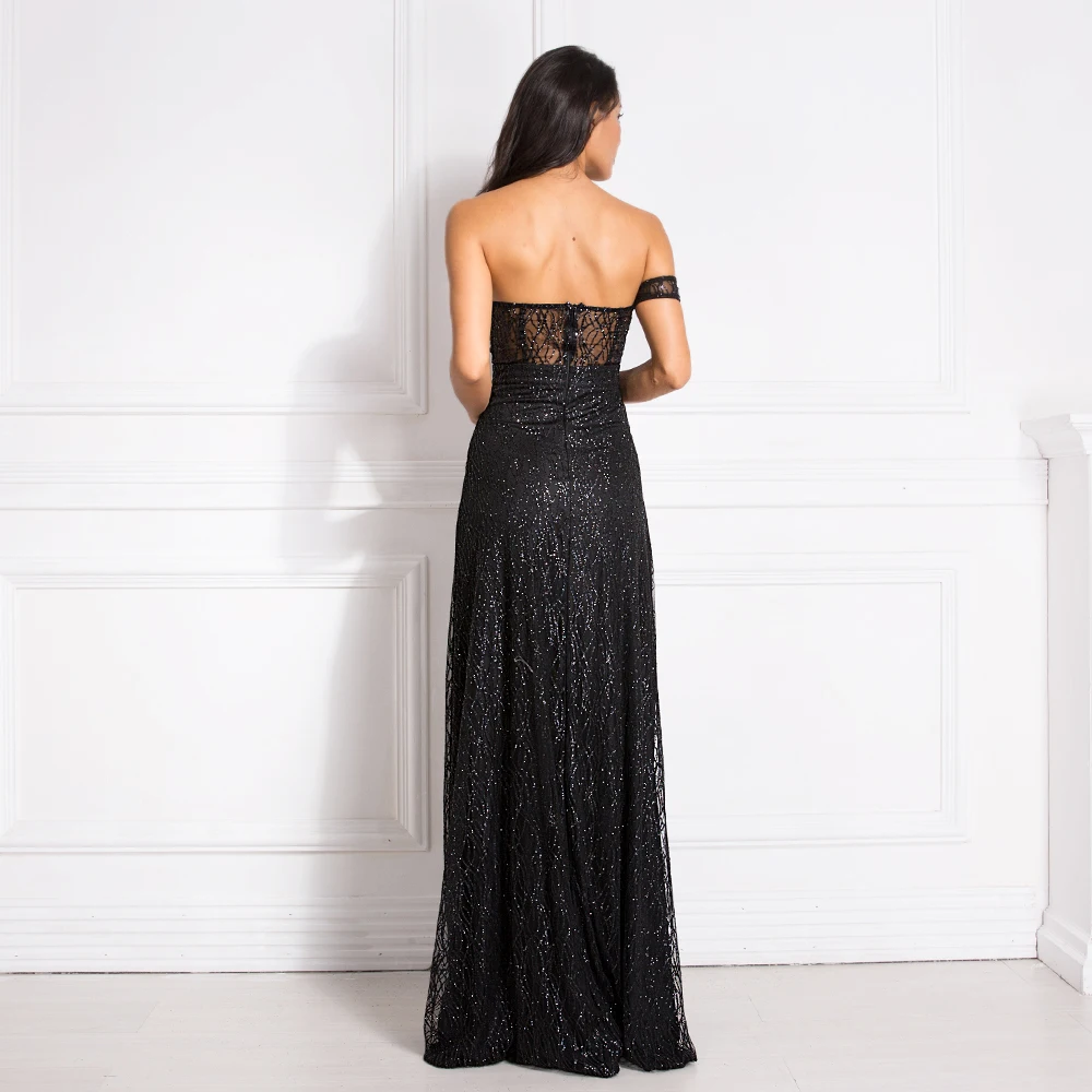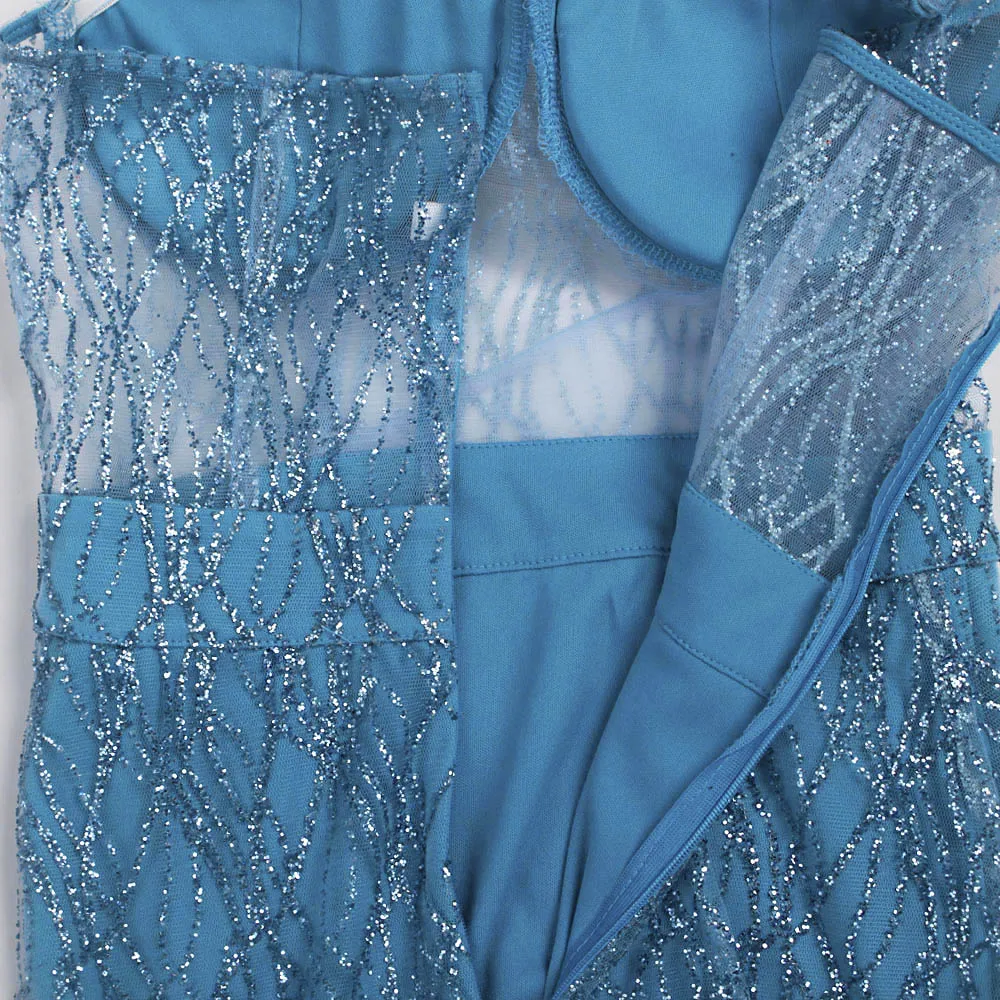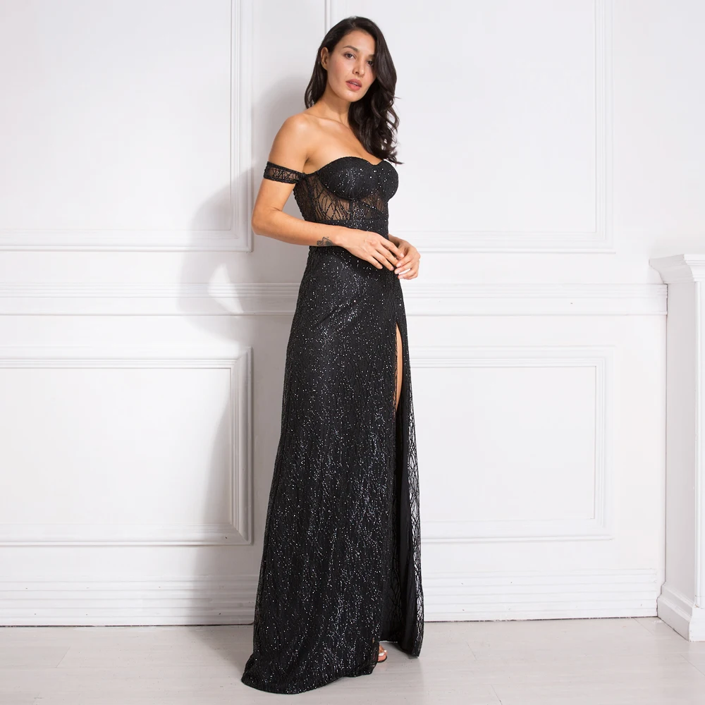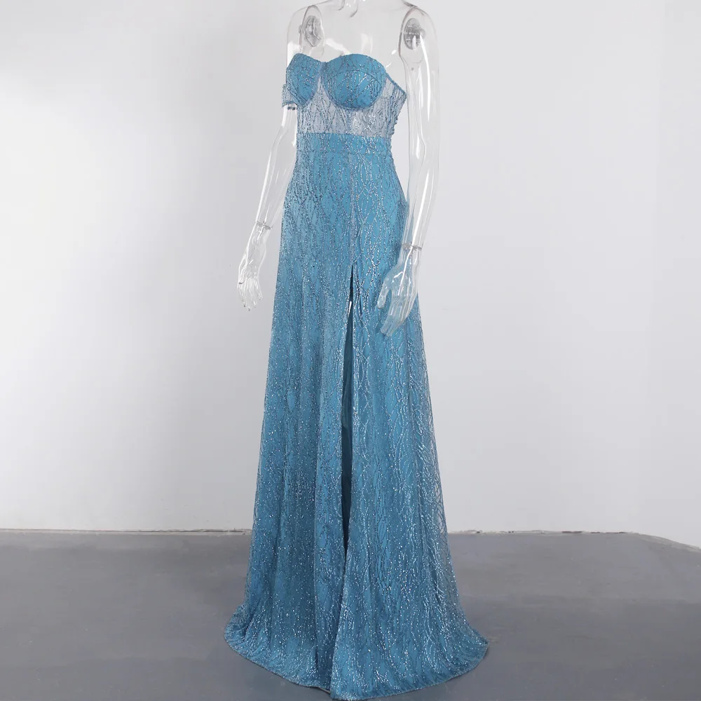 victori9a’svogue 2021 Strapless Blue Glitters Floor Length Split Party Dress Full Lining Padded Backless Long Black Dresses