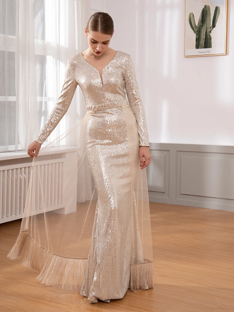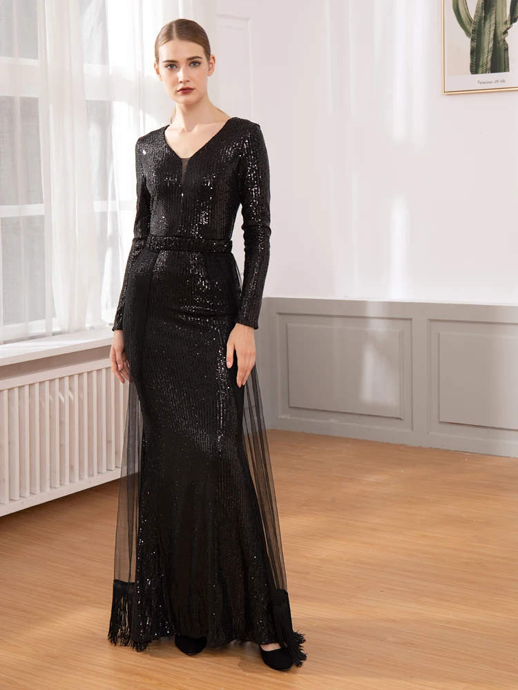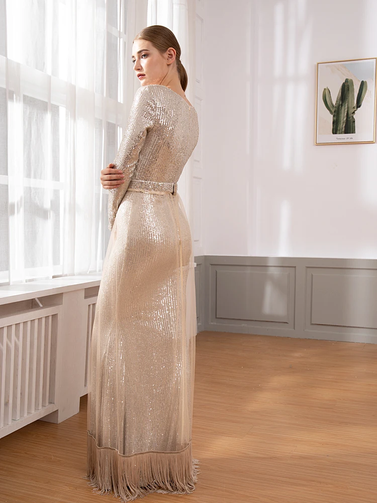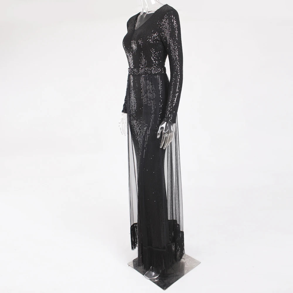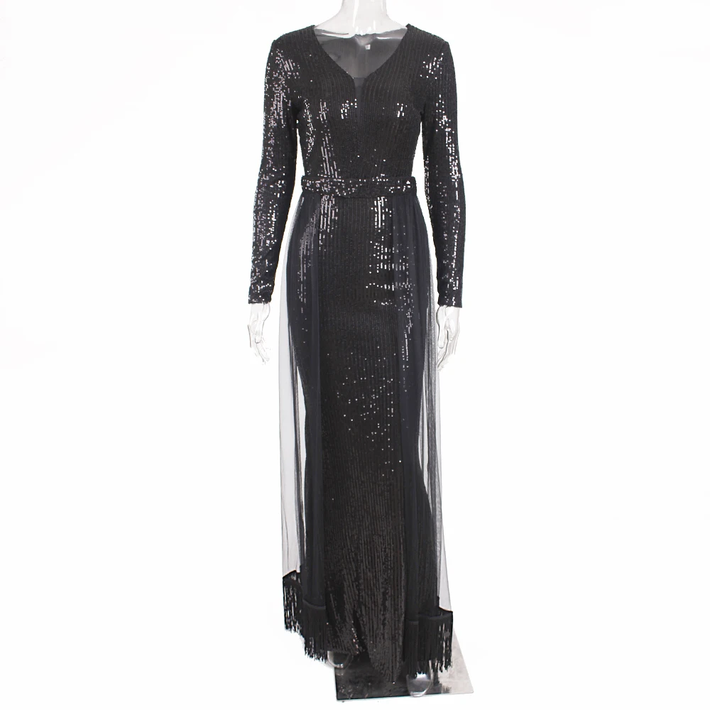 victoria’svogue 2021 Striped Sequined V Neck Maxi Dress Patchowrk Tassel Stretchy Hollow Out Full Sleeved Long Party Dress with Mesh Trains Skrit
