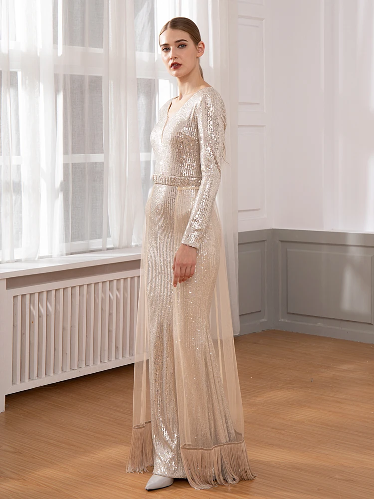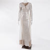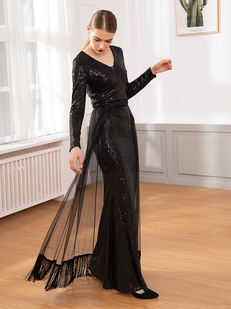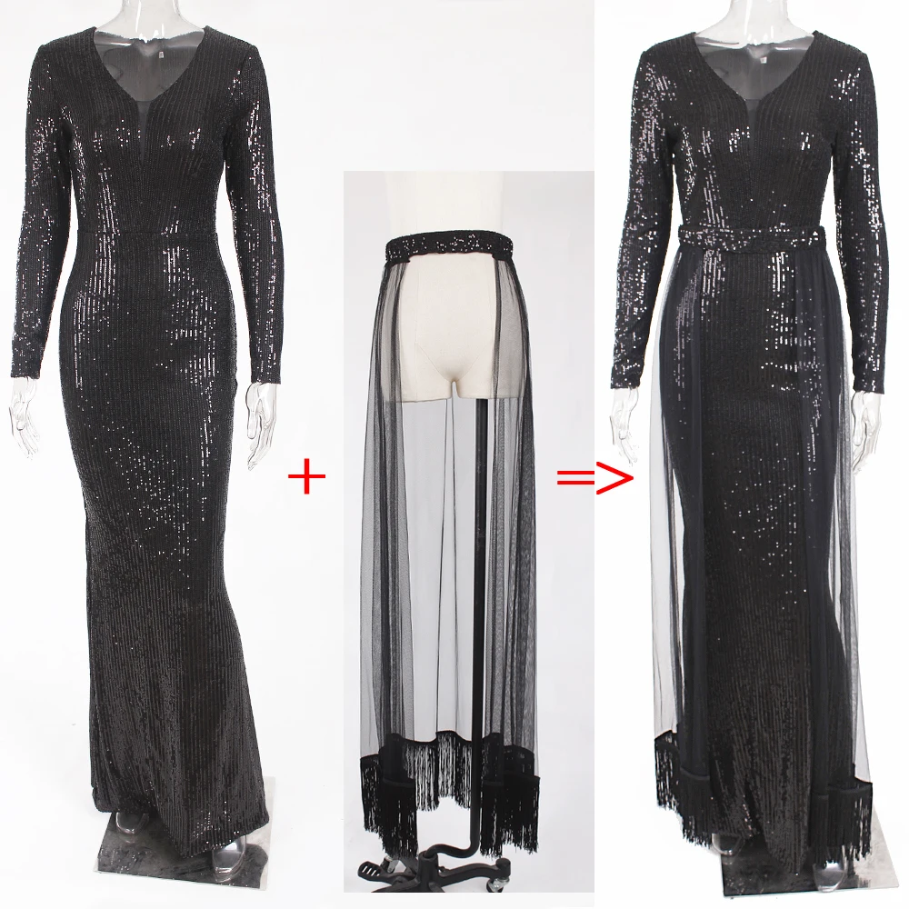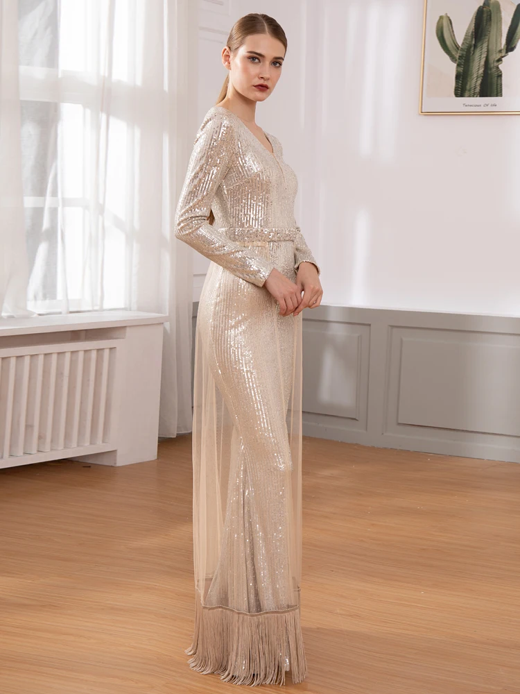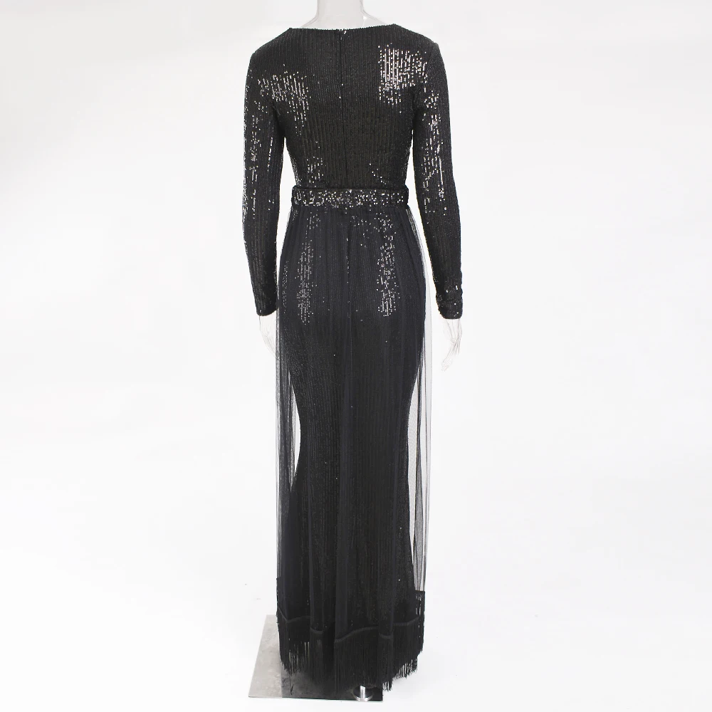 victoria’svogue 2021 Striped Sequined V Neck Maxi Dress Patchowrk Tassel Stretchy Hollow Out Full Sleeved Long Party Dress with Mesh Trains Skrit