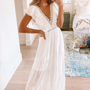 victoria’s vogue Sexy Deep V-neck Butterfly Sleeve Maxi Dress White High Waist Mid-length A-line Dress Casual Women Summer Holiday Dress