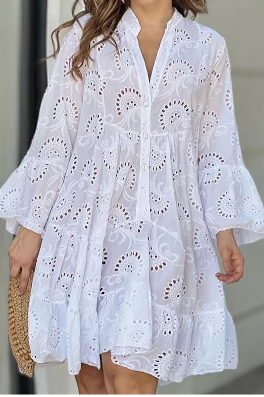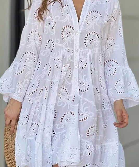 Victoria’s Vogue Summer Elegant Vintage Solid Lace Dress V-neck Loose Hollow Out Pattern Embroidery Vestidos Women Beach Sexy Mini White Dresses