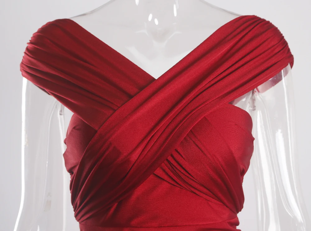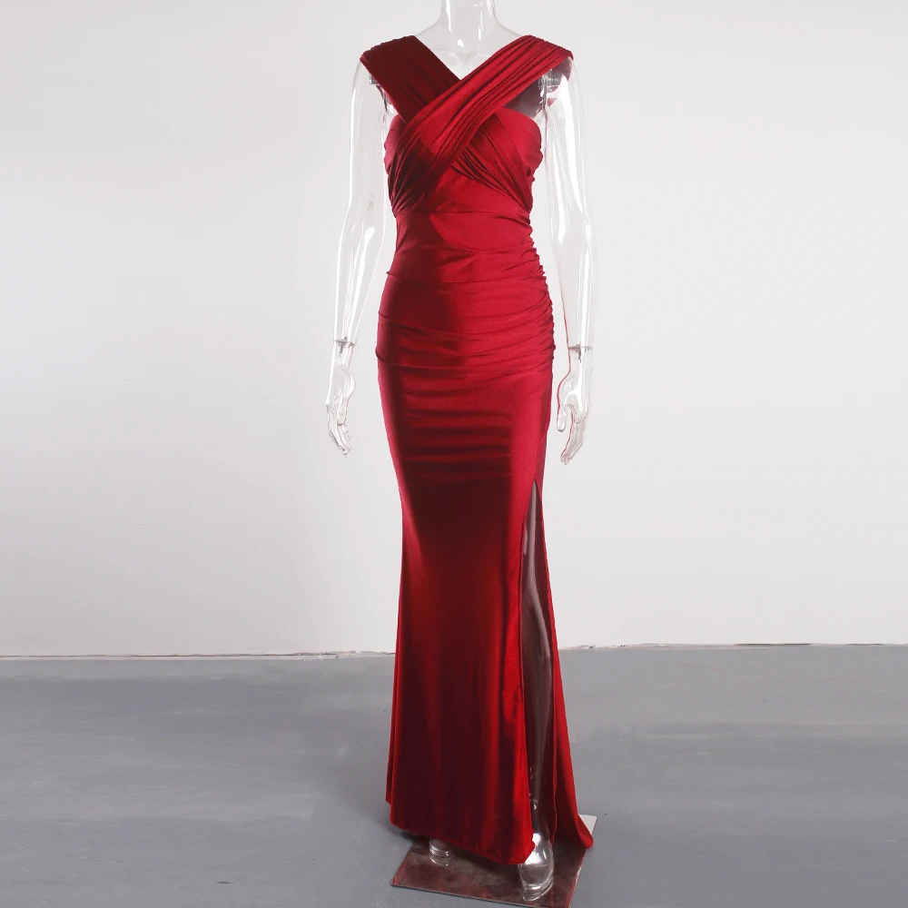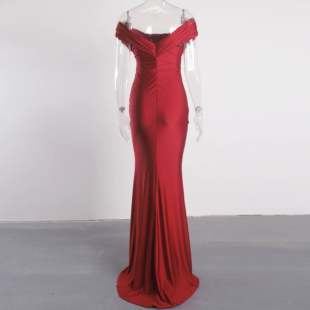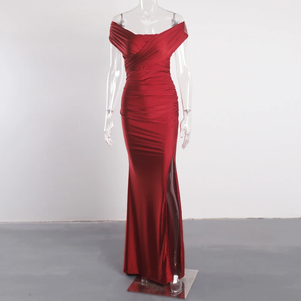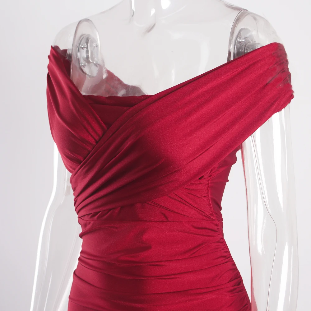 victoria’svogue 2021 Summer Long Evening Party Dress Dark Red Stretchy Prom Sleeveless Pleated Fold Gown Off the Shoulder Side Slit Long