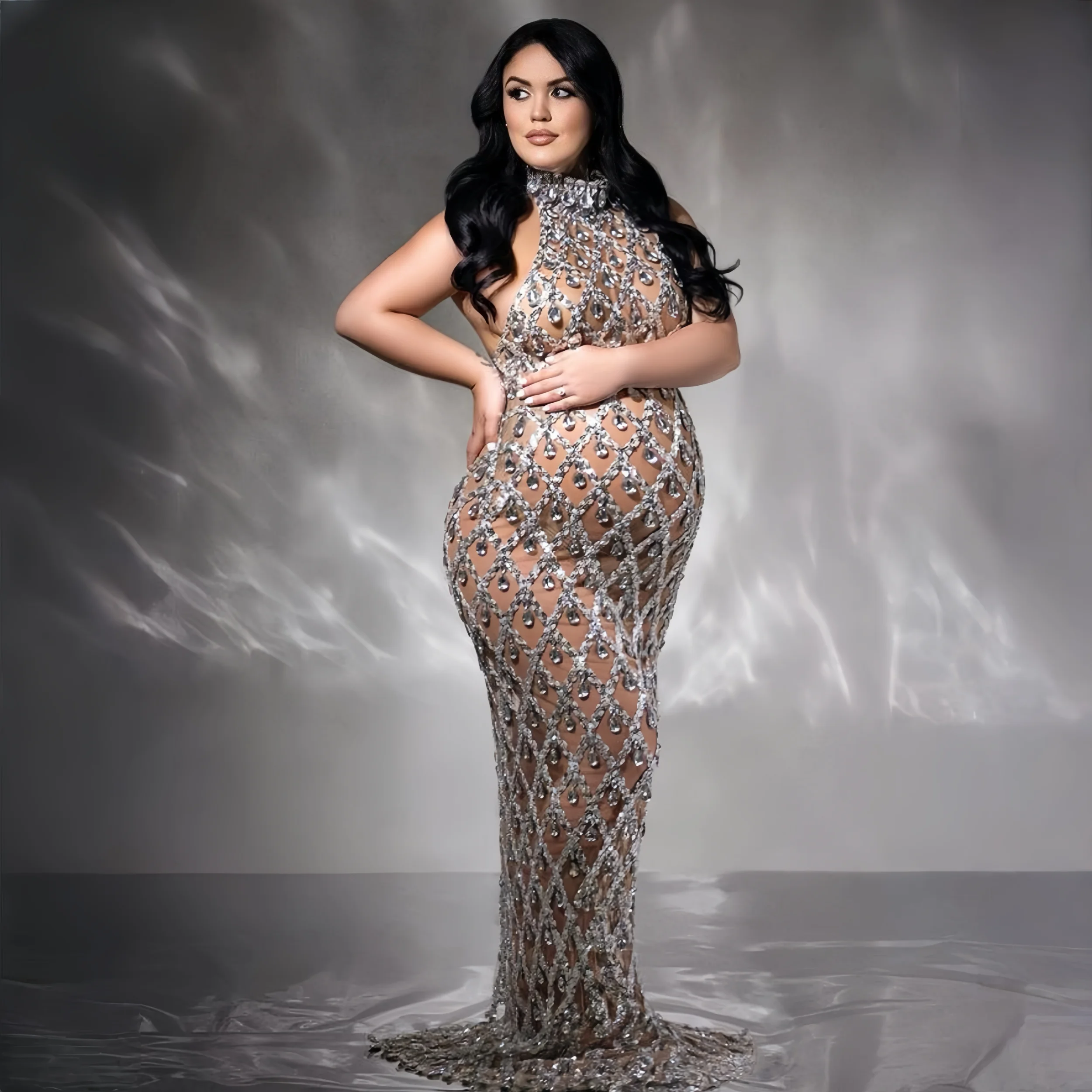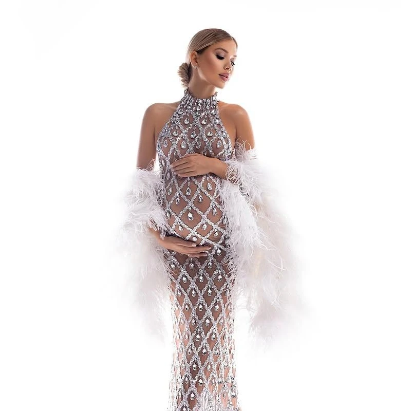 Victoria’s Vogue Summer Shining Rhinestone Maternity Long Dress Photography Crystals Stretchy Sleeveless Tulle Maternity Photo Shoot Dress