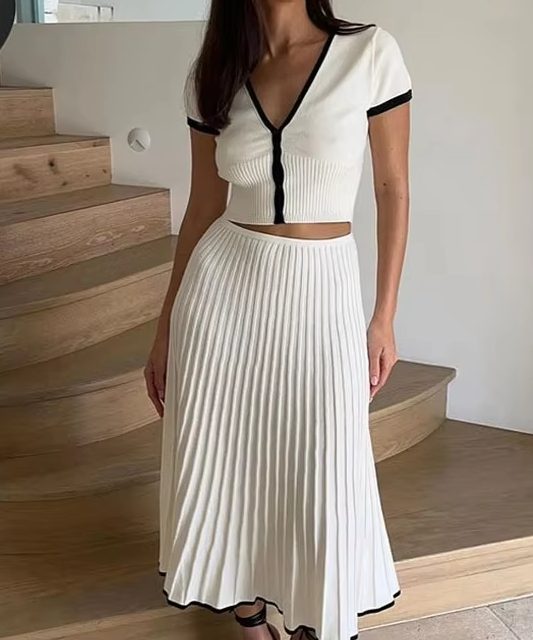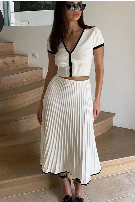 Victoria’s Vogue Summer Women White long Skirt Suit Short Sleeve V-neck crop top pleated set elegant dress 2 piece skirt set