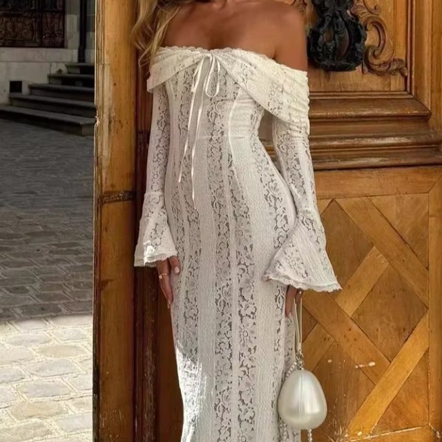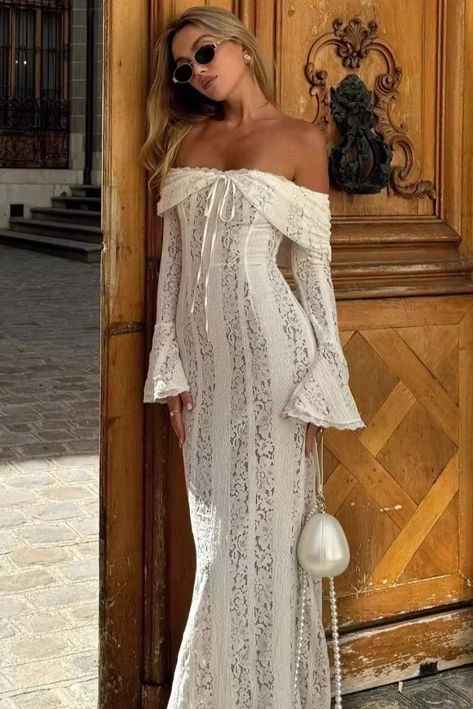Victoria’s Vouge White Off The Shoulder Autumn Bodycon Dress 2025 Long Sleeve Elegant Lace Maxi Dress Wedding Guest Dress for Women