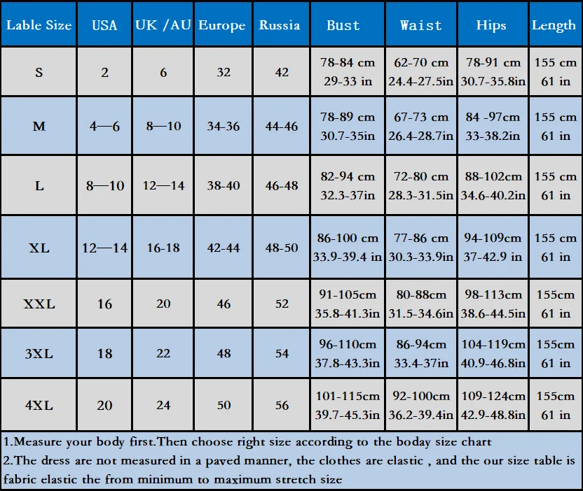 2.The dress are not measured in a paved manner, the clothes are elastic , and the our size table is fabric elastic the from minimum to maximum stretch size , you can according to your size choose dress size (Very important)