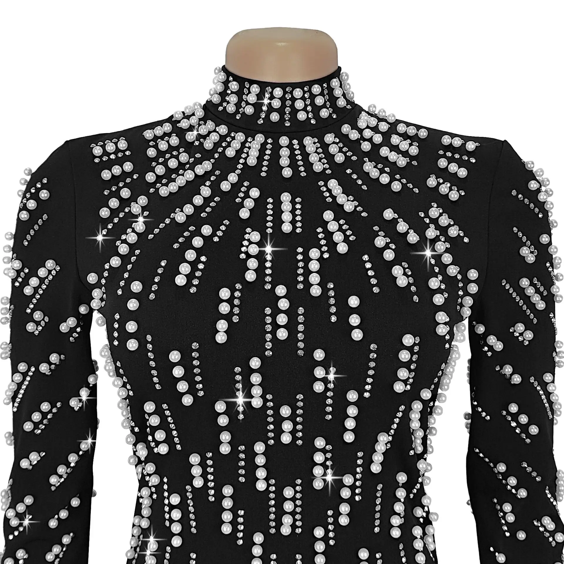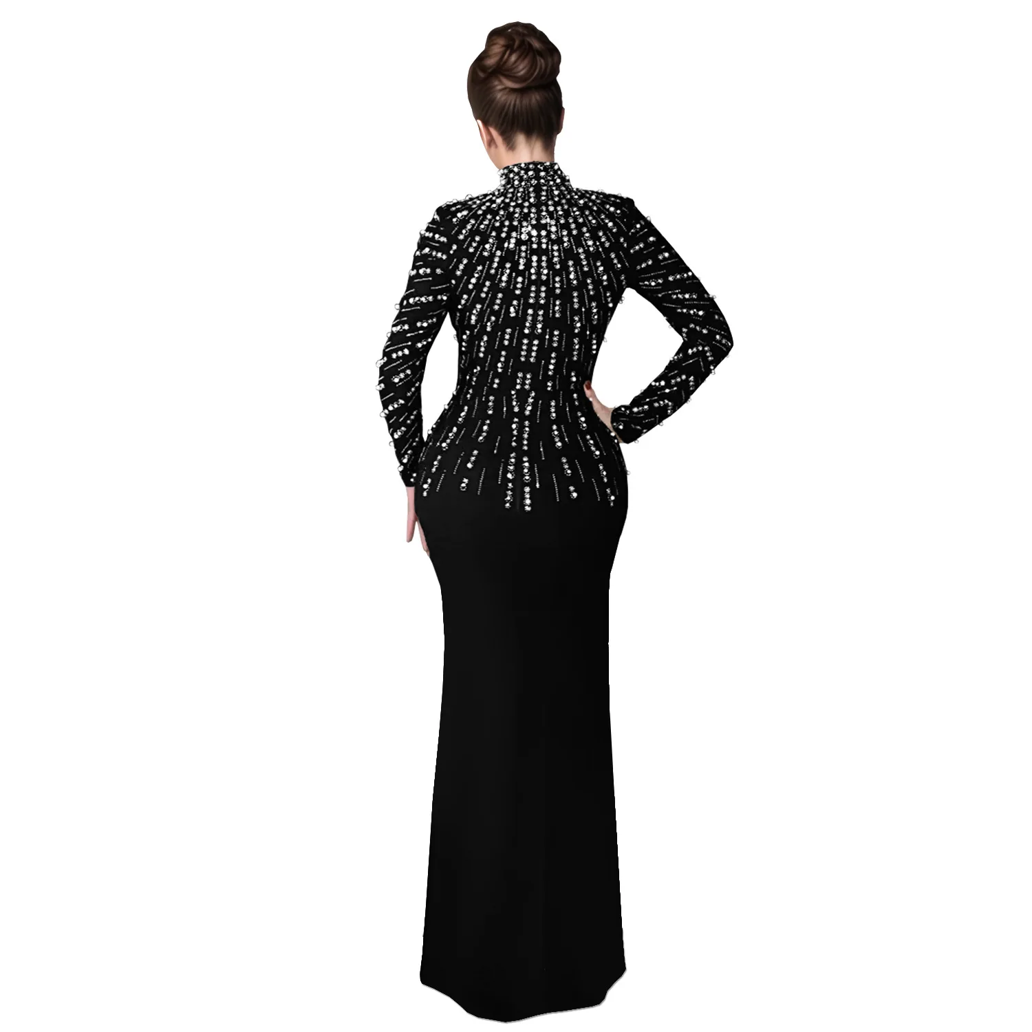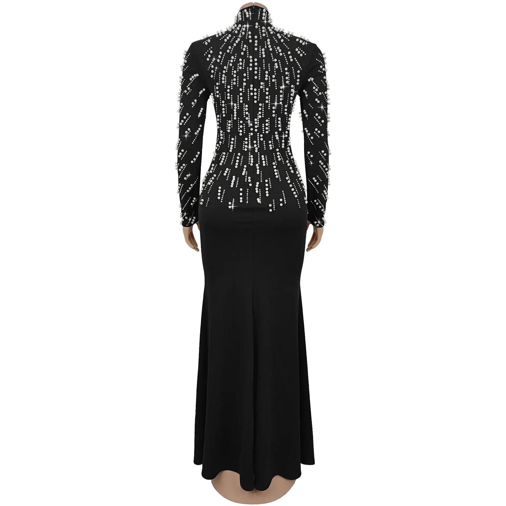 Victoria’s Vogue Elegant Party Diamond Pearl Long Bodycon Dress Women O Neck Long Sleeve Glitter Club Evening Black Sheath Maxi Dress