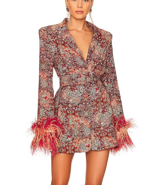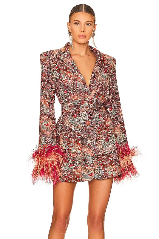 Victoria’s Vogue Floral Suit Collar Waist Decorative Belt Elegant Dress, Women’s Fitted Cuff Decorated Feather Party Dress