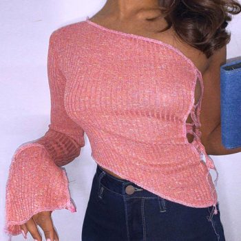 victoria’s vogue 2022 Long Sleeve One-Shoulder Bandage Hollow Out Irregular Sexy Tshirt Top Autumn Winter Women Party Club Outfits