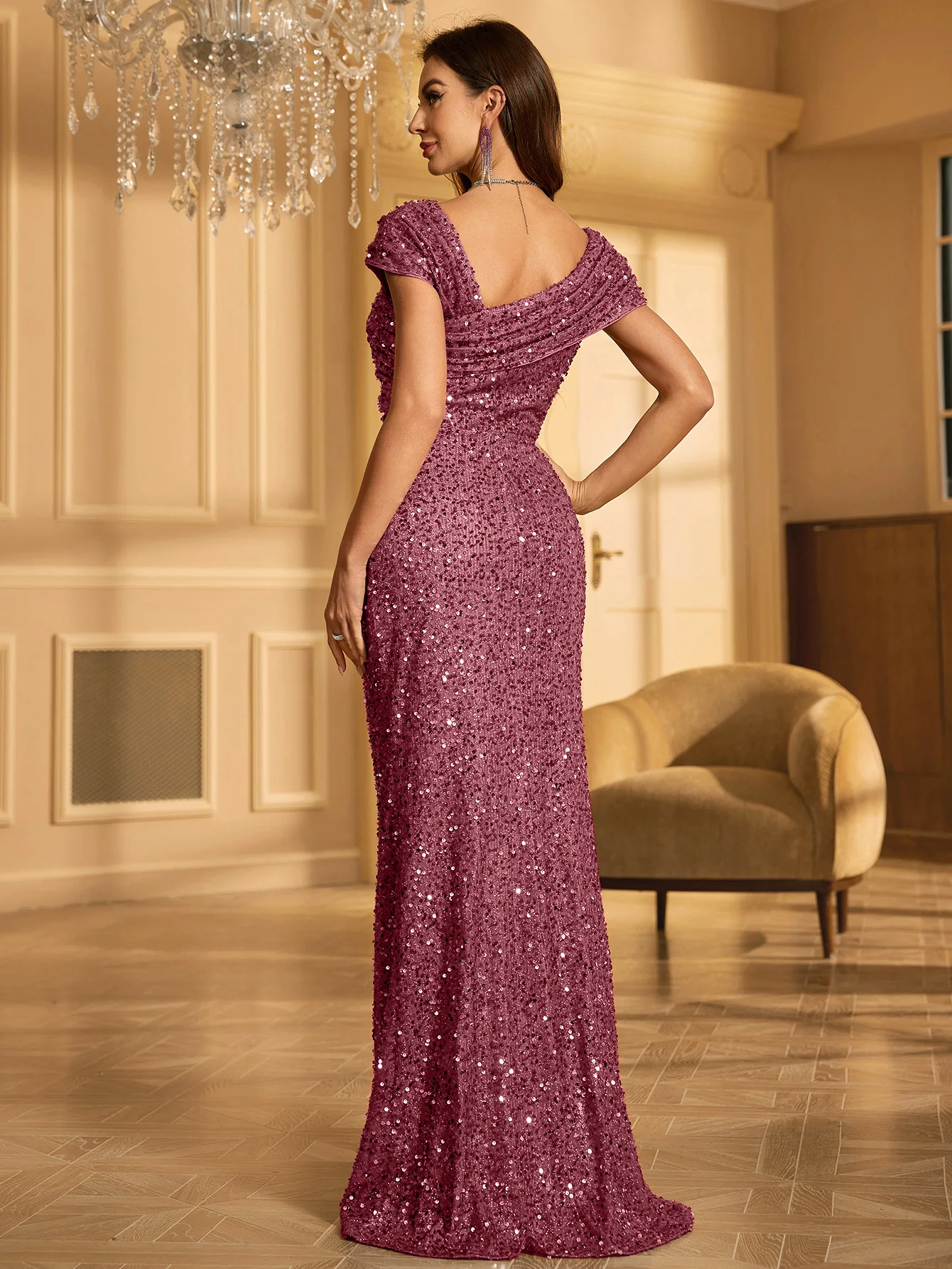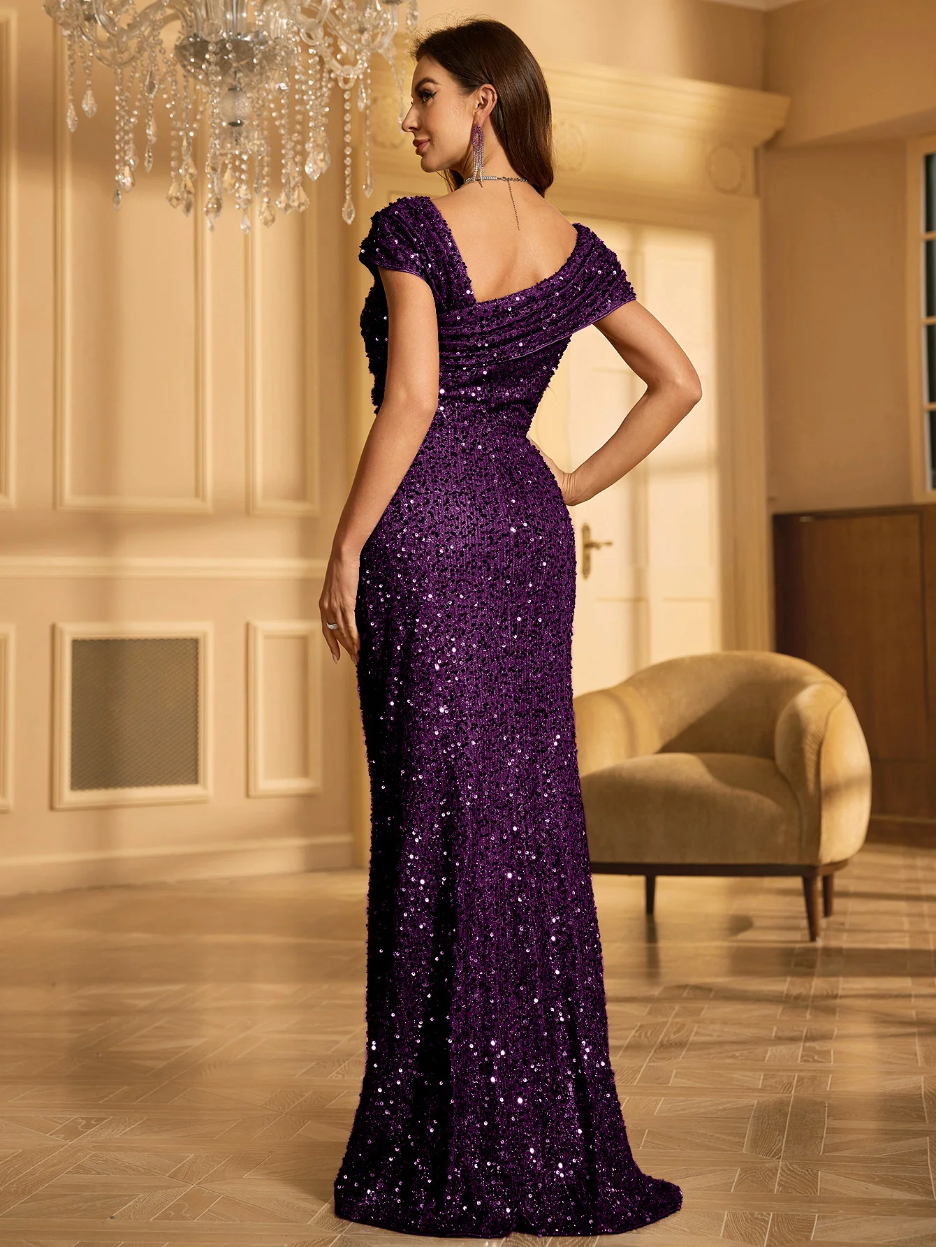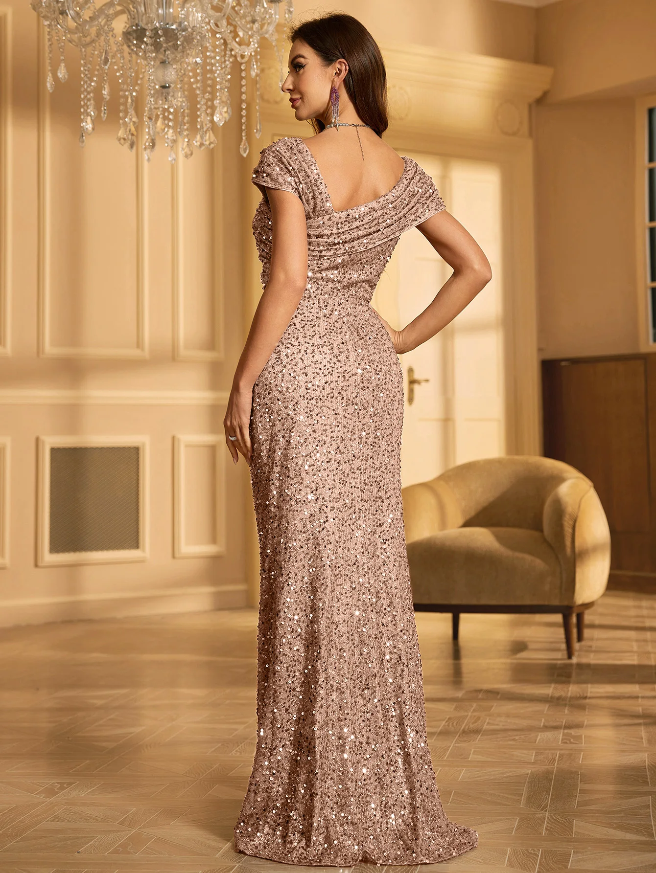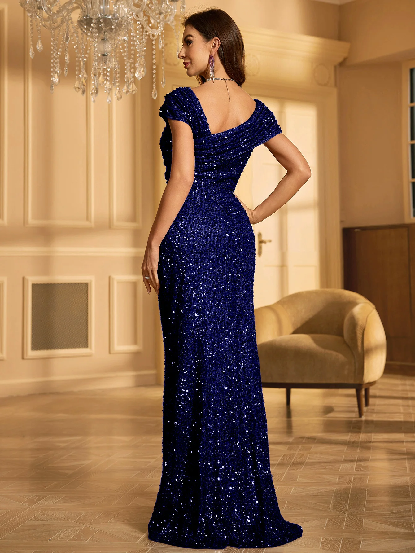 victoria’svogue Sequins Evening Dress For Women 2025 Deep V-neck Satin Prom Party Green Dress Floor Length Blue Formal Gown
