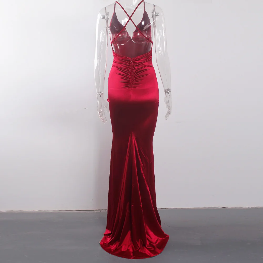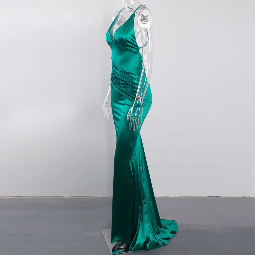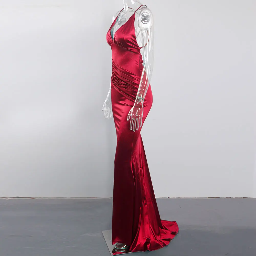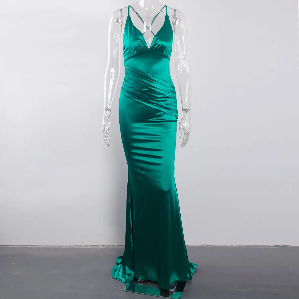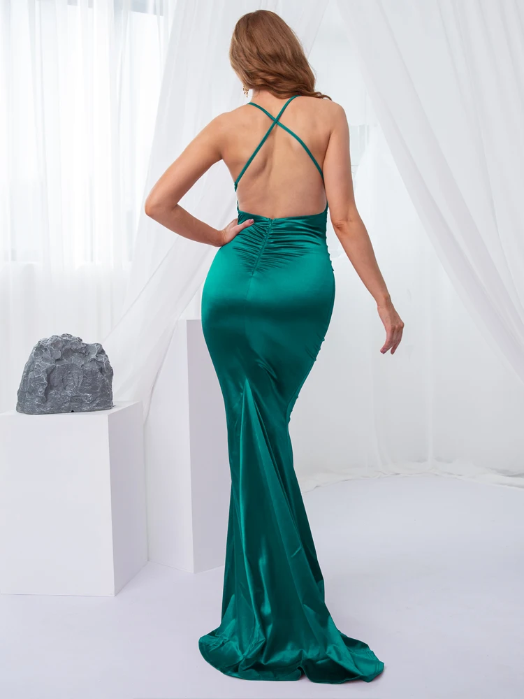 victoria’svogue 2021 V Neck Pleated Satin Summer Dress Sleeveless Ruched Stretch Backless Cross Straps Mermaid Evening Long Night Party Dress