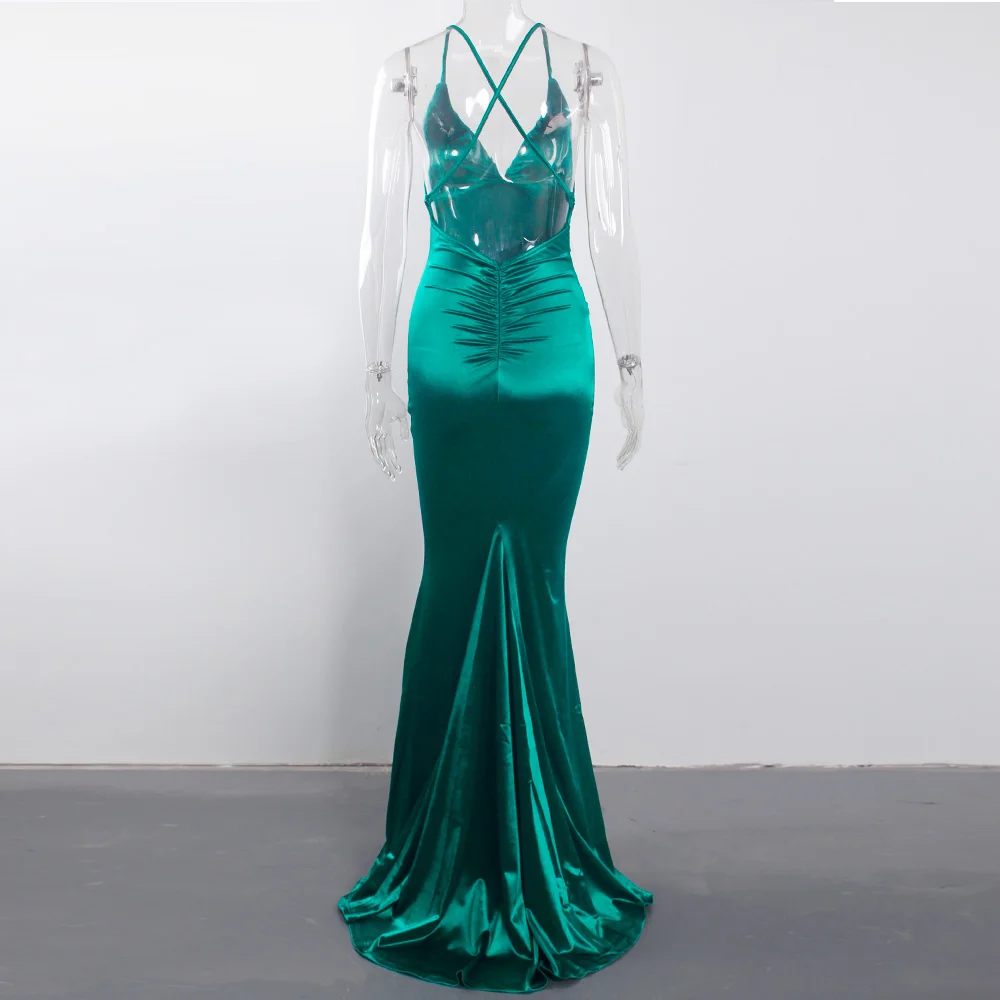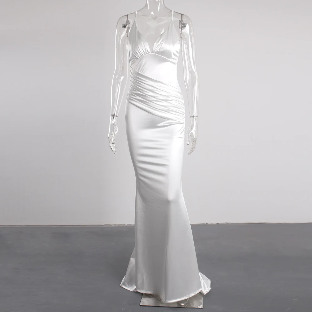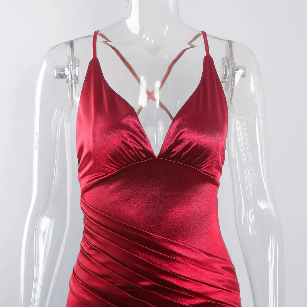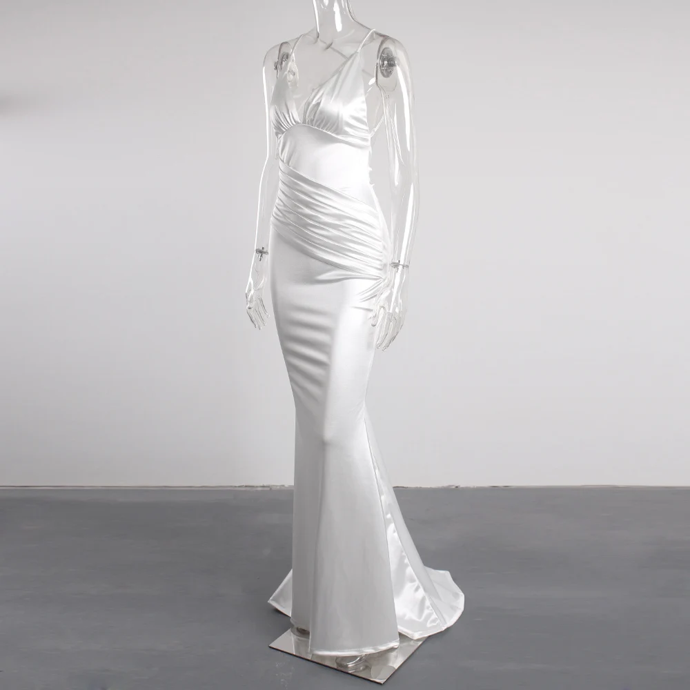 victoria’svogue 2021 V Neck Pleated Satin Summer Dress Sleeveless Ruched Stretch Backless Cross Straps Mermaid Evening Long Night Party Dress