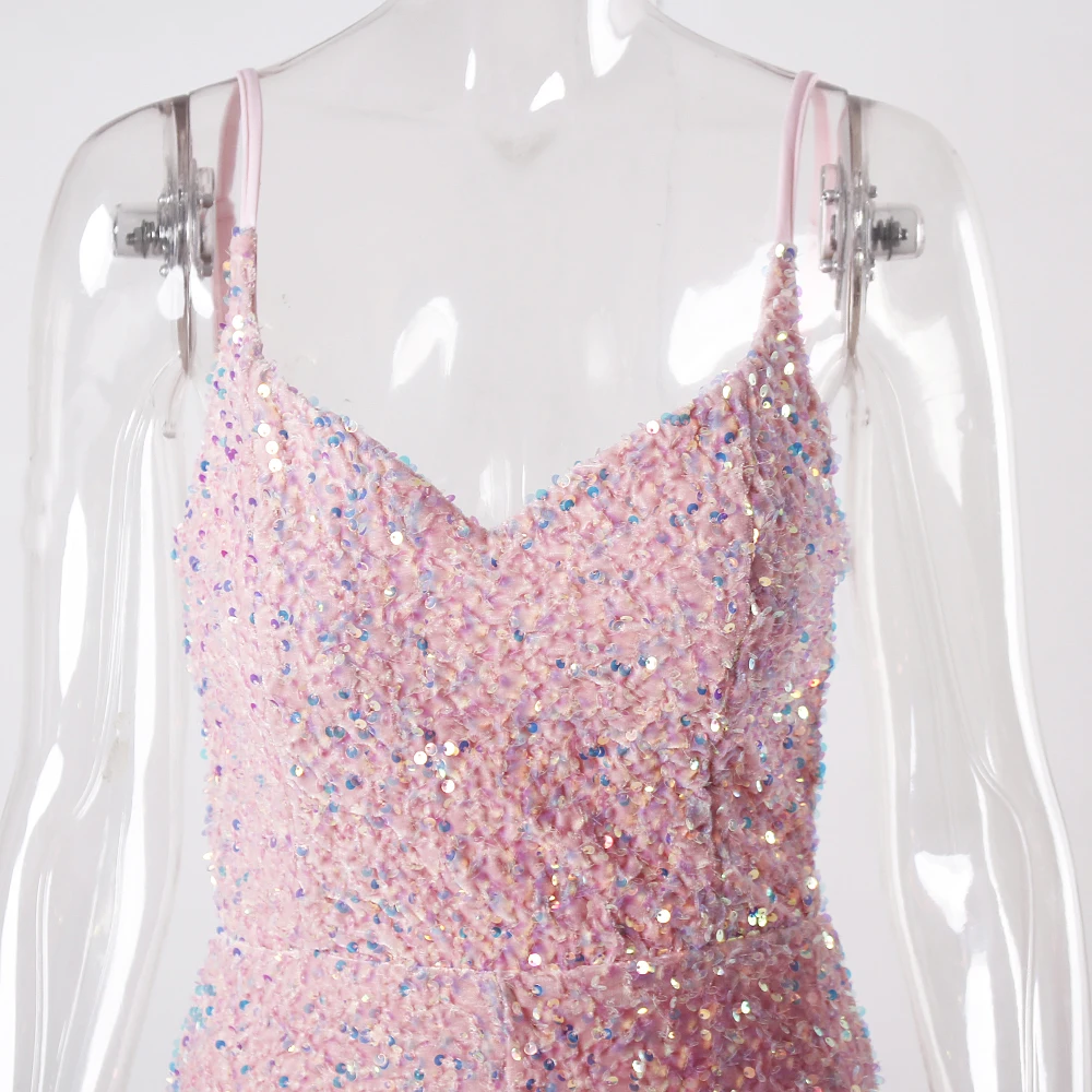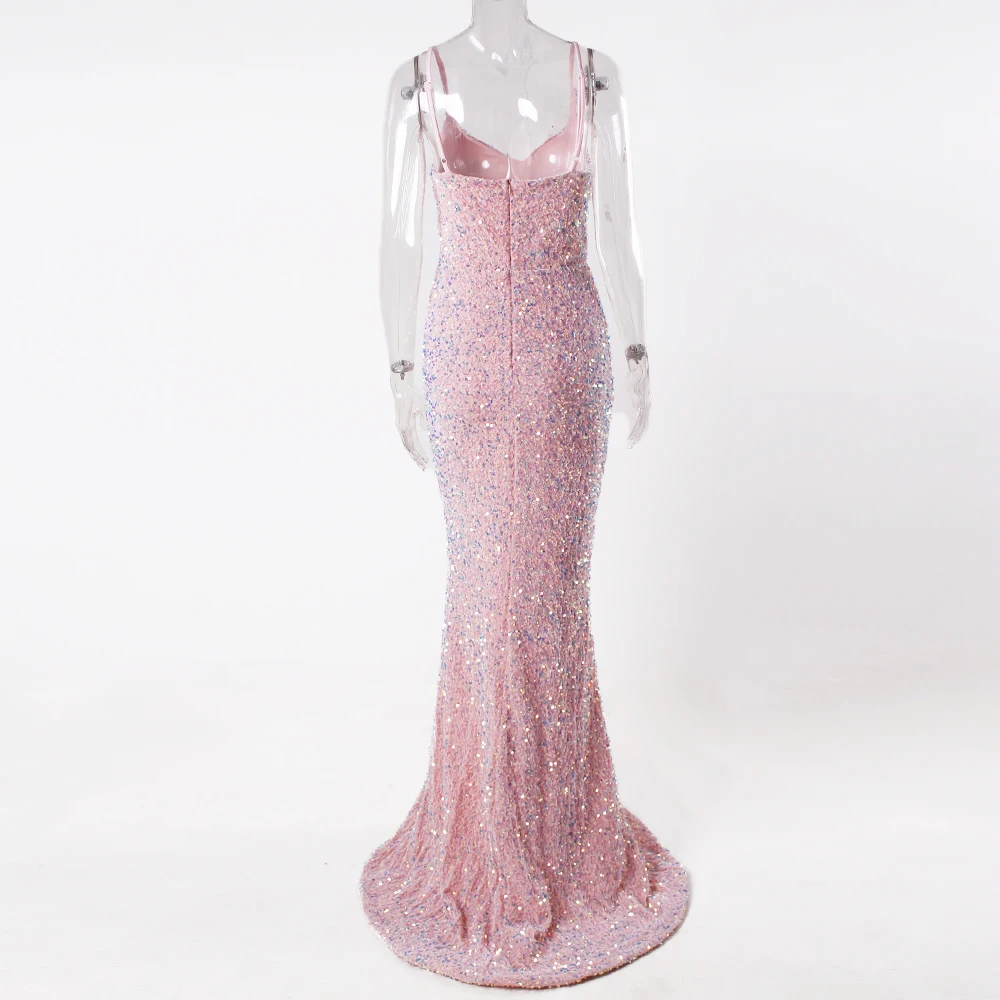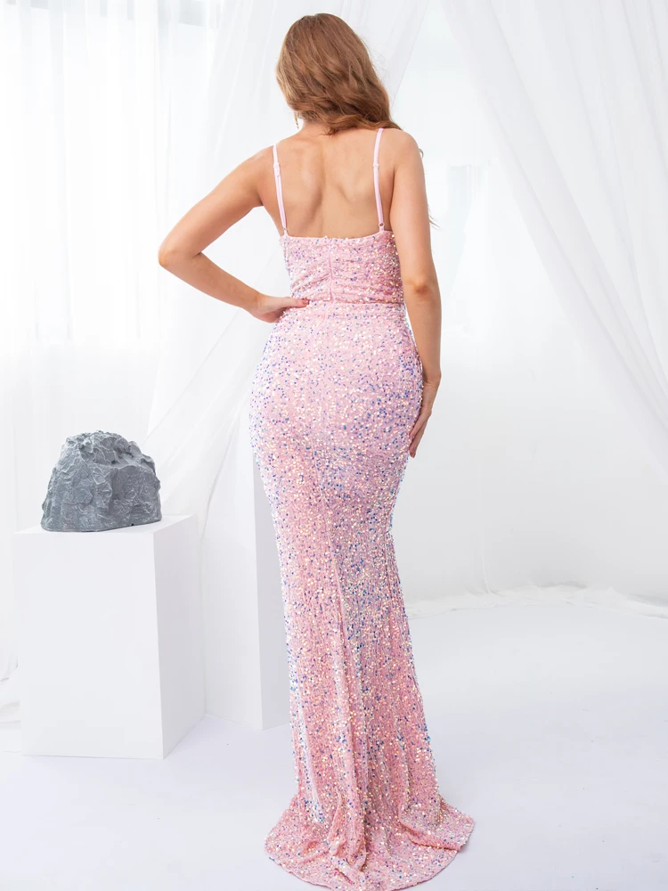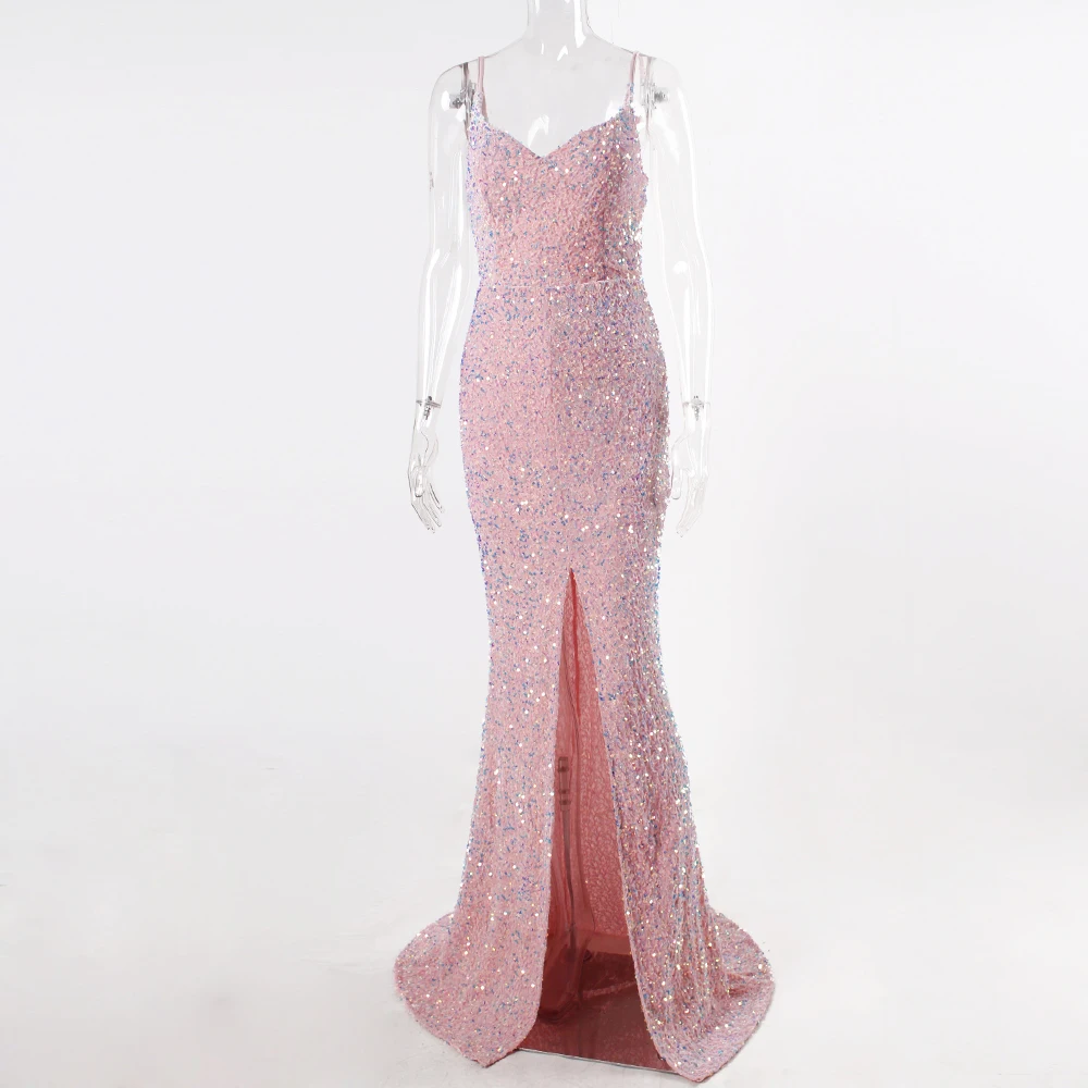 victoria’svogue 2021 V Neck Sleeveless Split Front Pink Sequined Long Evening Party Maxi Dress Padded Stretch Full Length Night Dress Pink