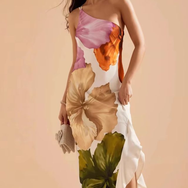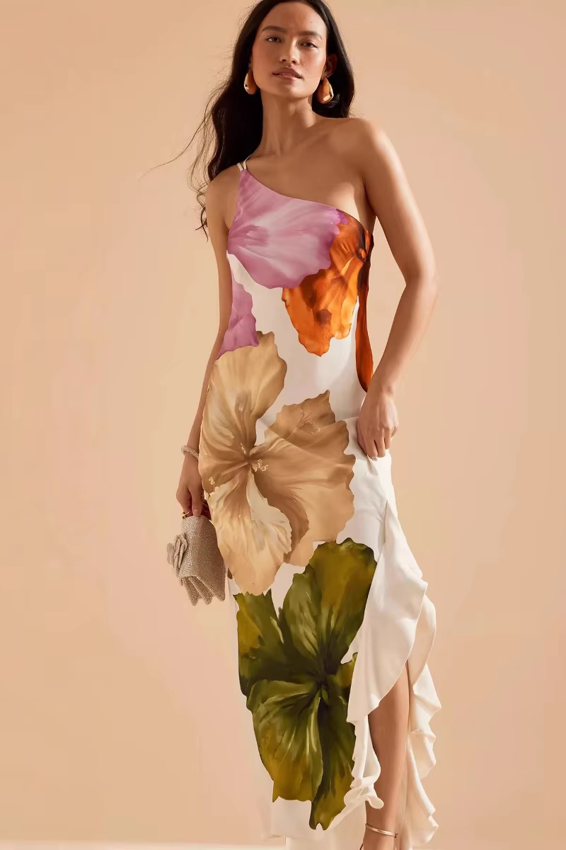 Victoria’s Vogue Fashion Women Printed Curling Edge Long Dresses Irregular One Shoulder Open Fork Gown Women Summer 2025 Party Vestidos