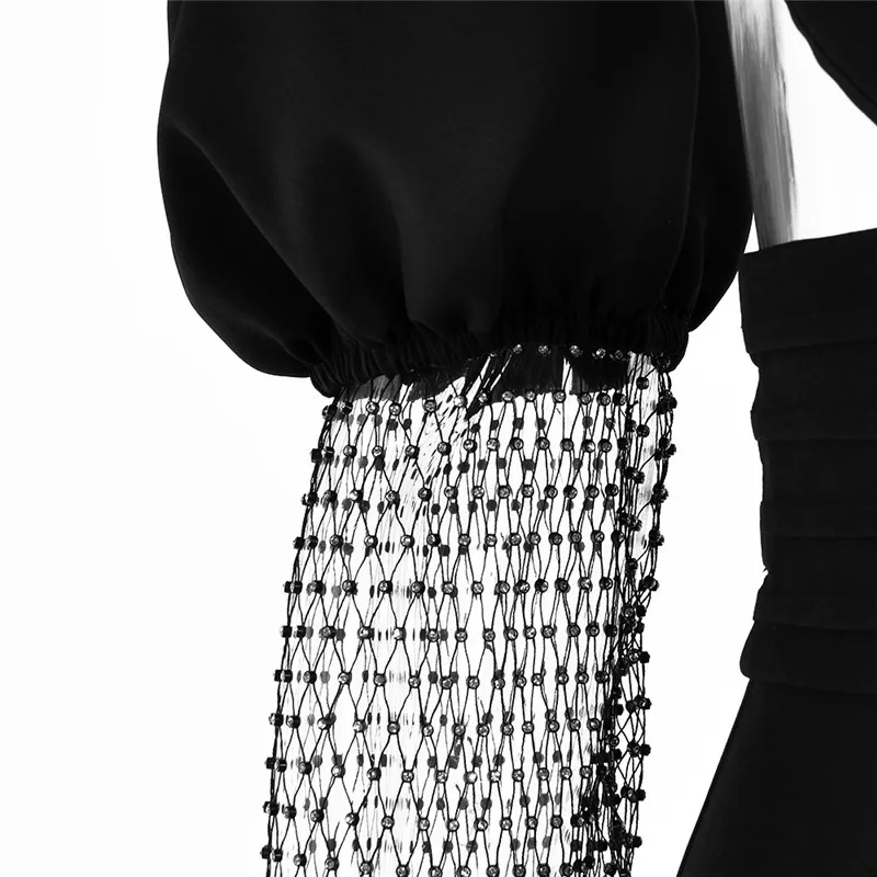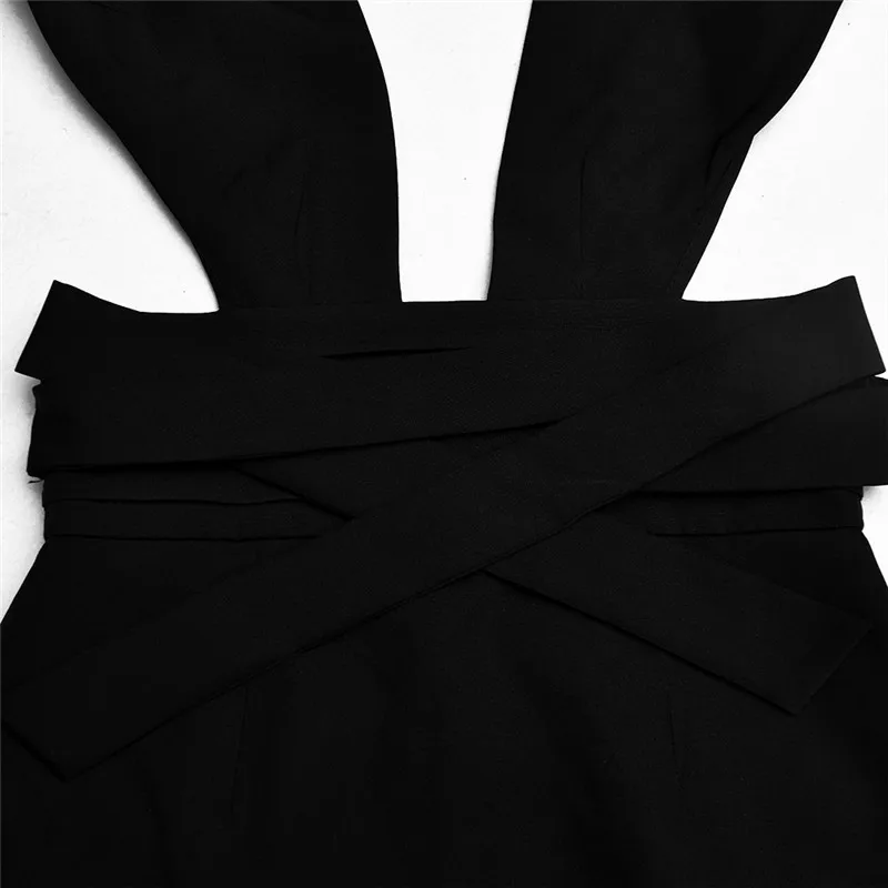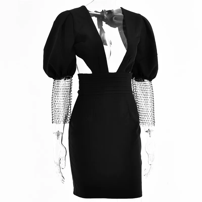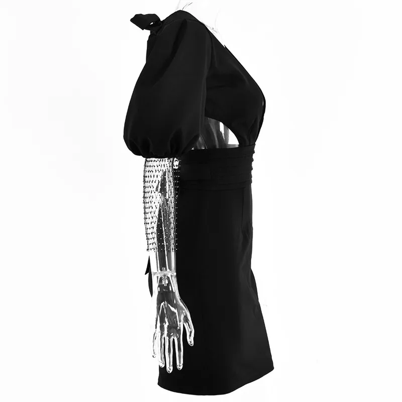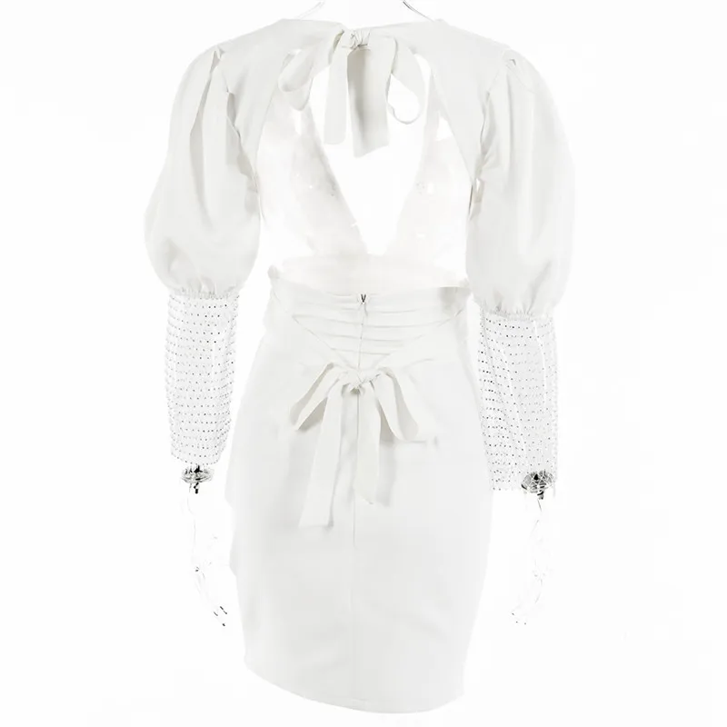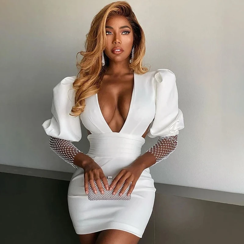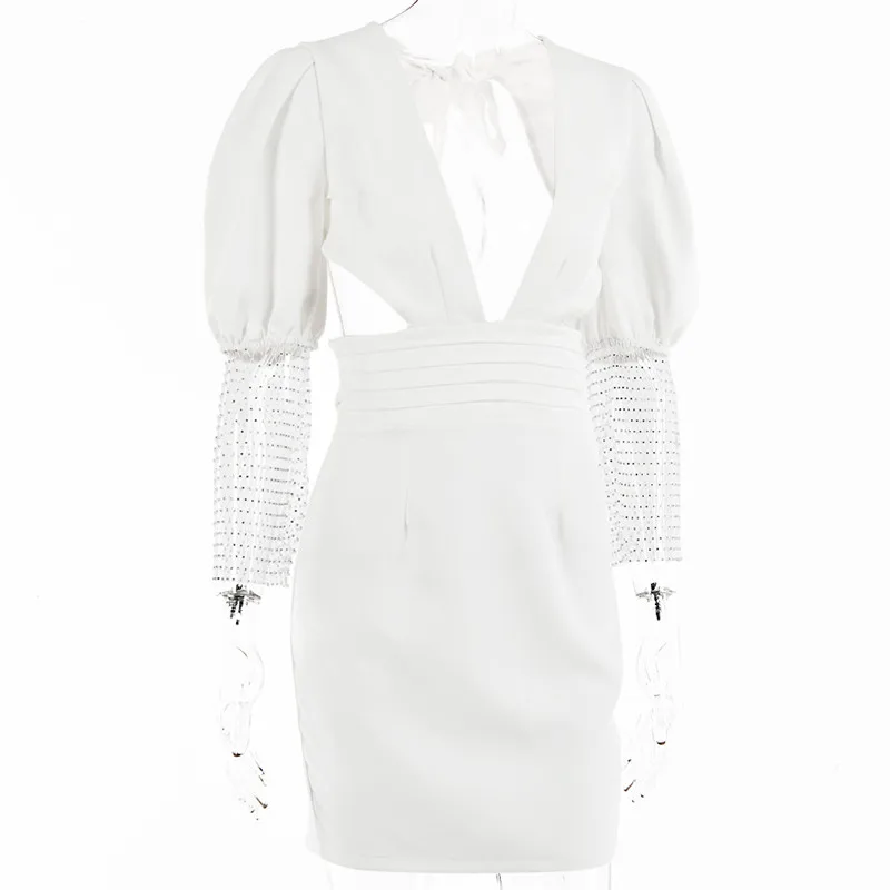 victoira’s vogue Sexy Puff Crystal Diamond Sleeve Bodycon Dress Women Elegant Backless Mini Dress High Street Deep V-neck Vestidos
