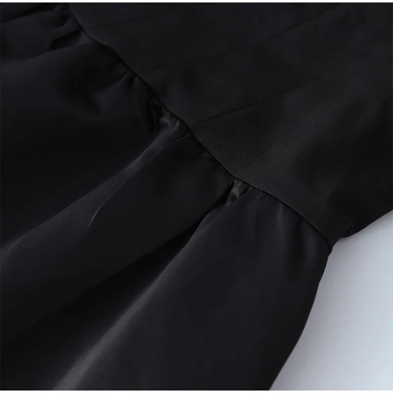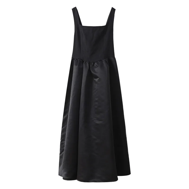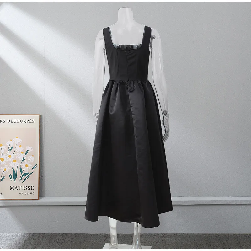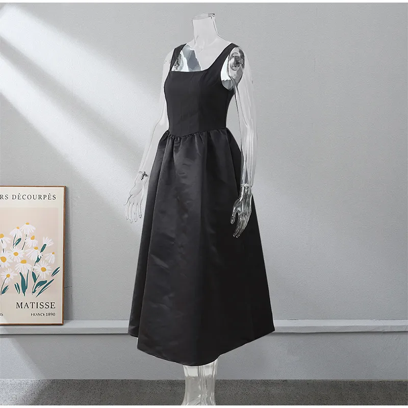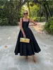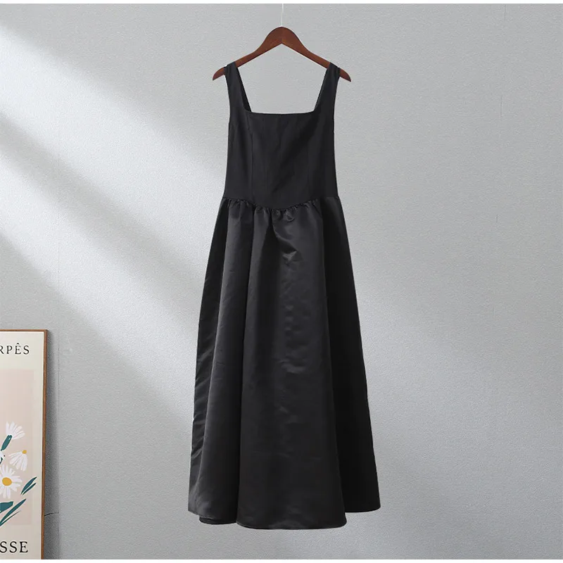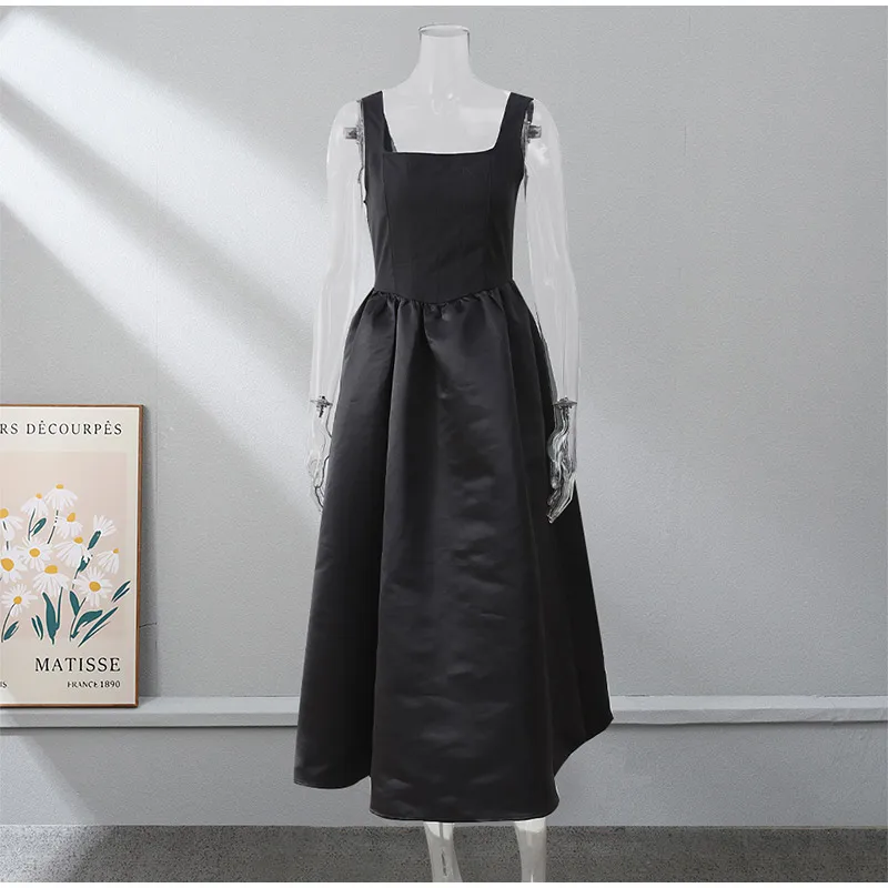 Victoria Vogue Elegant Black Sleeveless Women Sling Maxi Dress Fashion Square Neck Pleated Hem A-line Dresses Summer Lady Chic High Street Robe