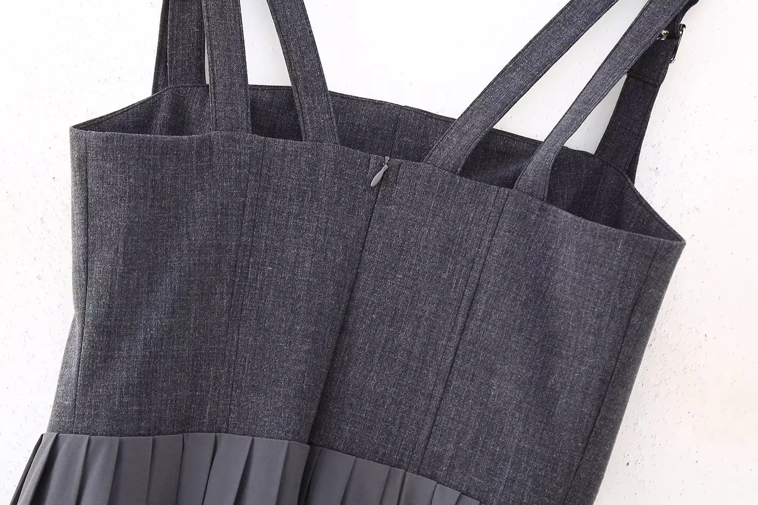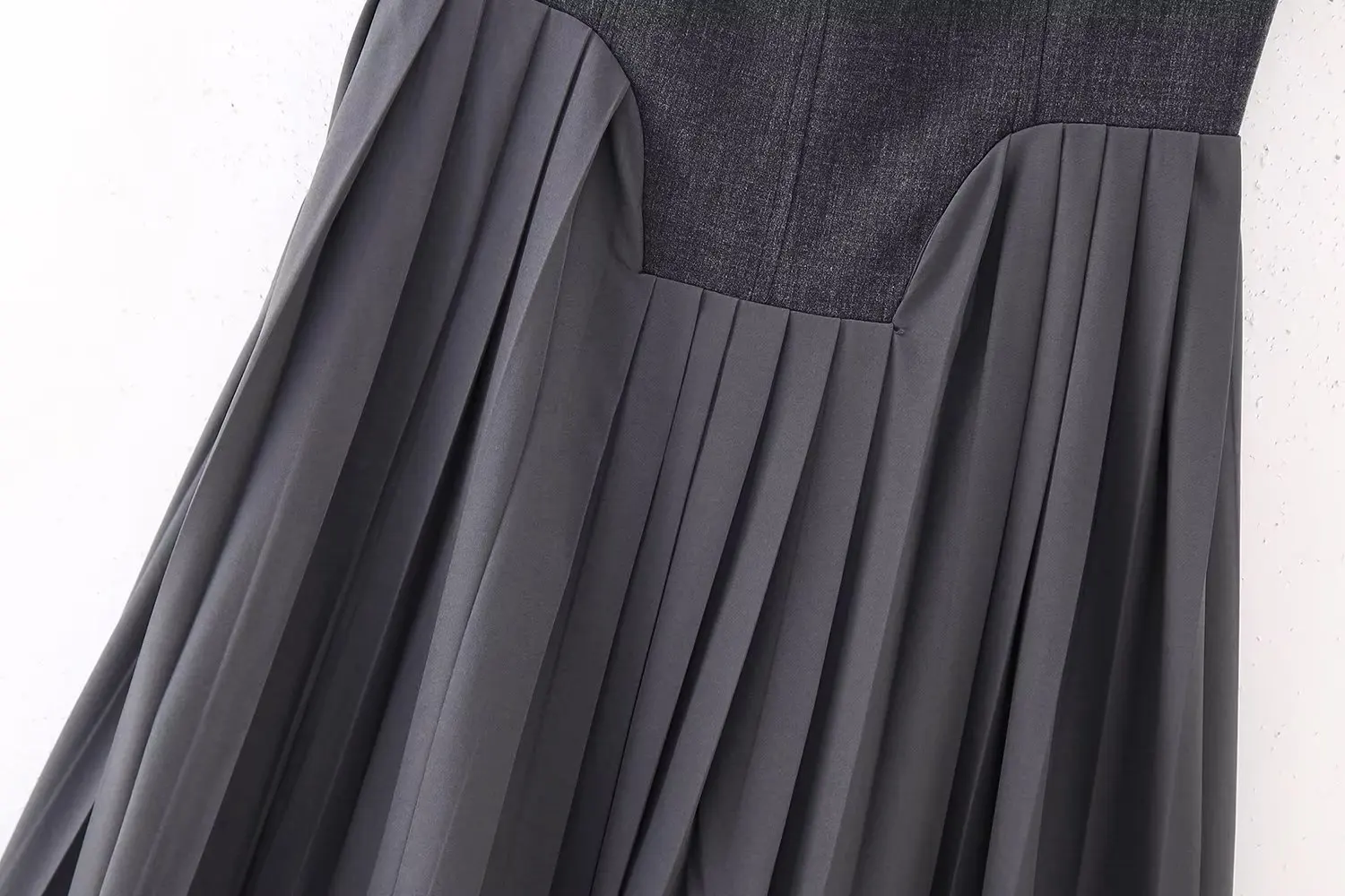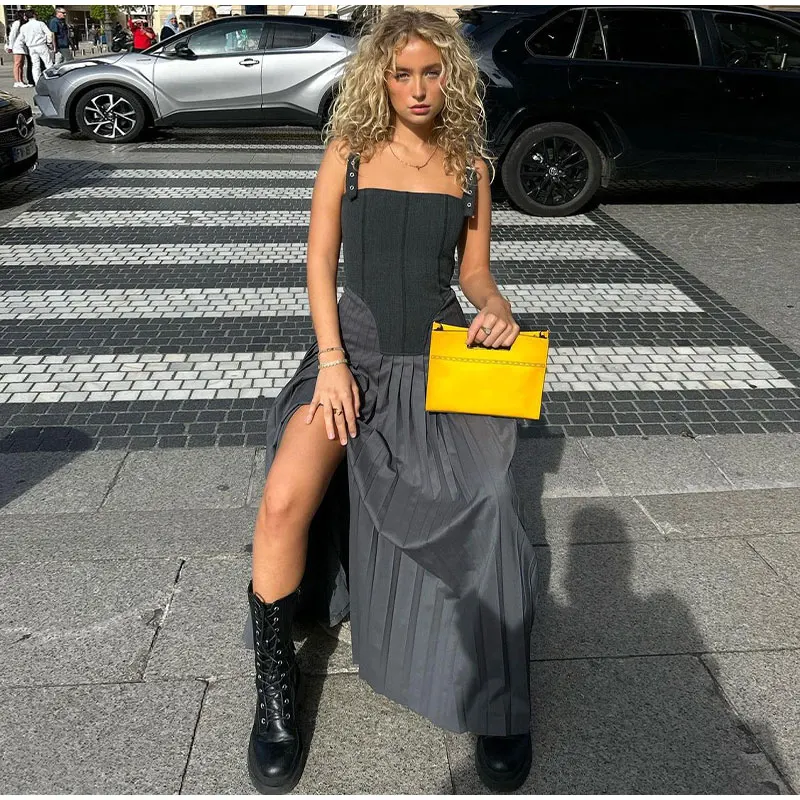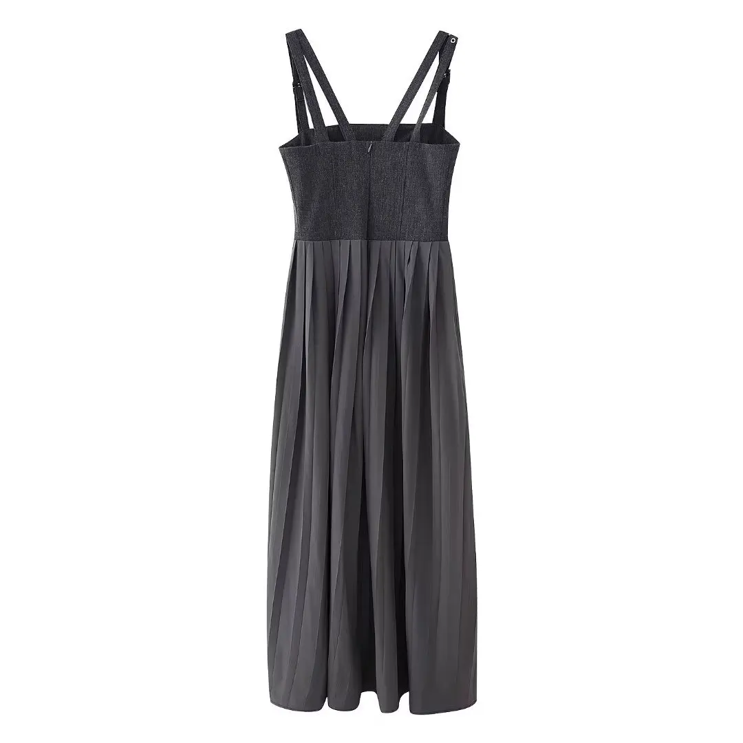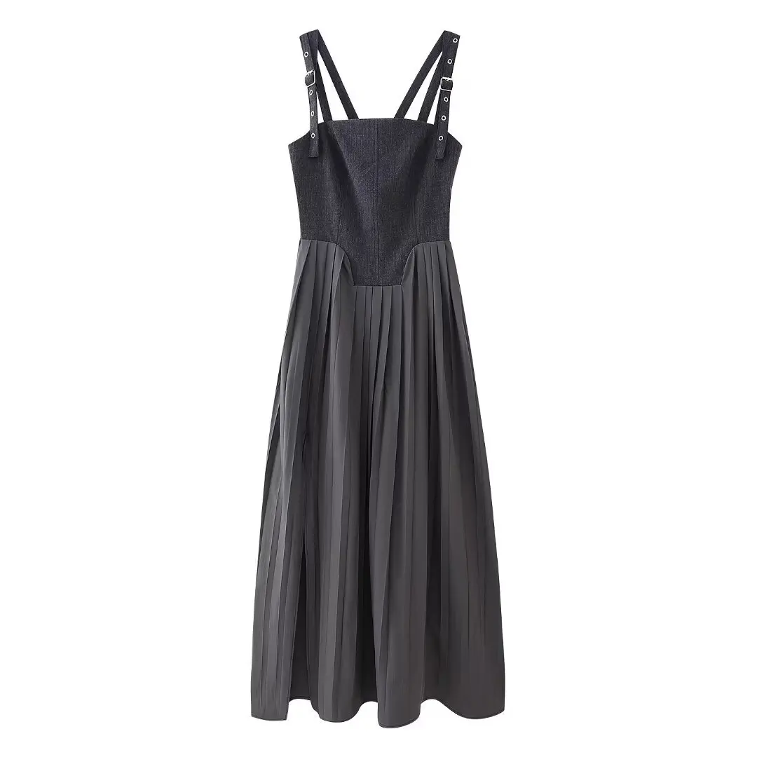 Victoria Vogue Female Sexy Grey Patchwork Spaghetti Strap Dress Fashion Sleeveless Pleated A Line Dresses 2023 Autumn Lady High Street Vestidos