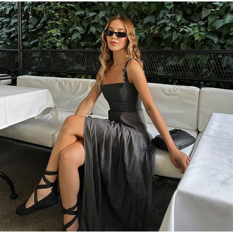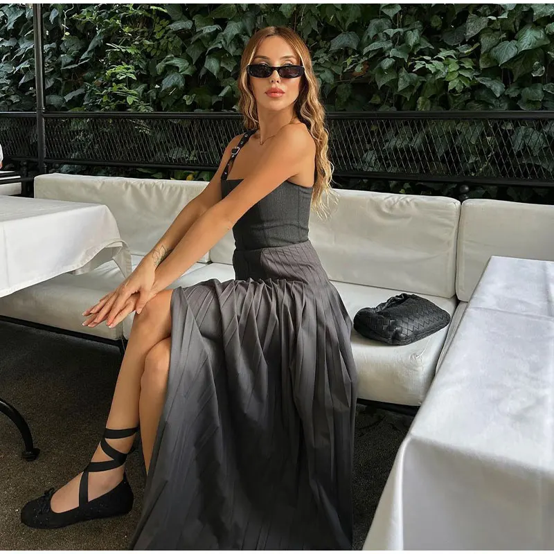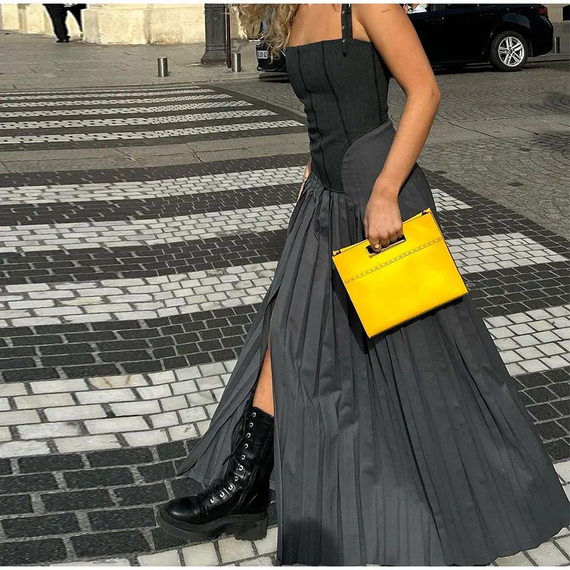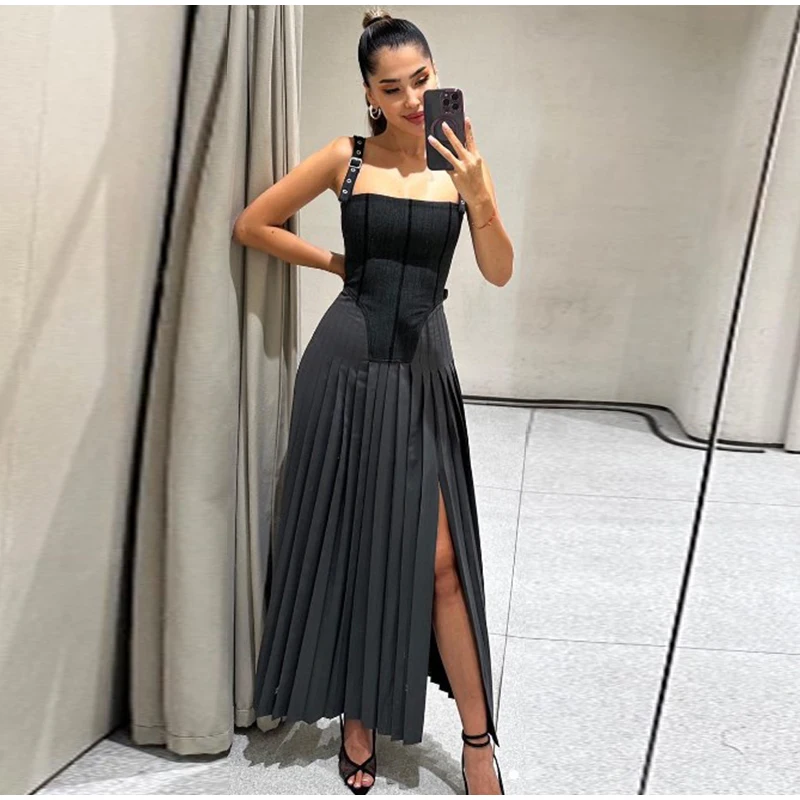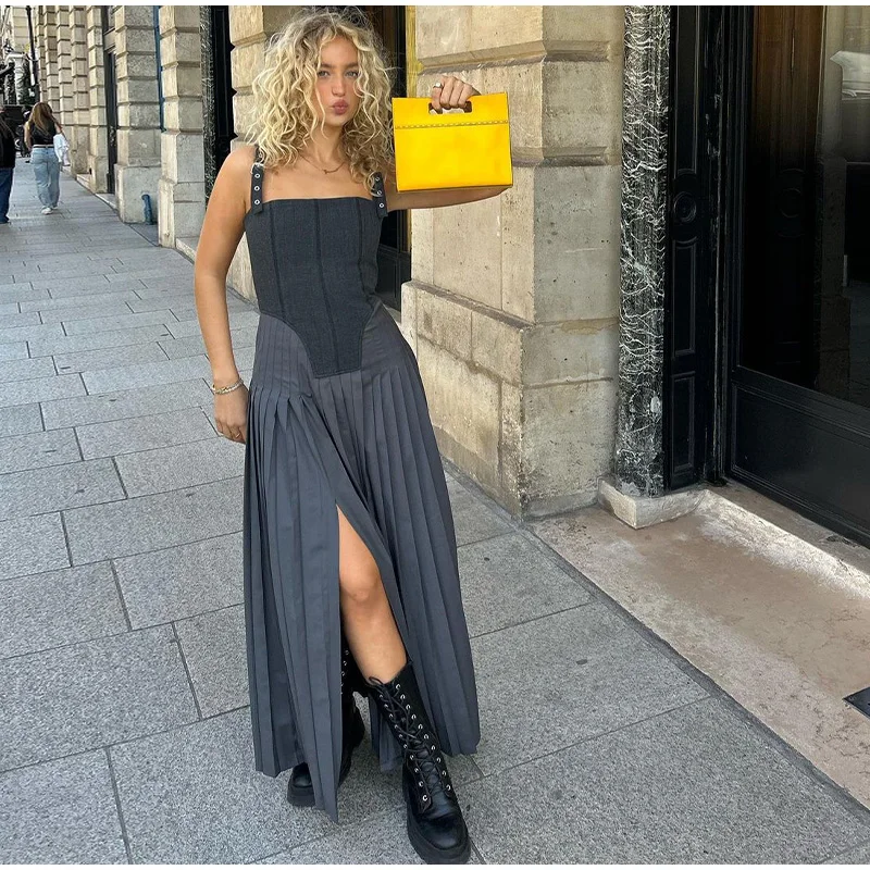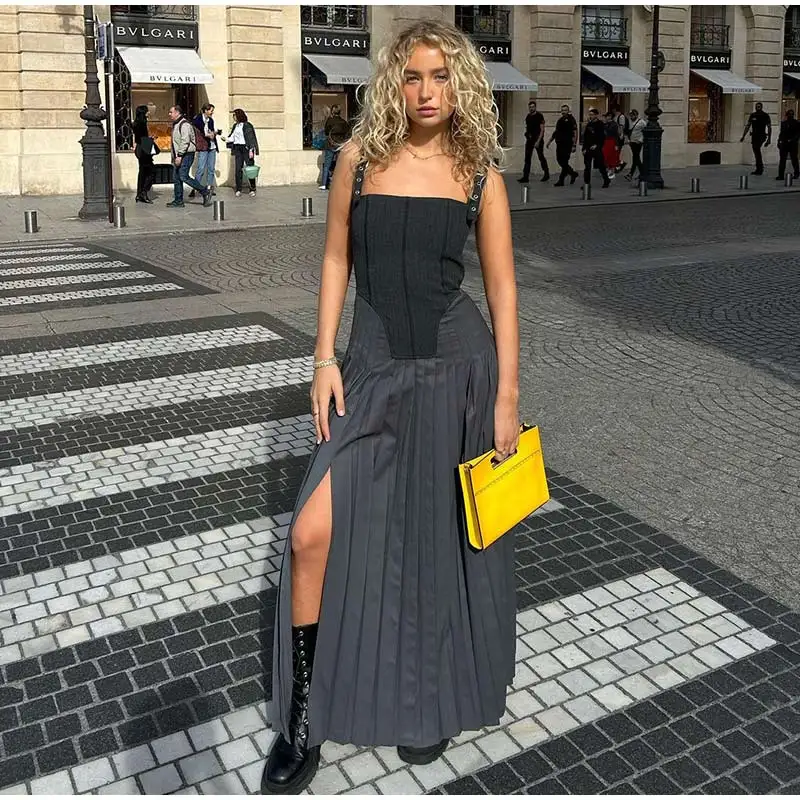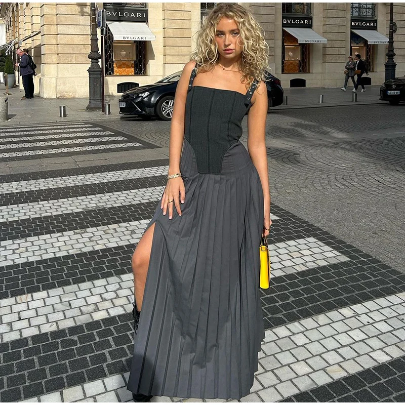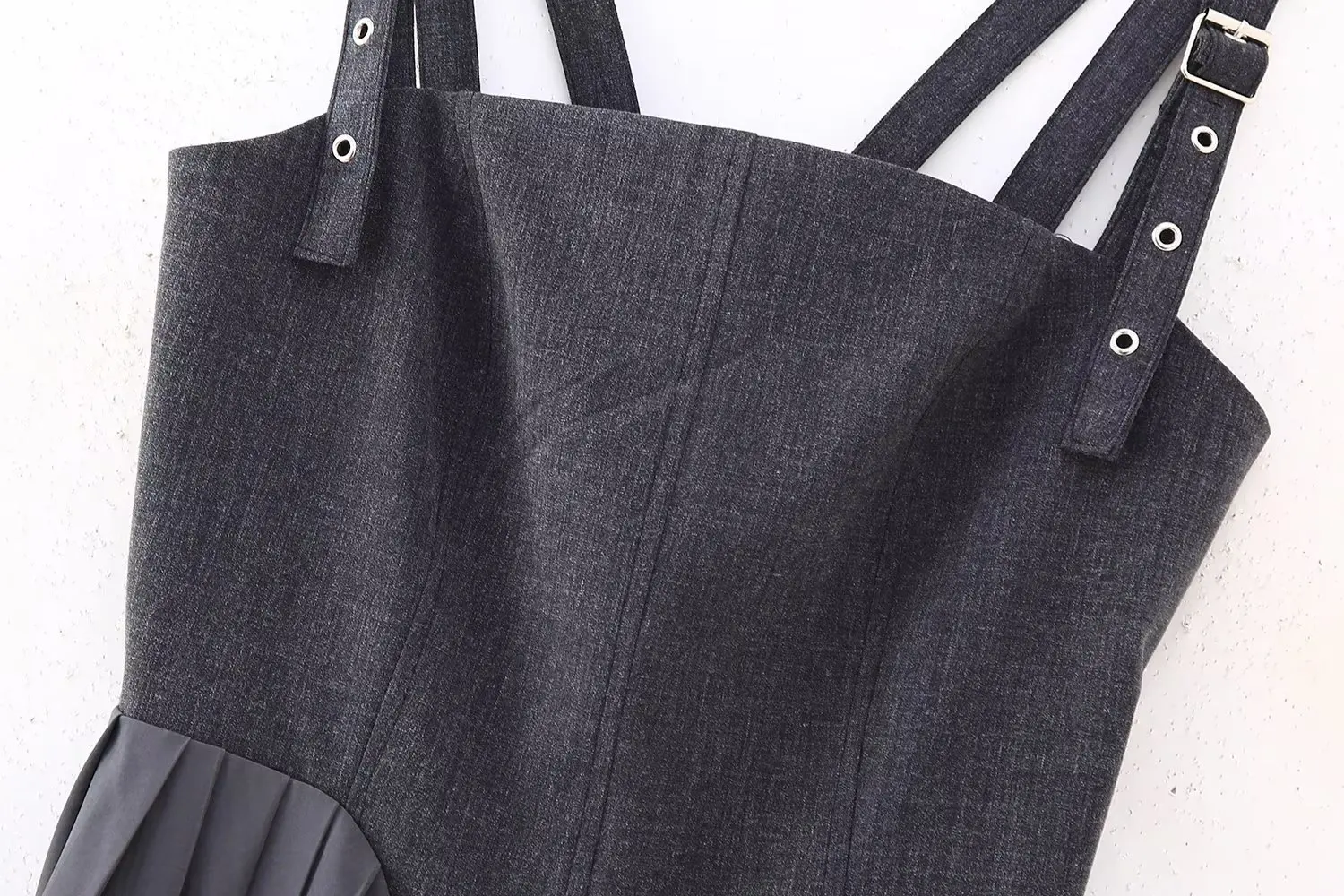 Victoria Vogue Female Sexy Grey Patchwork Spaghetti Strap Dress Fashion Sleeveless Pleated A Line Dresses 2023 Autumn Lady High Street Vestidos