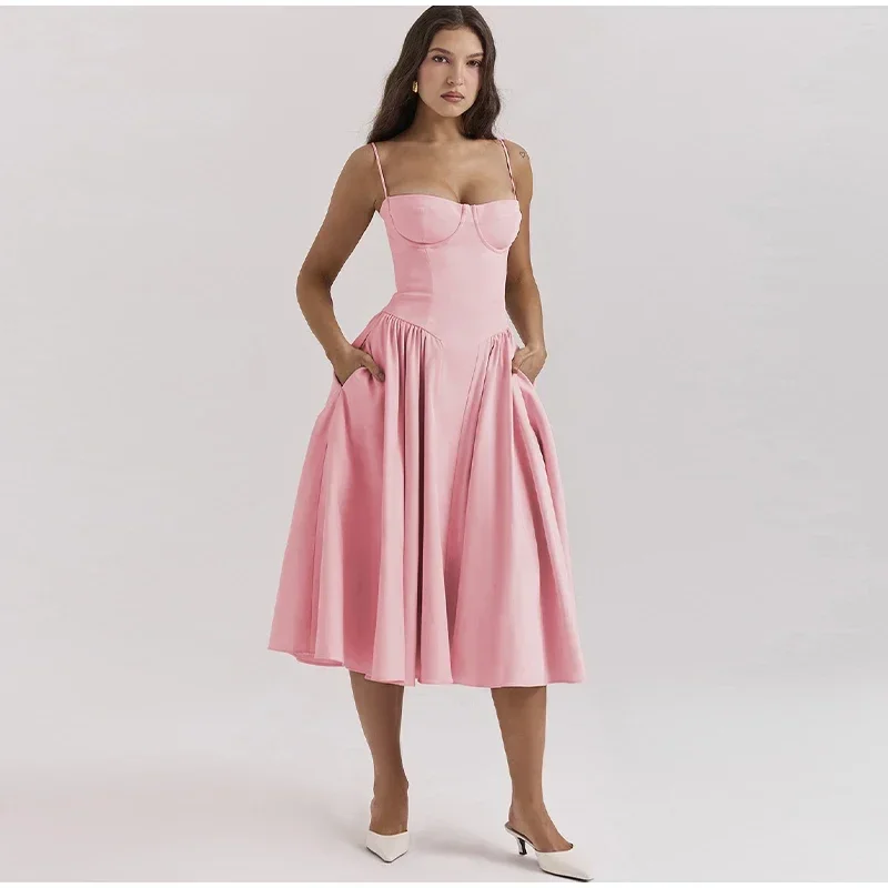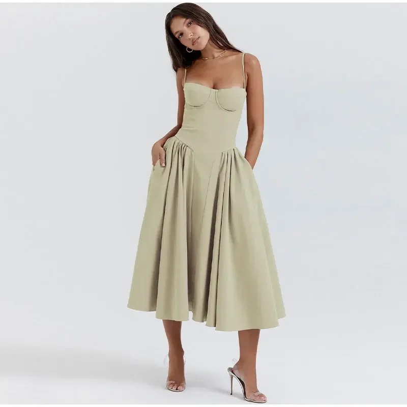 Victoria Vogue Summer Women Elegant Sleeveless Backless Pleated Dresses Lady Sexy Solid Sling Midi Dress 2024 Female Party Evening A-line Robes