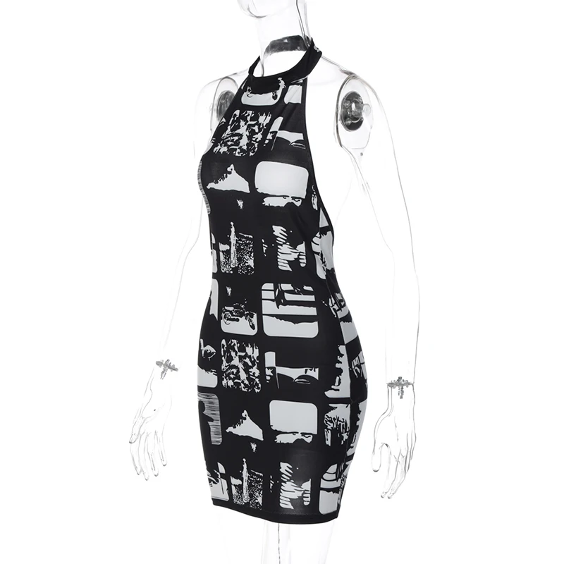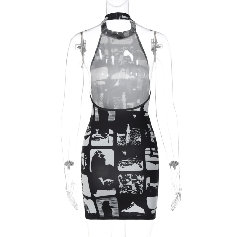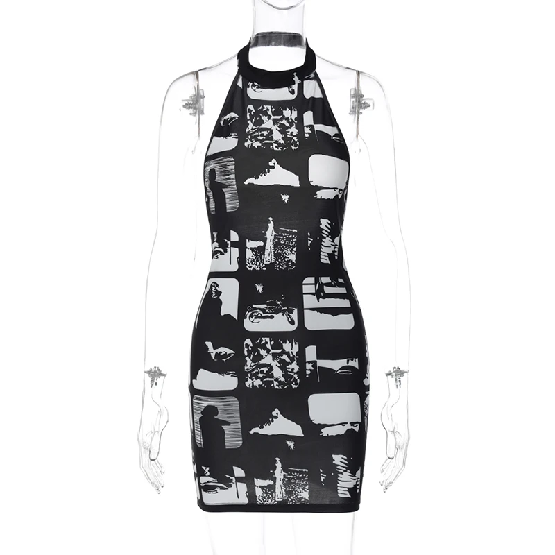 Victoria Vogue Vintage Print Halter Sleeveless Backless Sexy Slim Bodycon Mini Dress 2023 Summer Y2K Outfit Streetwear Nightclub Biker