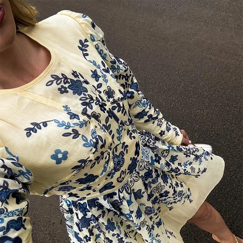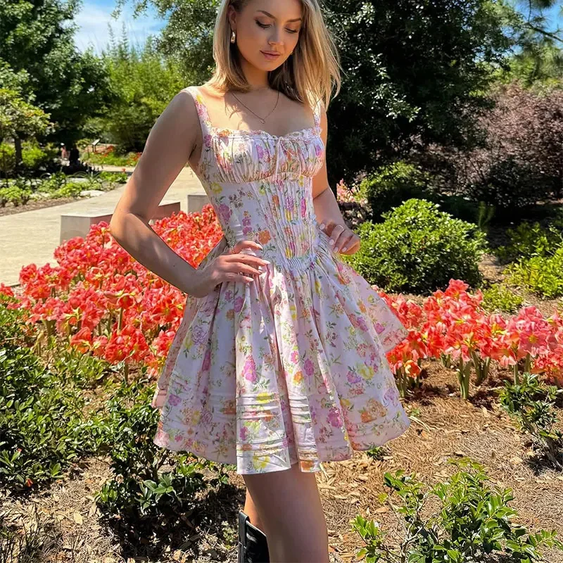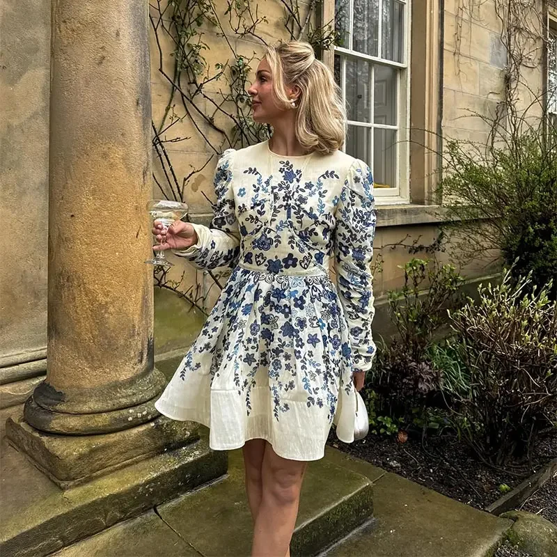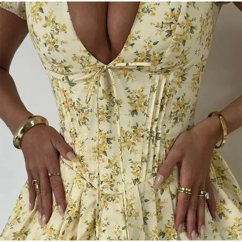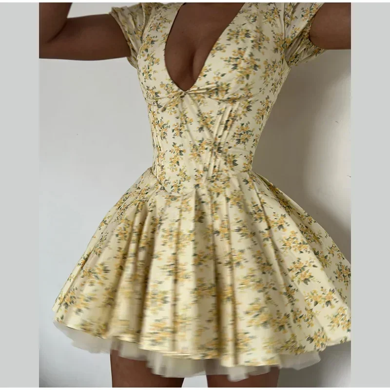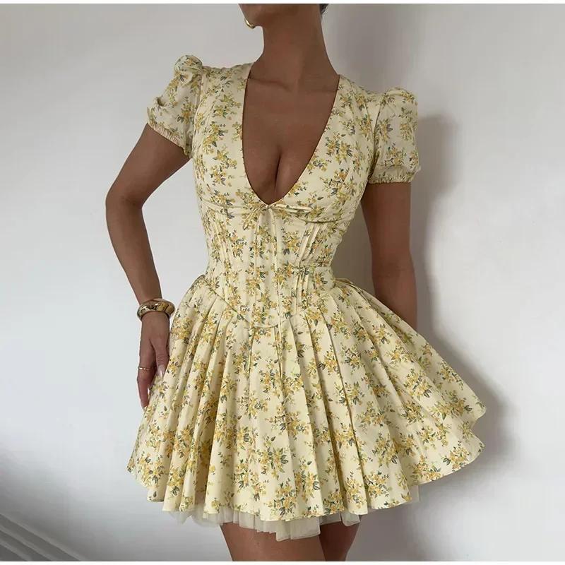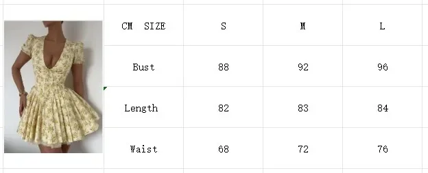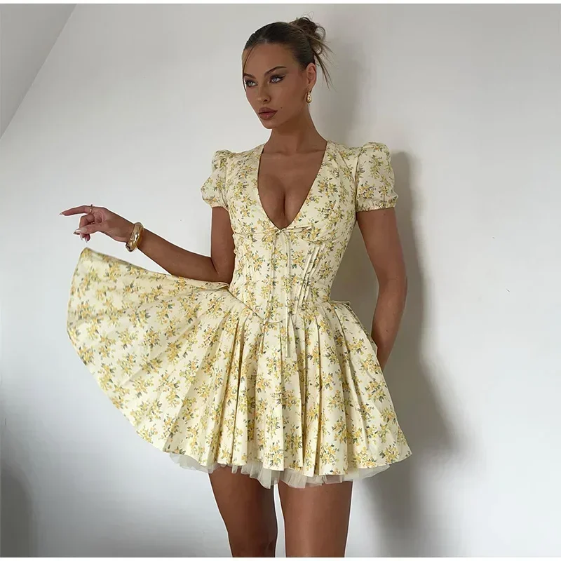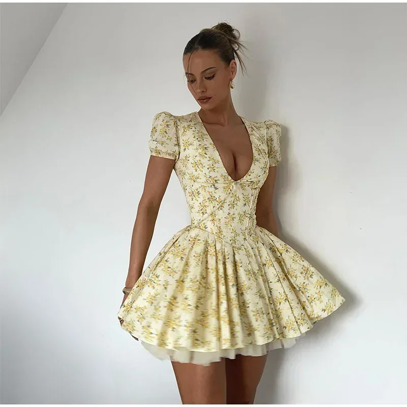 Victoria Vogue Women Fashion Short Puff Sleeve Pleated Dresses Elegant Print Deep V Neck A-line Mini Dress 2024 Chic Lady Party Beach Vestidos