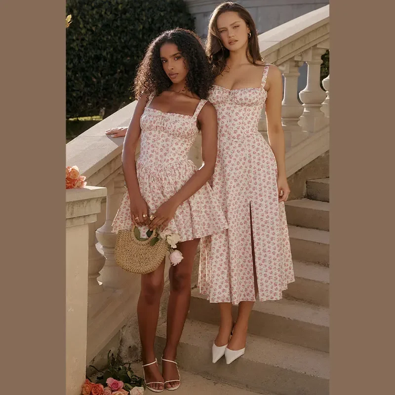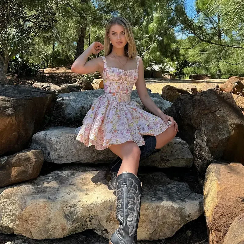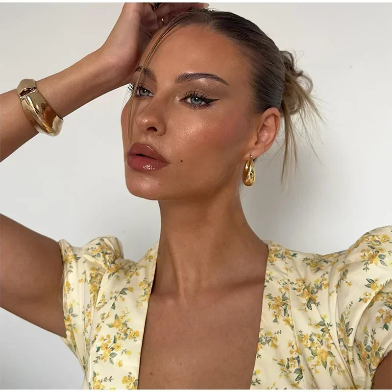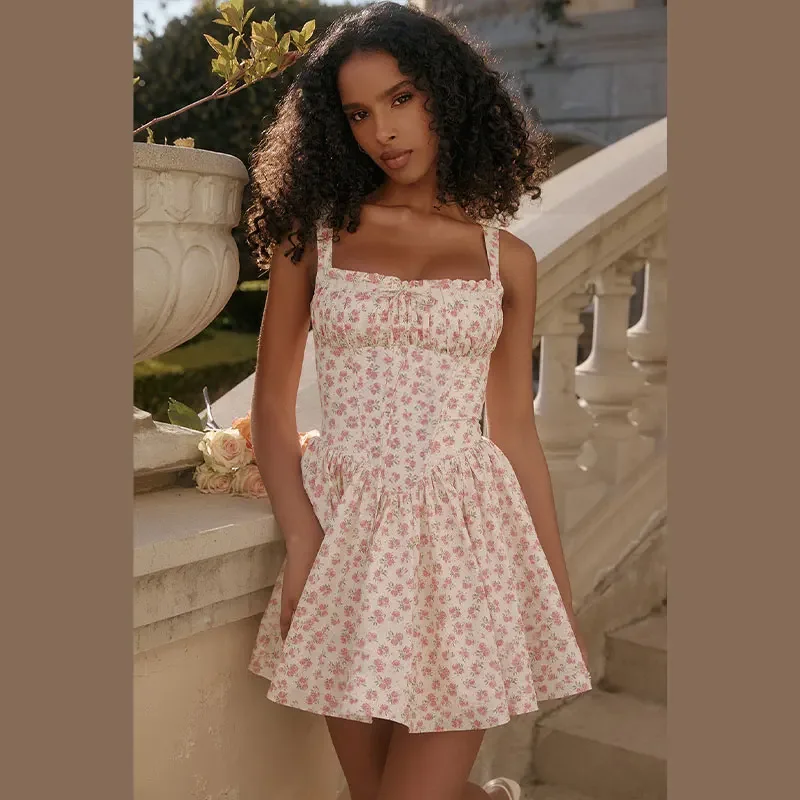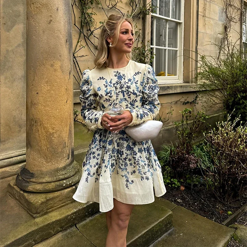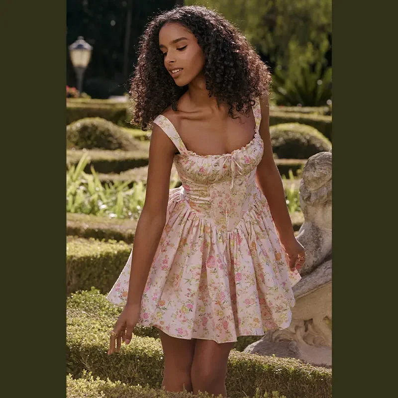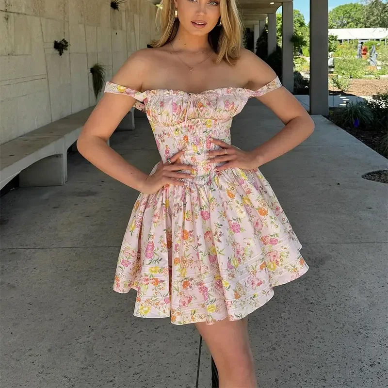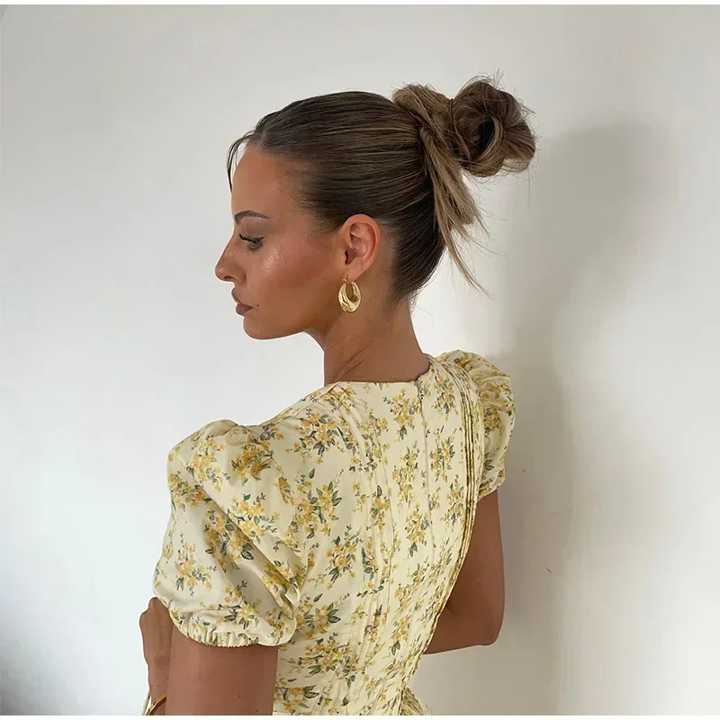Victoria Vogue Women Fashion Short Puff Sleeve Pleated Dresses Elegant Print Deep V Neck A-line Mini Dress 2024 Chic Lady Party Beach Vestidos