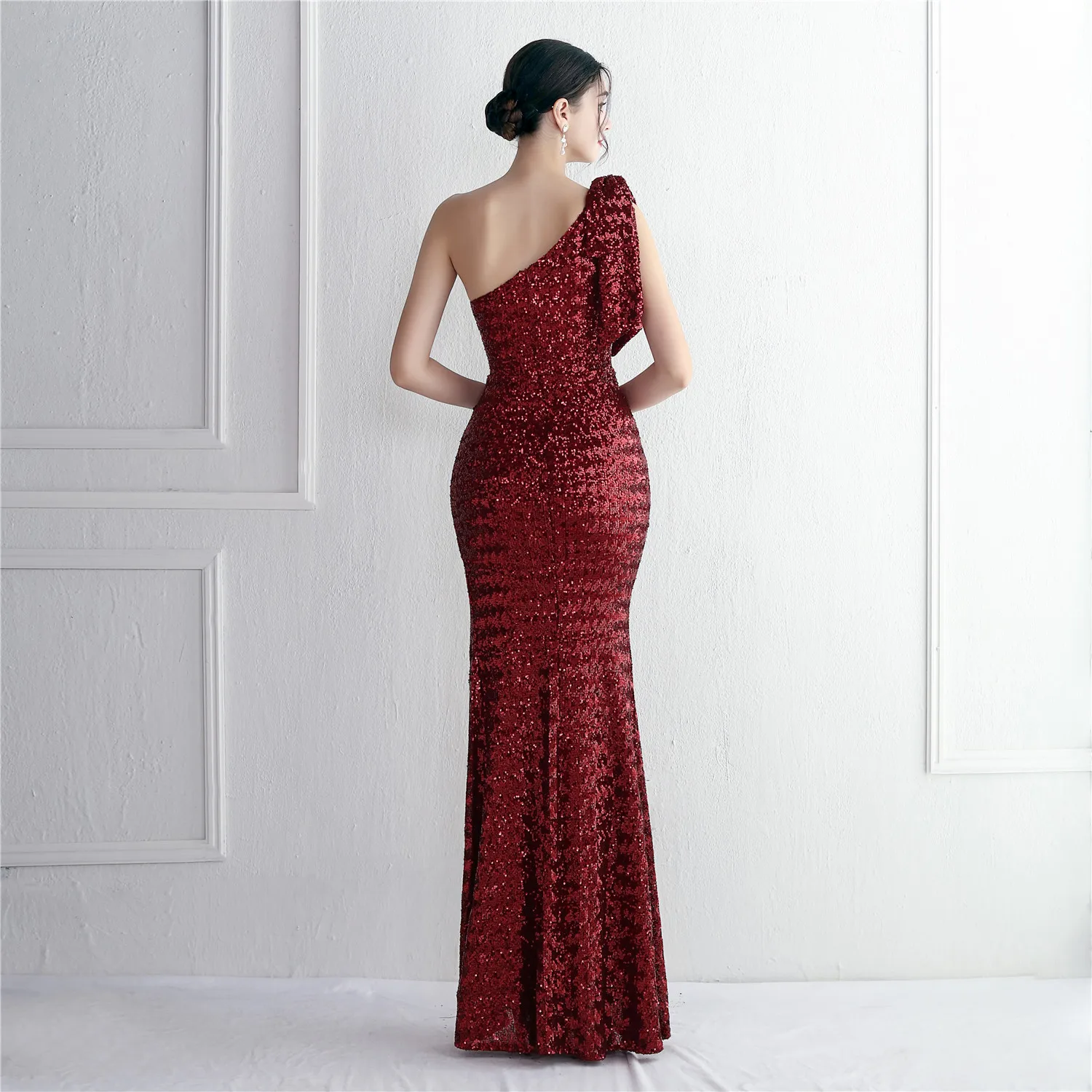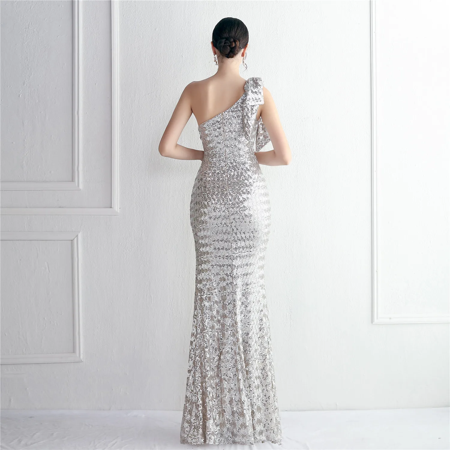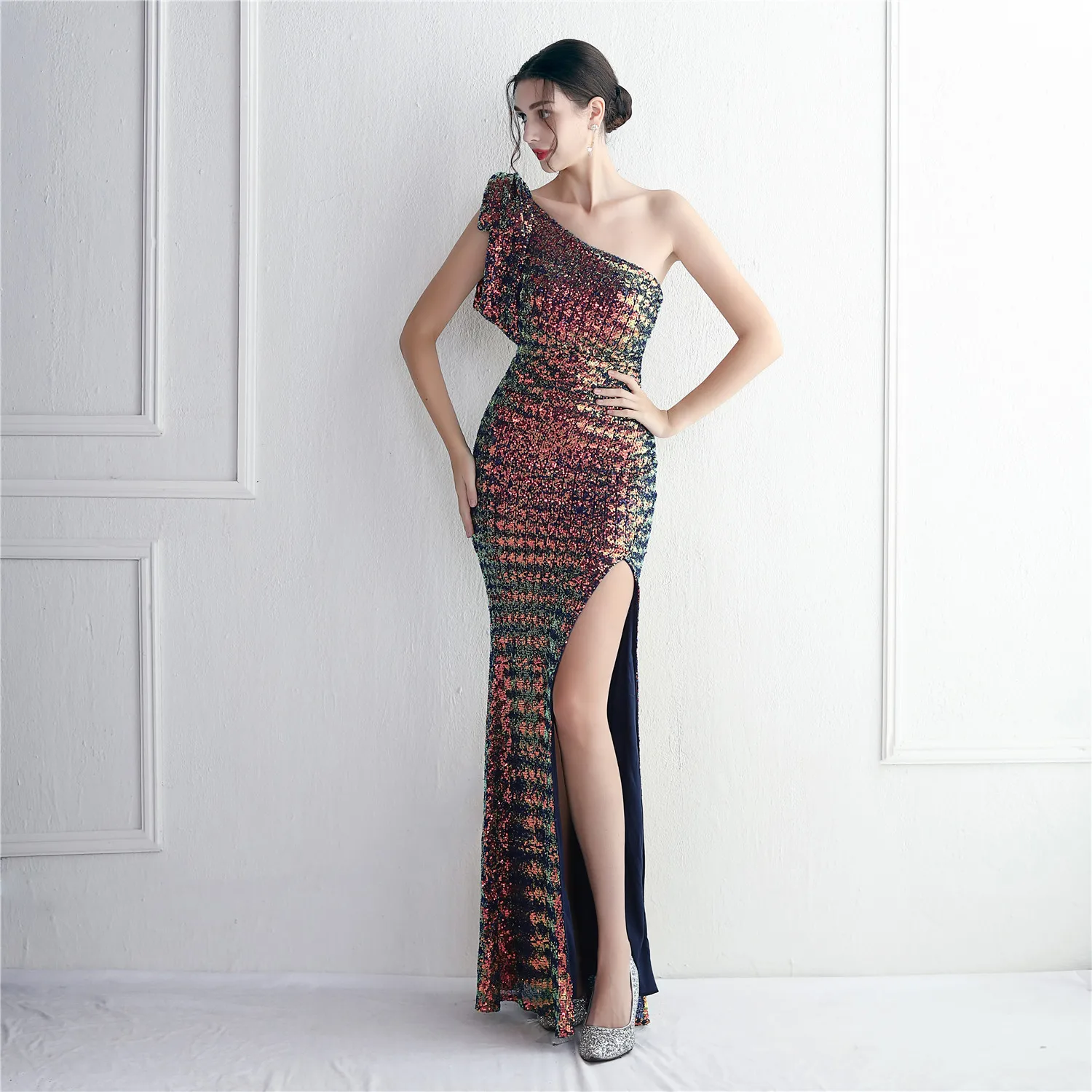 Victoria Vogue Women One Shoulder Slit Sequin Evening Dress Gold Ruffles Celebrity Maxi Dress Sexy Slash Neck Long Party Dress