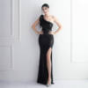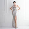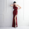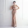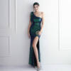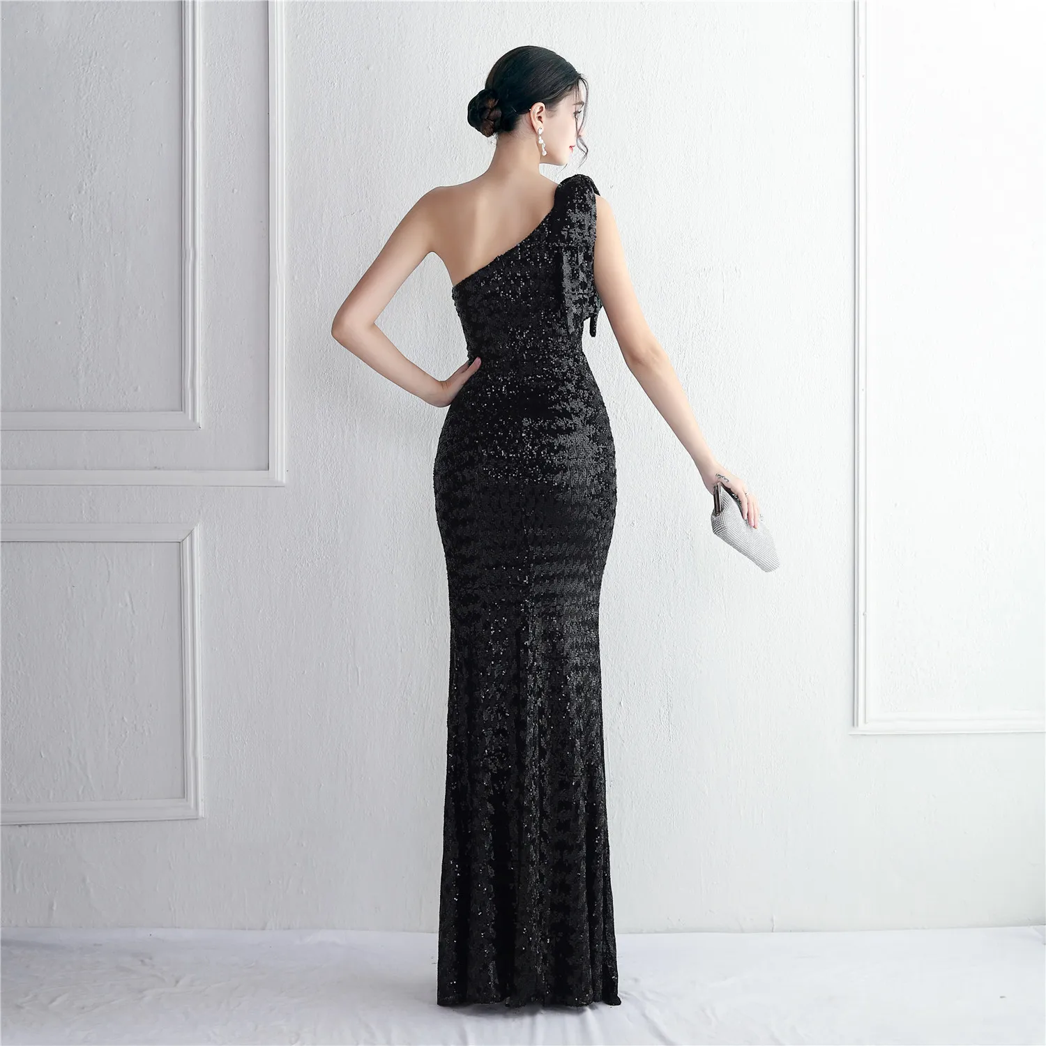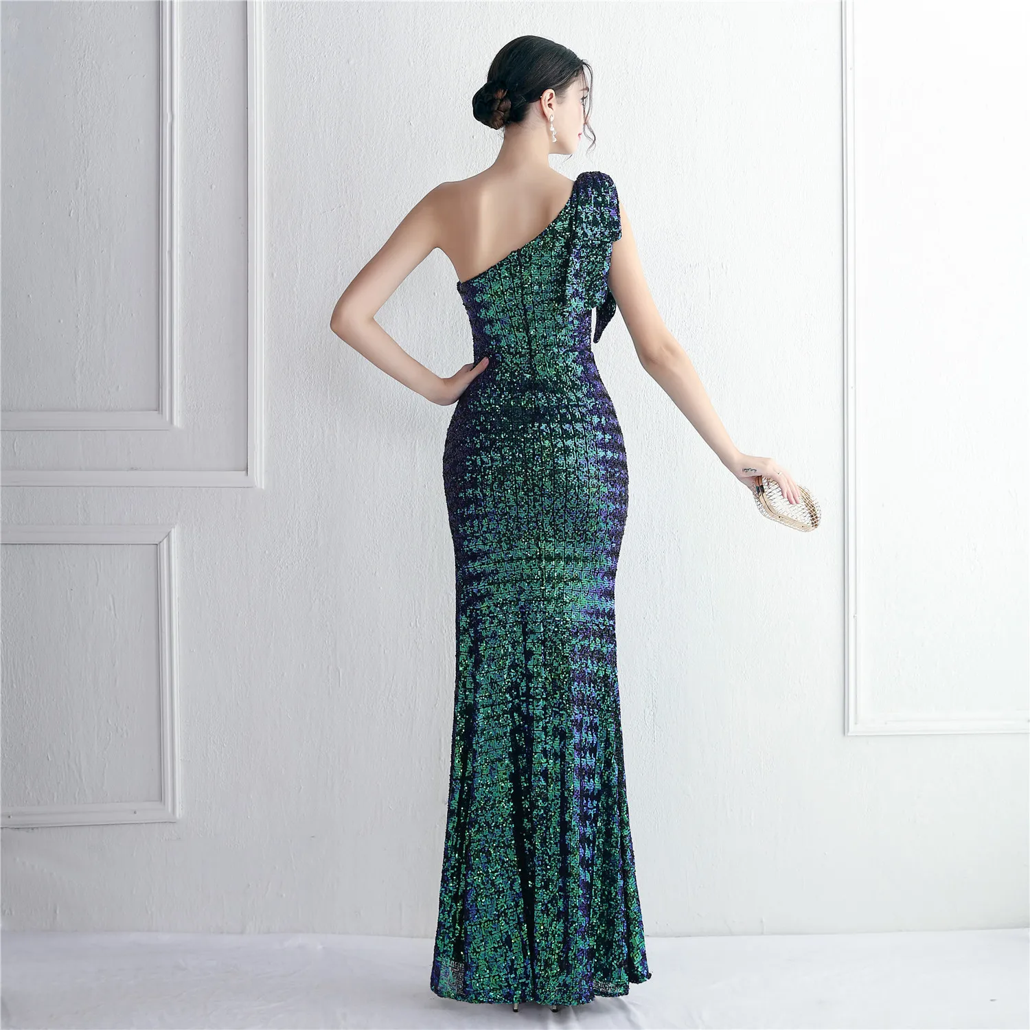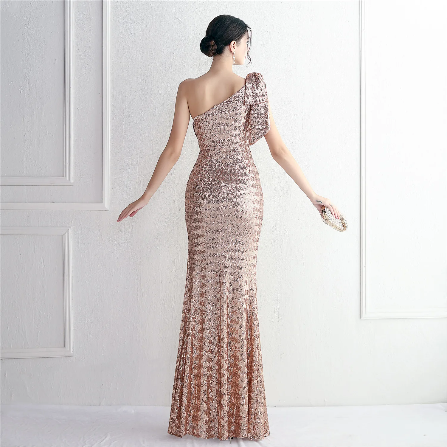 Victoria Vogue Women One Shoulder Slit Sequin Evening Dress Gold Ruffles Celebrity Maxi Dress Sexy Slash Neck Long Party Dress