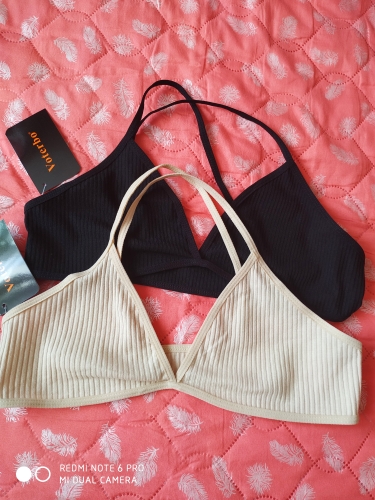 Топы как на фото, приятные хлопковые. Единственный минус - бретельки не регулируются. Мне коротковаты. Лучше брать на размер, а то и два побольше. Доставка быстрая.