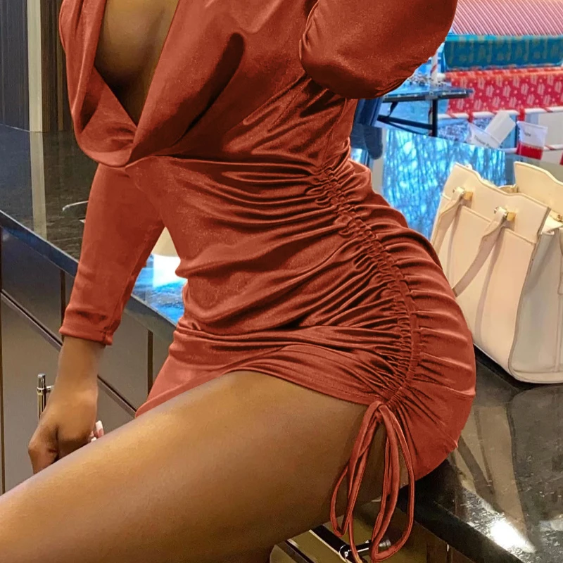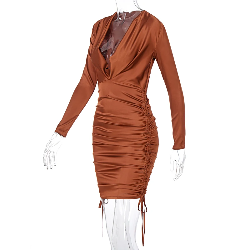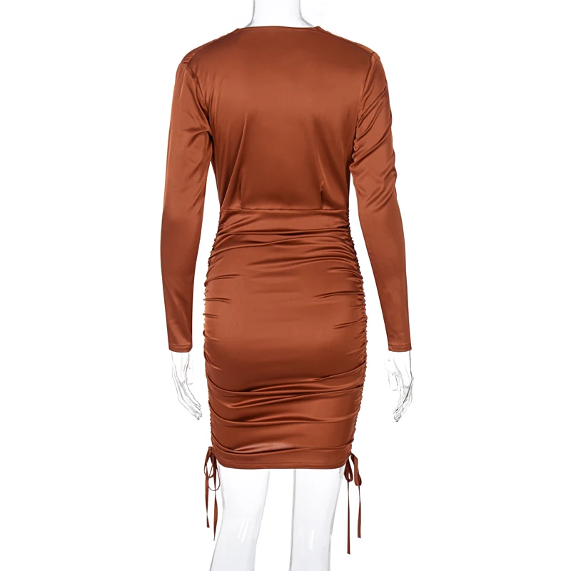 victoria’s vogue 2020 Long Sleeve Solid Satin Deep V-Neck Ruched Bandage Mini Dress Autumn Winter Women Fashion Sexy Elegant Partywear