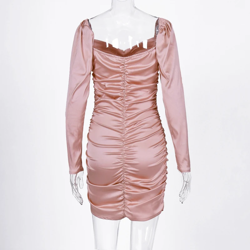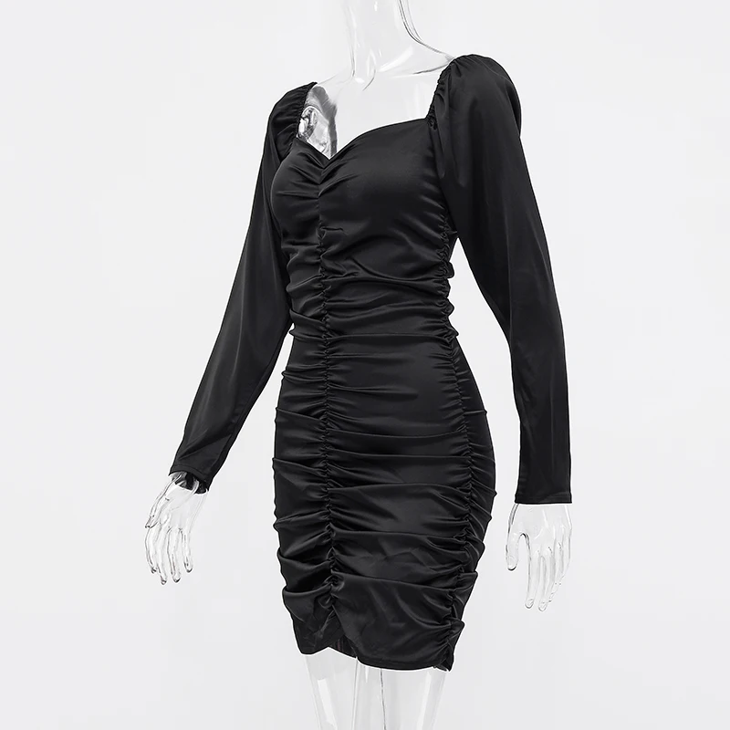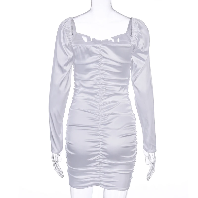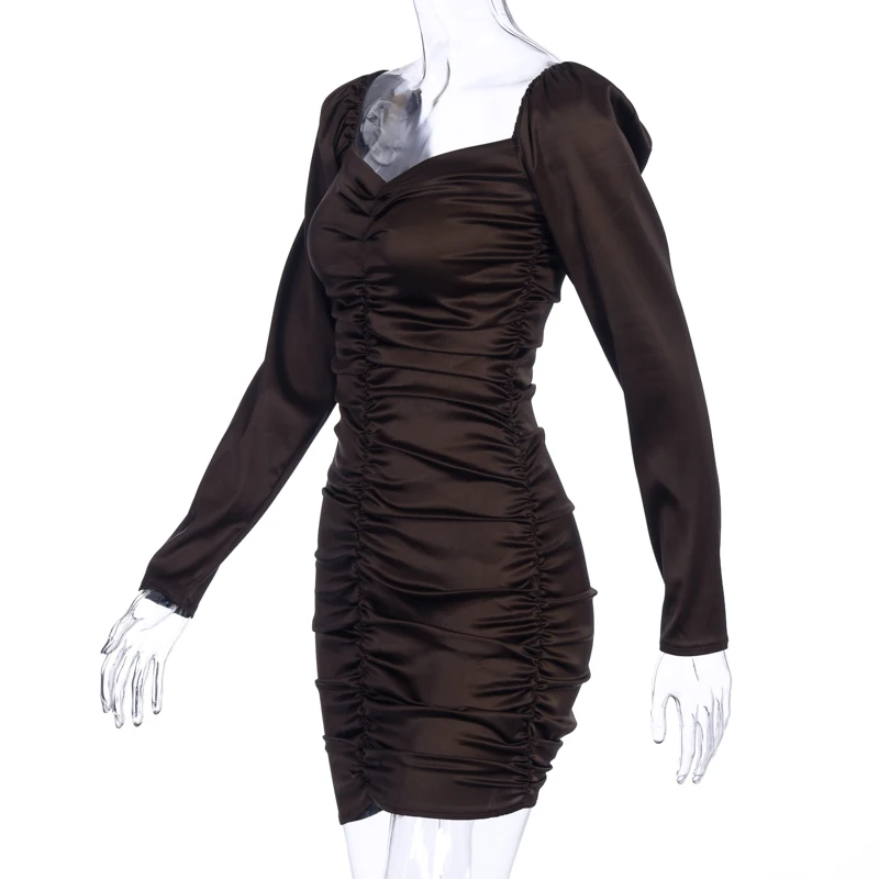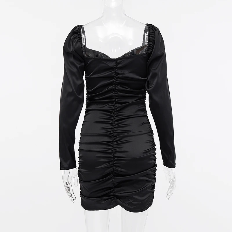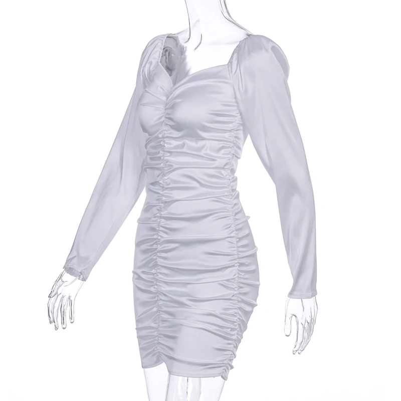 victoria’s vogue 2021 Long Puff Sleeve Slash Neck Satin Pleated Sexy Mini Dress Autumn Winter Women Solid Party Elegant Streetwear Outfi