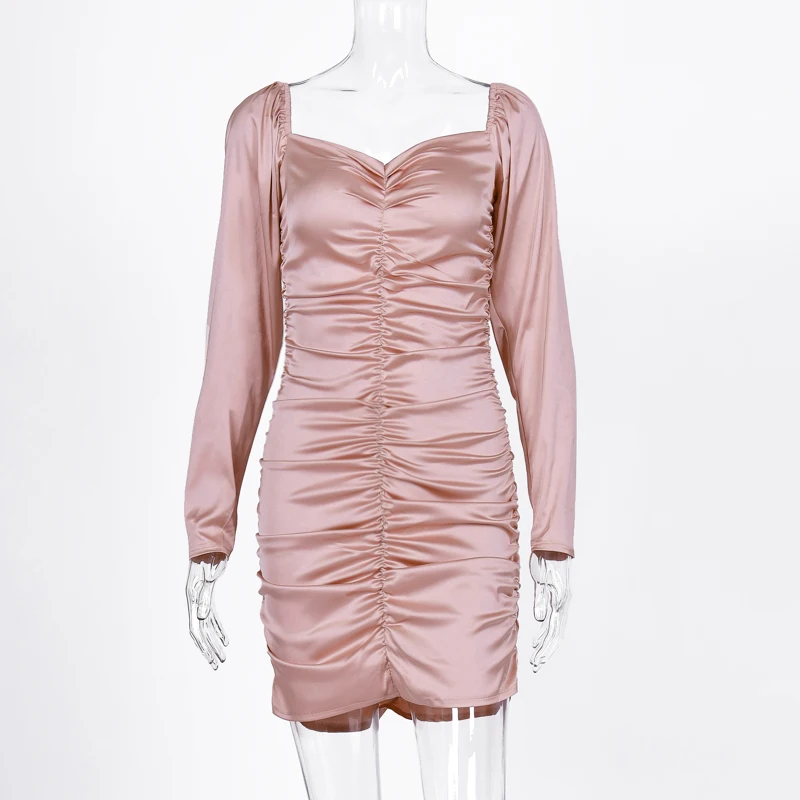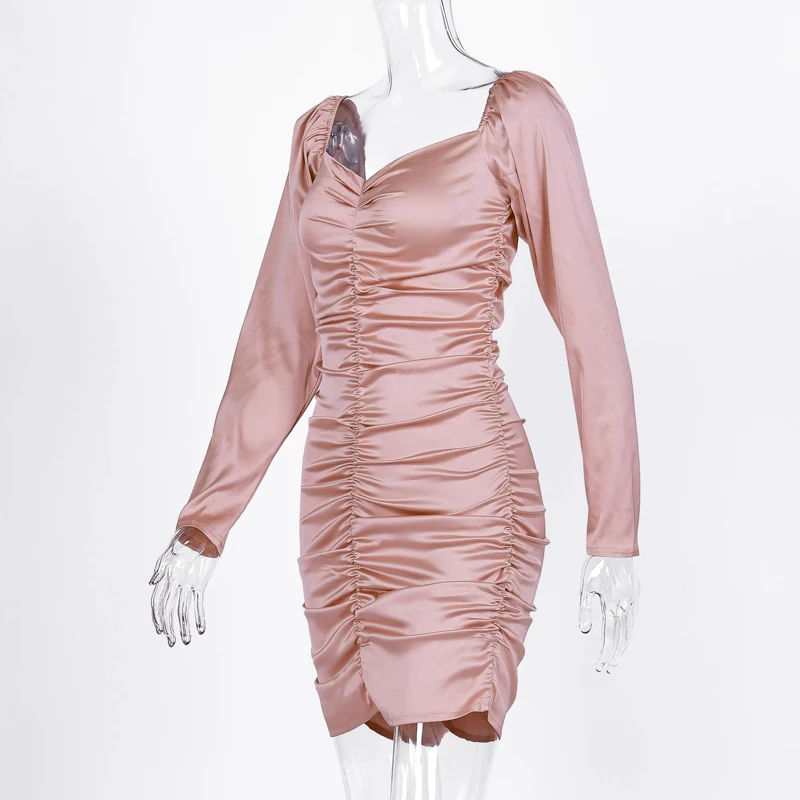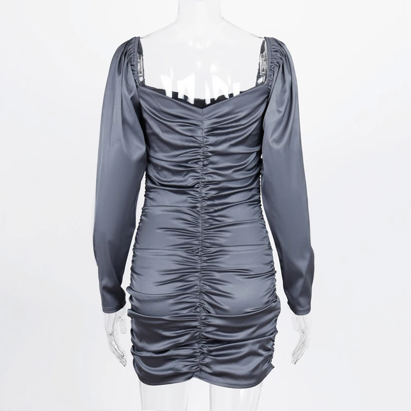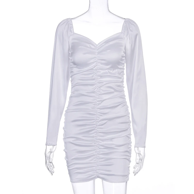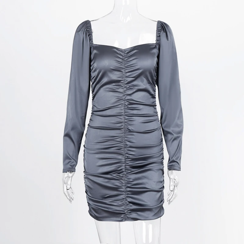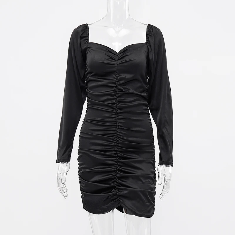 victoria’s vogue 2021 Long Puff Sleeve Slash Neck Satin Pleated Sexy Mini Dress Autumn Winter Women Solid Party Elegant Streetwear Outfi