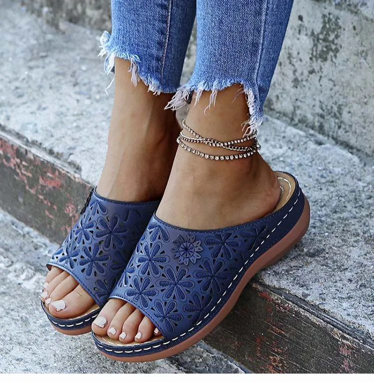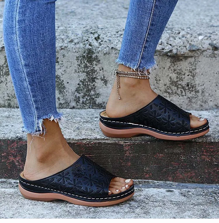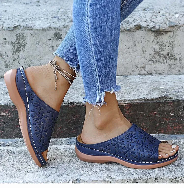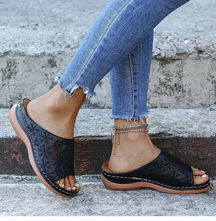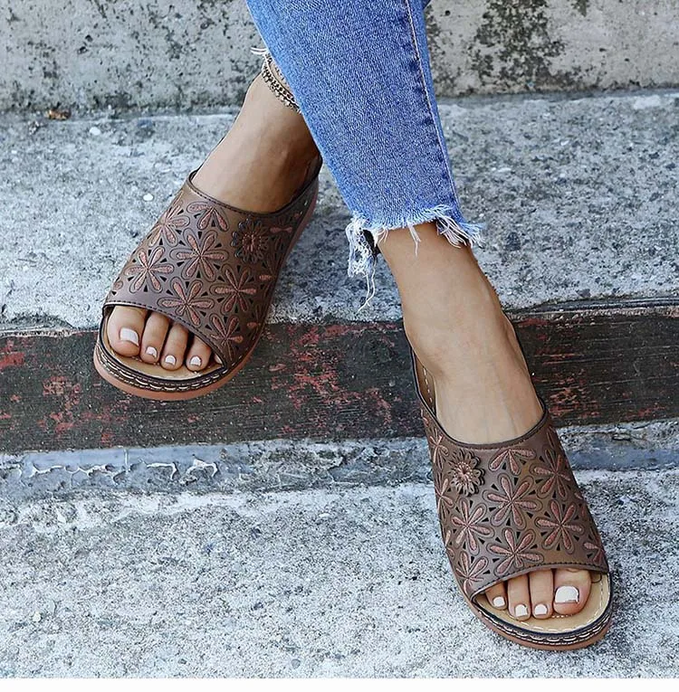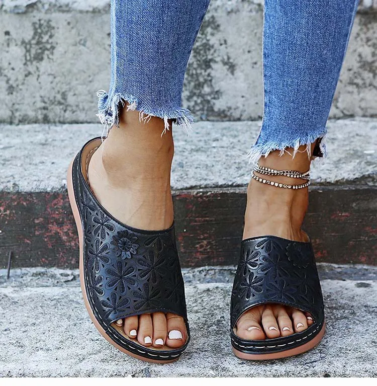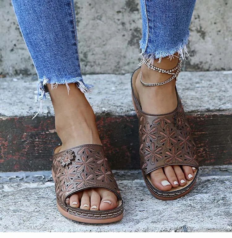 Victoria’s Vogue 2021 Women Sandal Leather Low Heels Woman Wedge Beach Shoes Flower Retro Platform Sandals Ladies Party Shoes Female